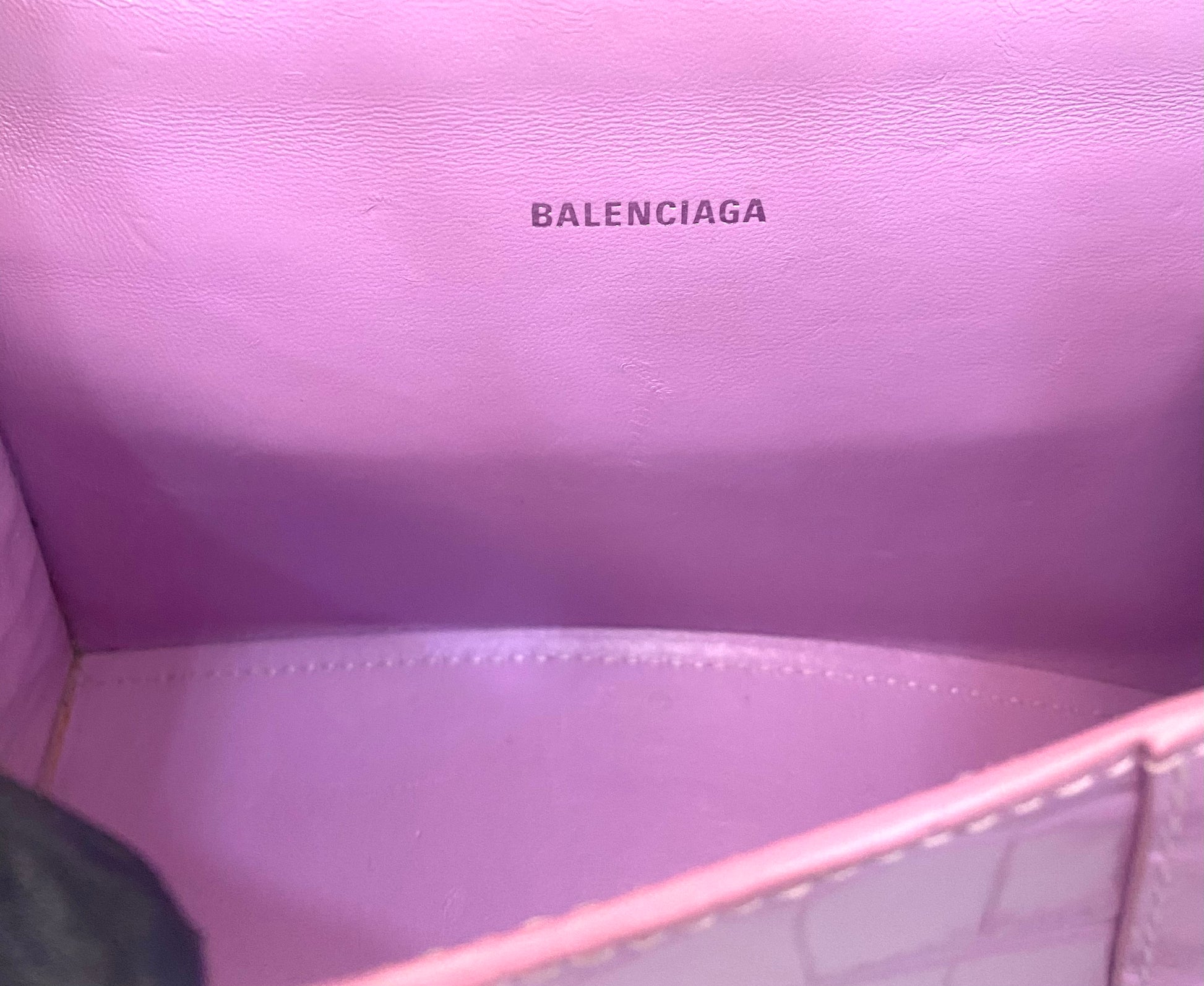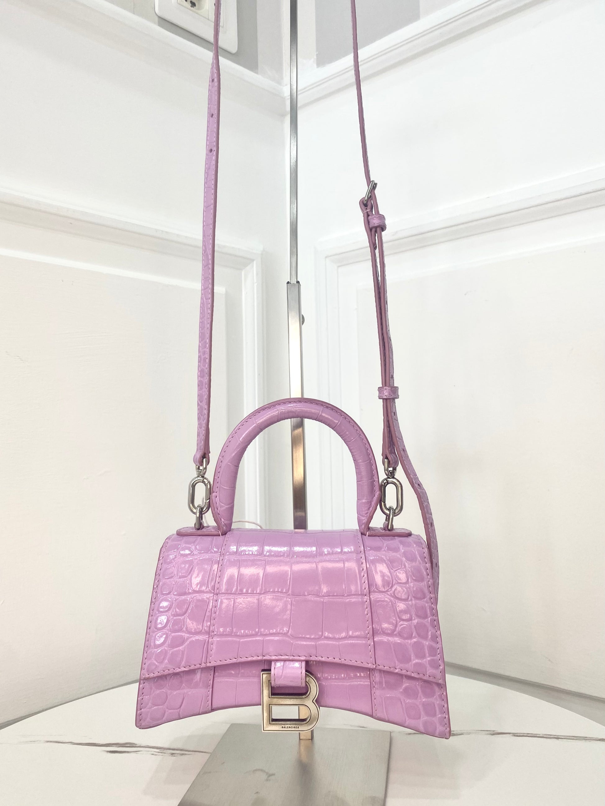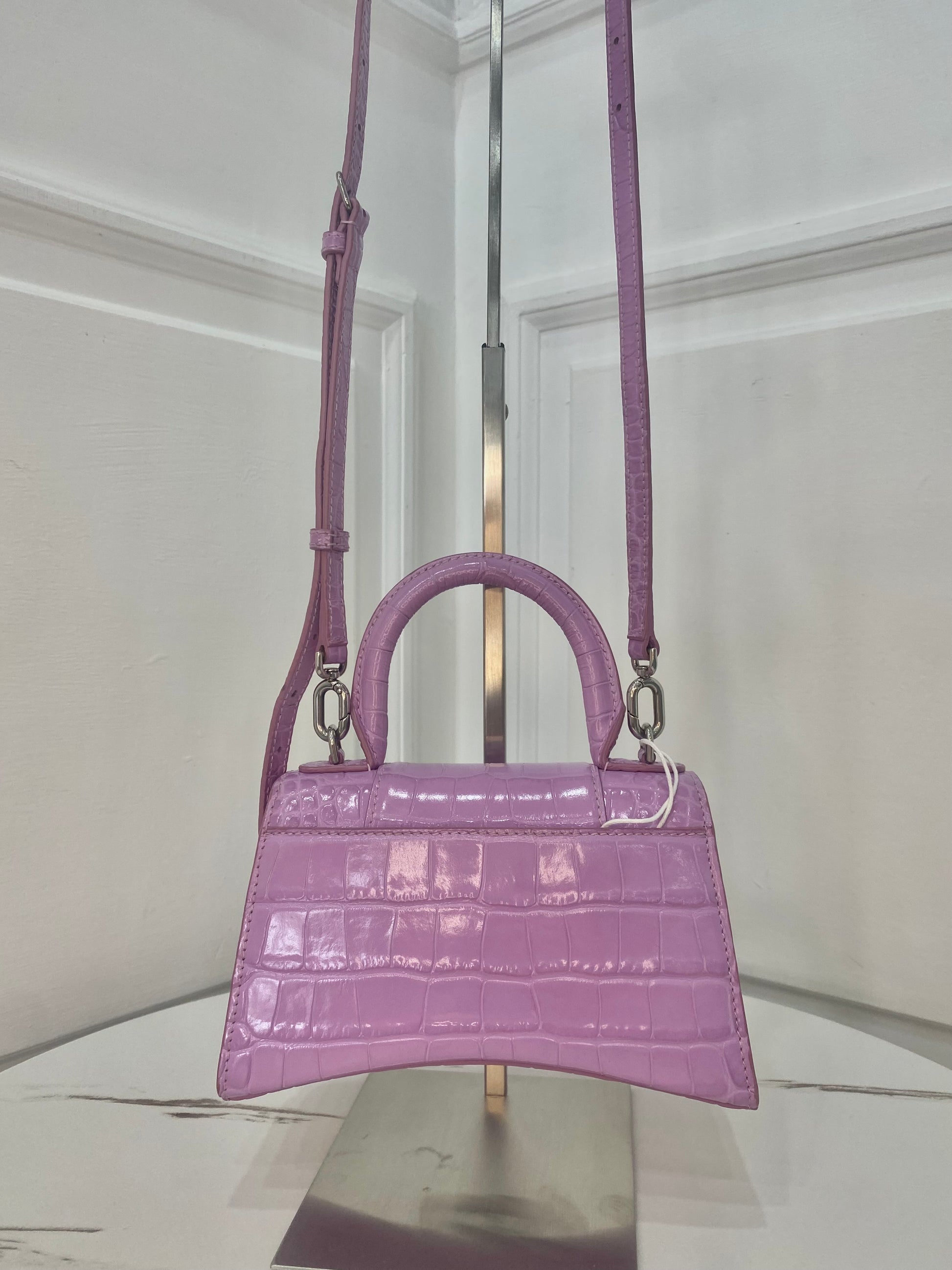 Borsa Balenciaga Hourglass XS in pelle lucida di vitello con lavorazione coccodrillo in color lilla. Manico rigido da indossare a mano o con tracolla staccabile. Chiusura magnetica e con logo B in argento.