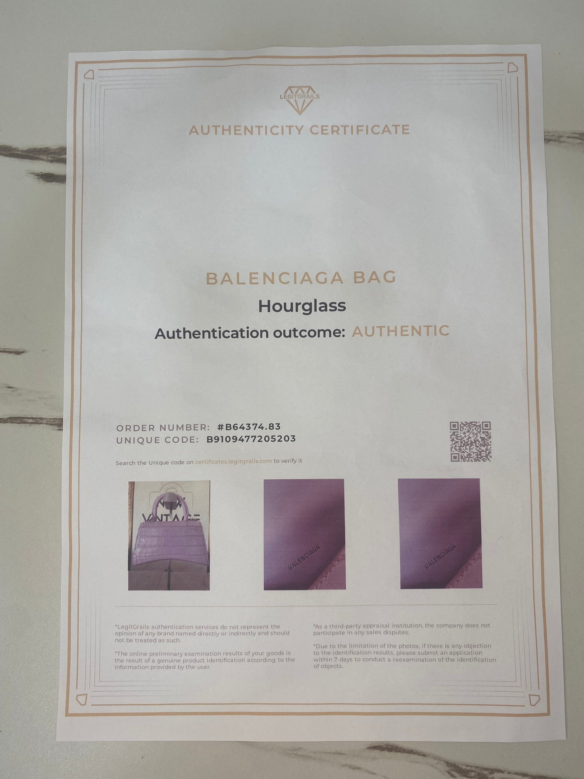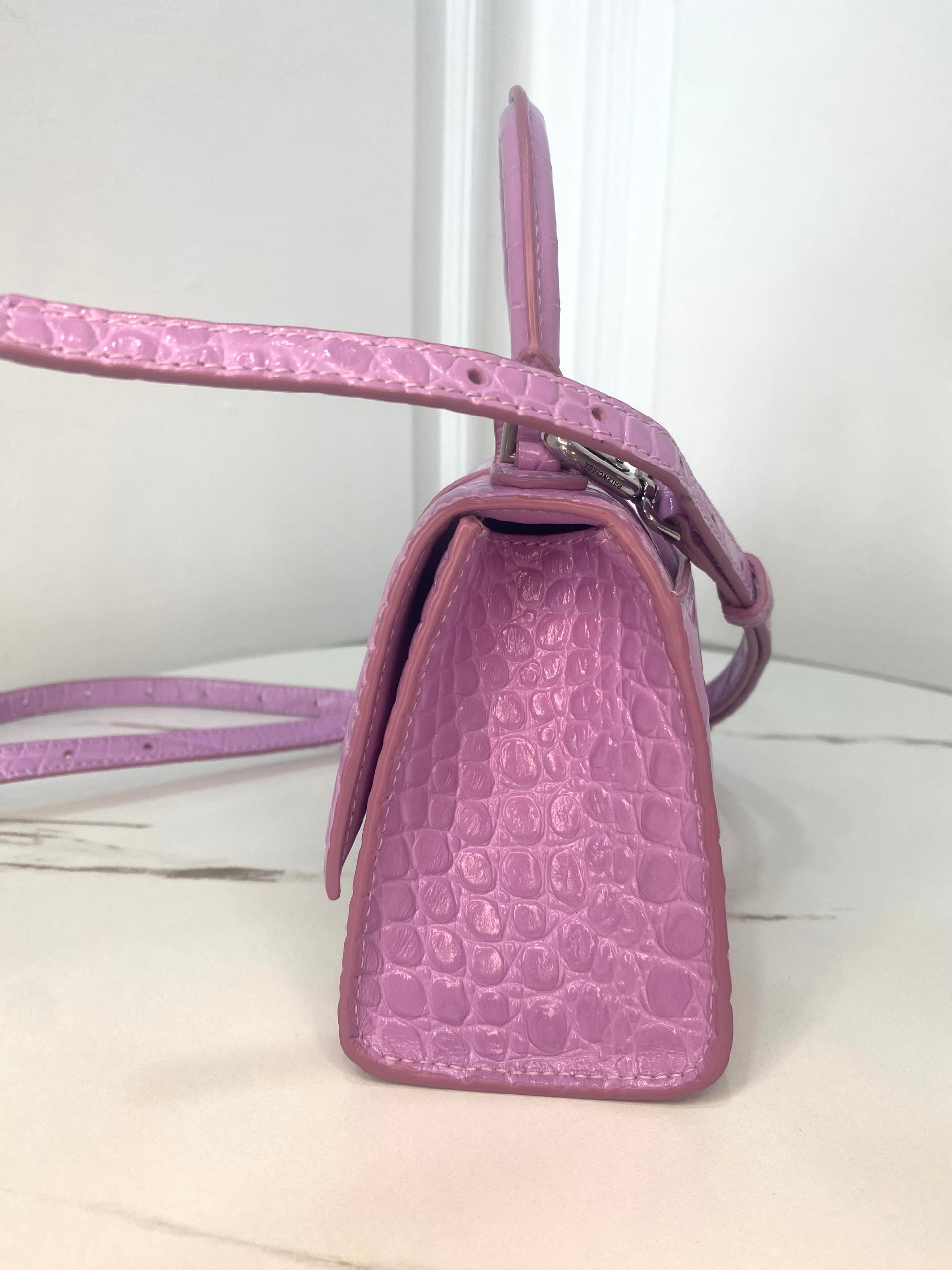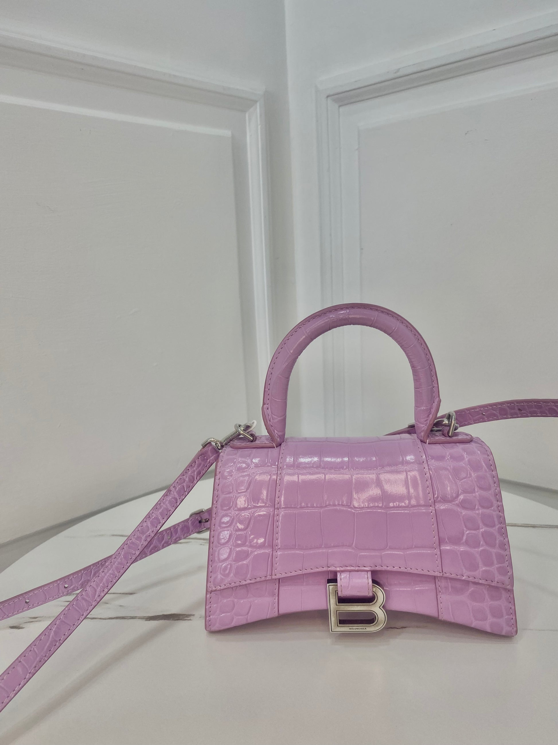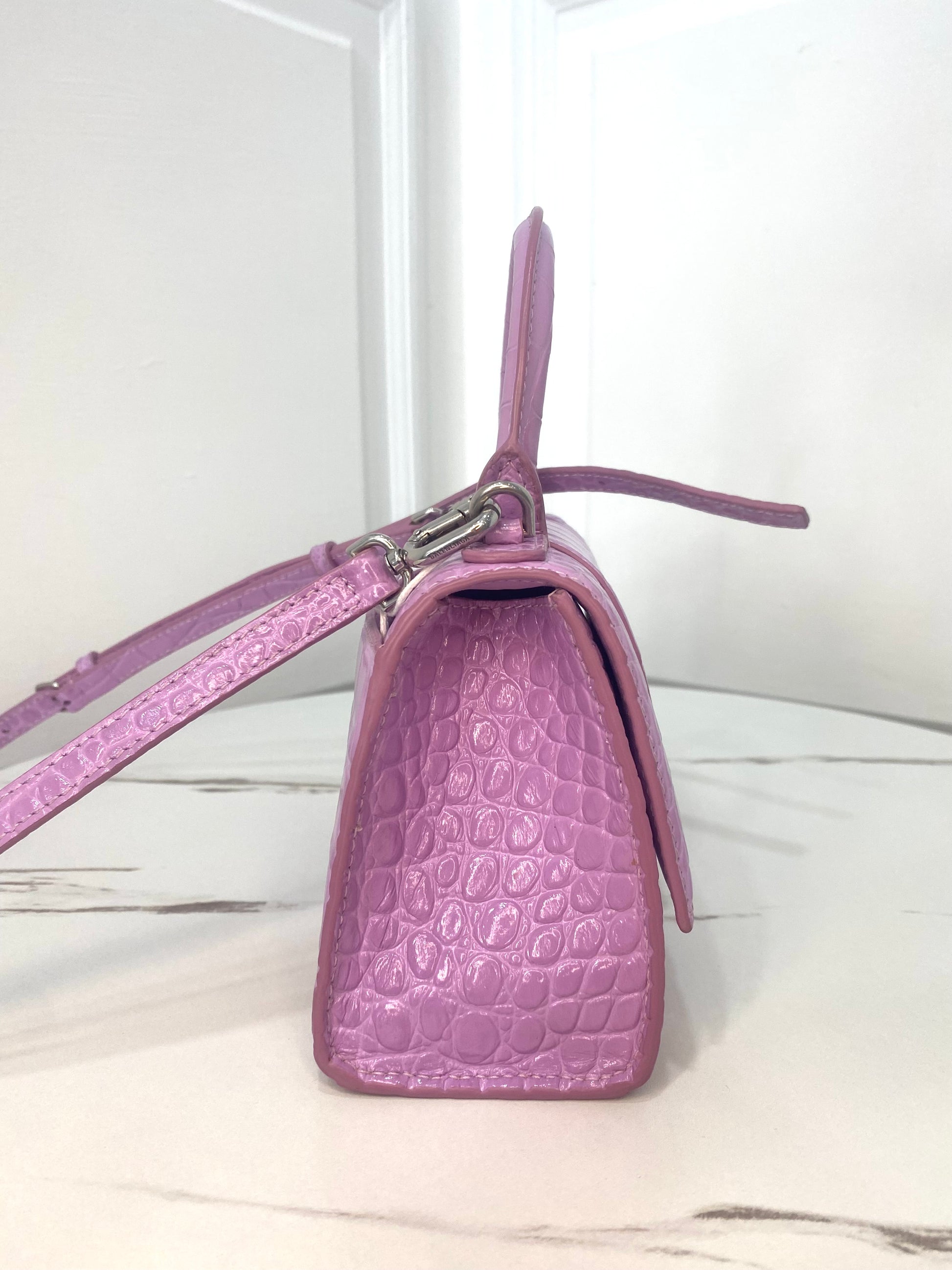 Borsa Balenciaga Hourglass XS in pelle lucida di vitello con lavorazione coccodrillo in color lilla. Manico rigido da indossare a mano o con tracolla staccabile. Chiusura magnetica e con logo B in argento.
