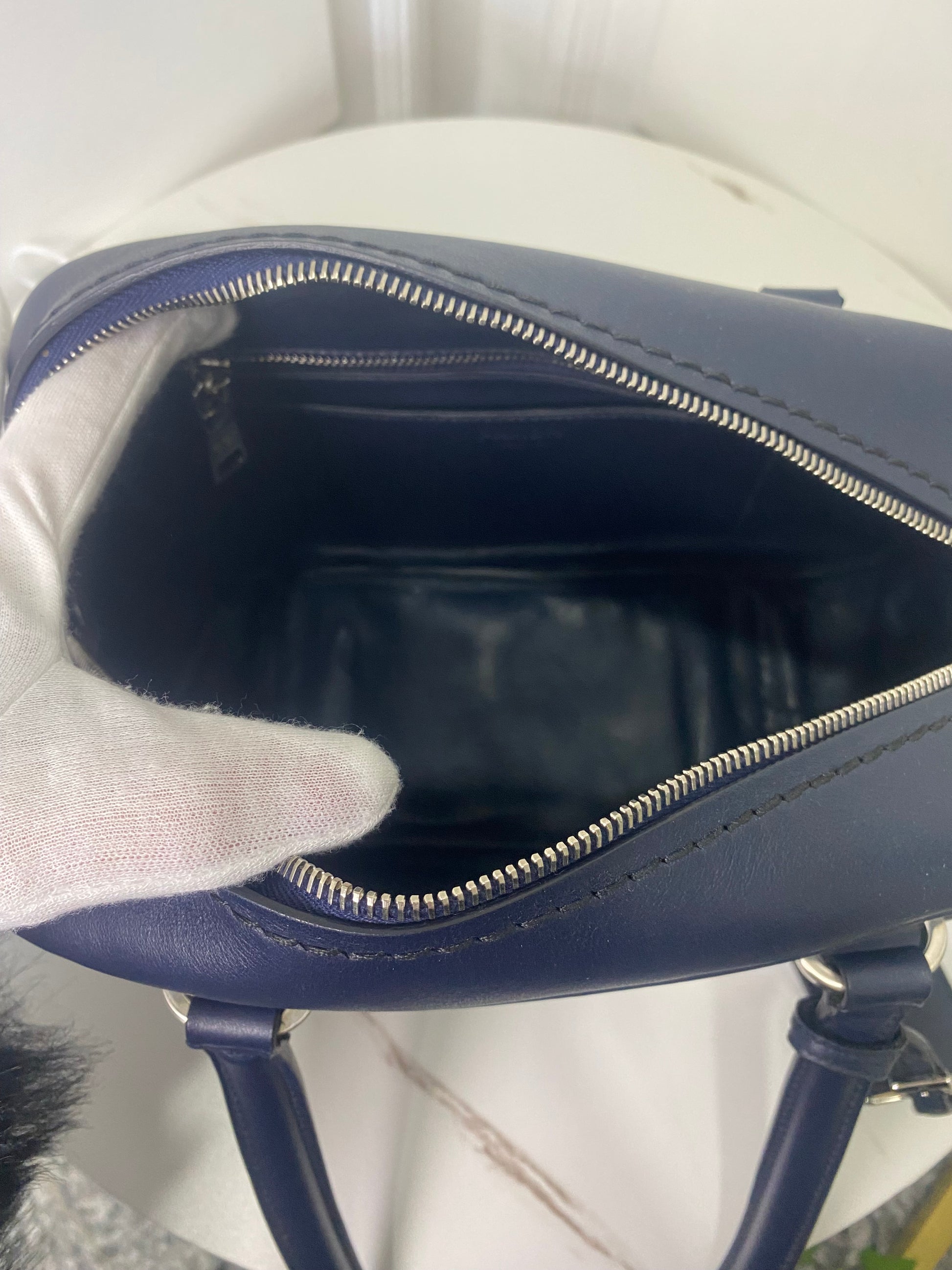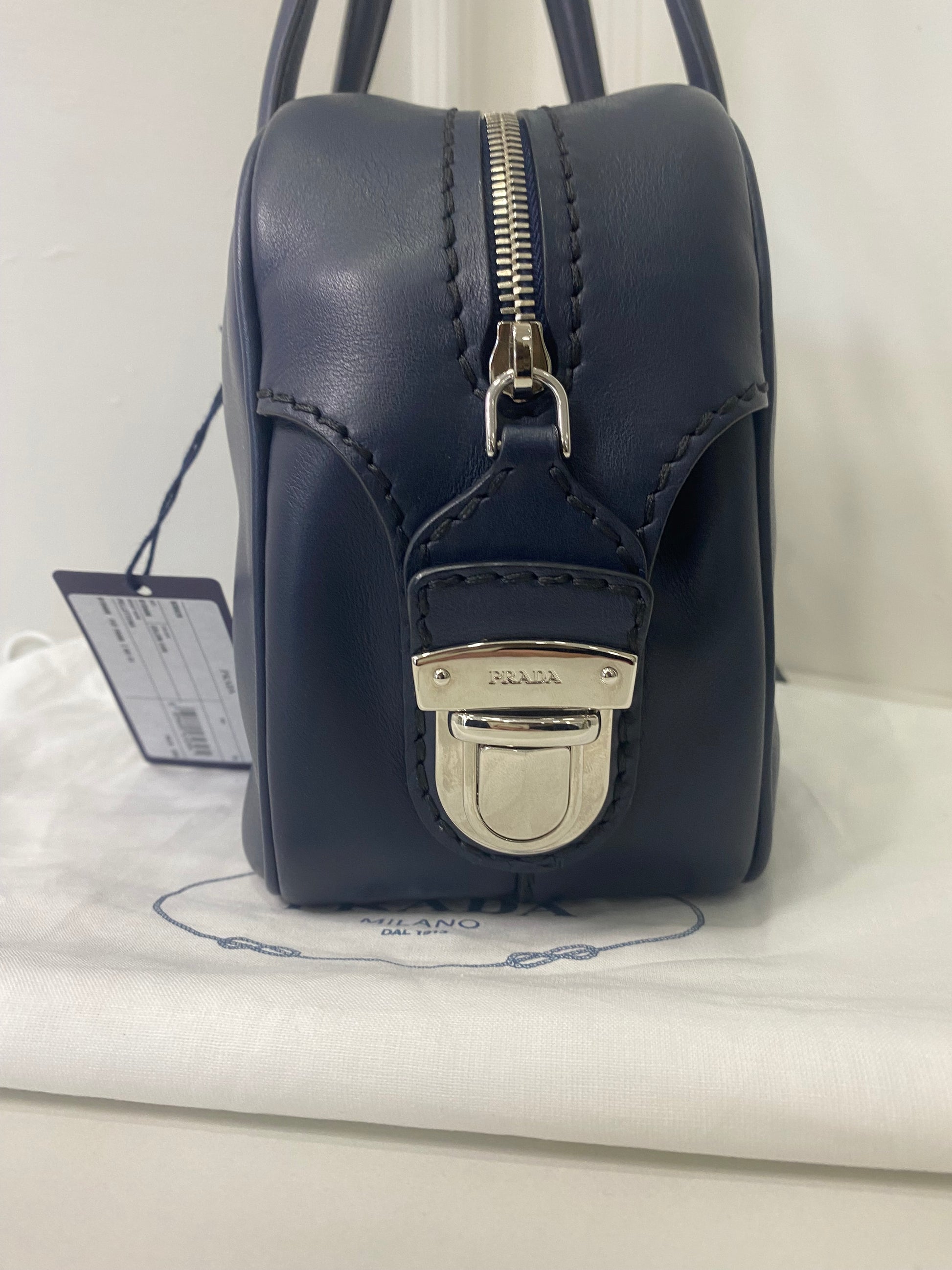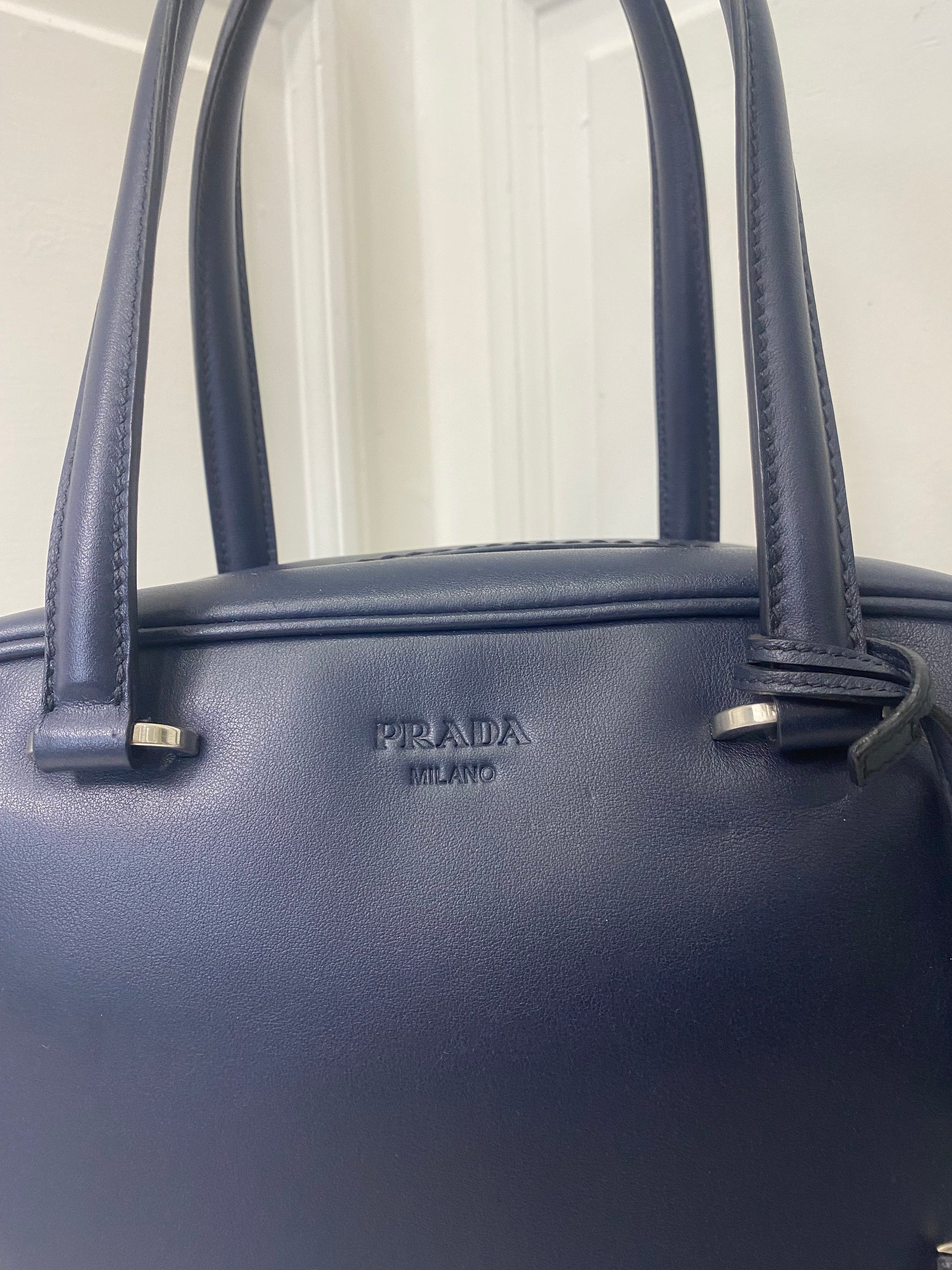 Borsa a Bauletto Prada in pelle blu scuro e hardware argento. Con chiusura con cerniera .
