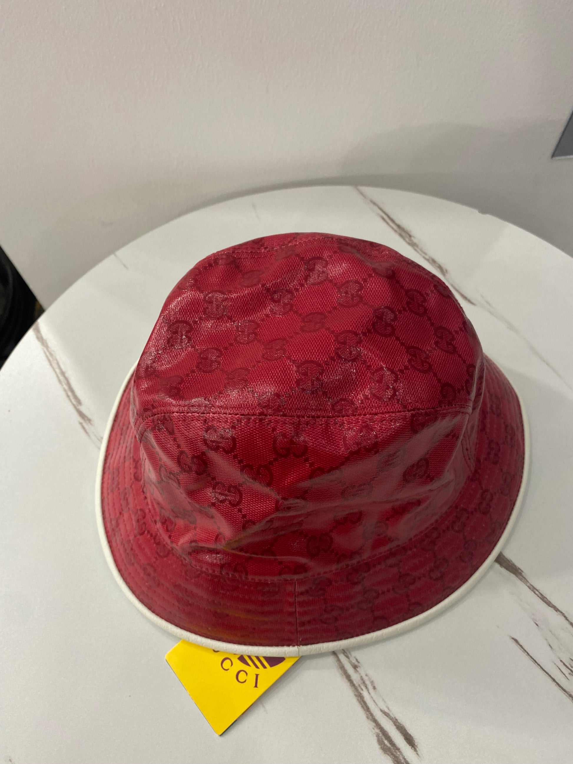 Cappello Gucci X Adidas In pelle rossa e logo GG e logo frontale bianco.