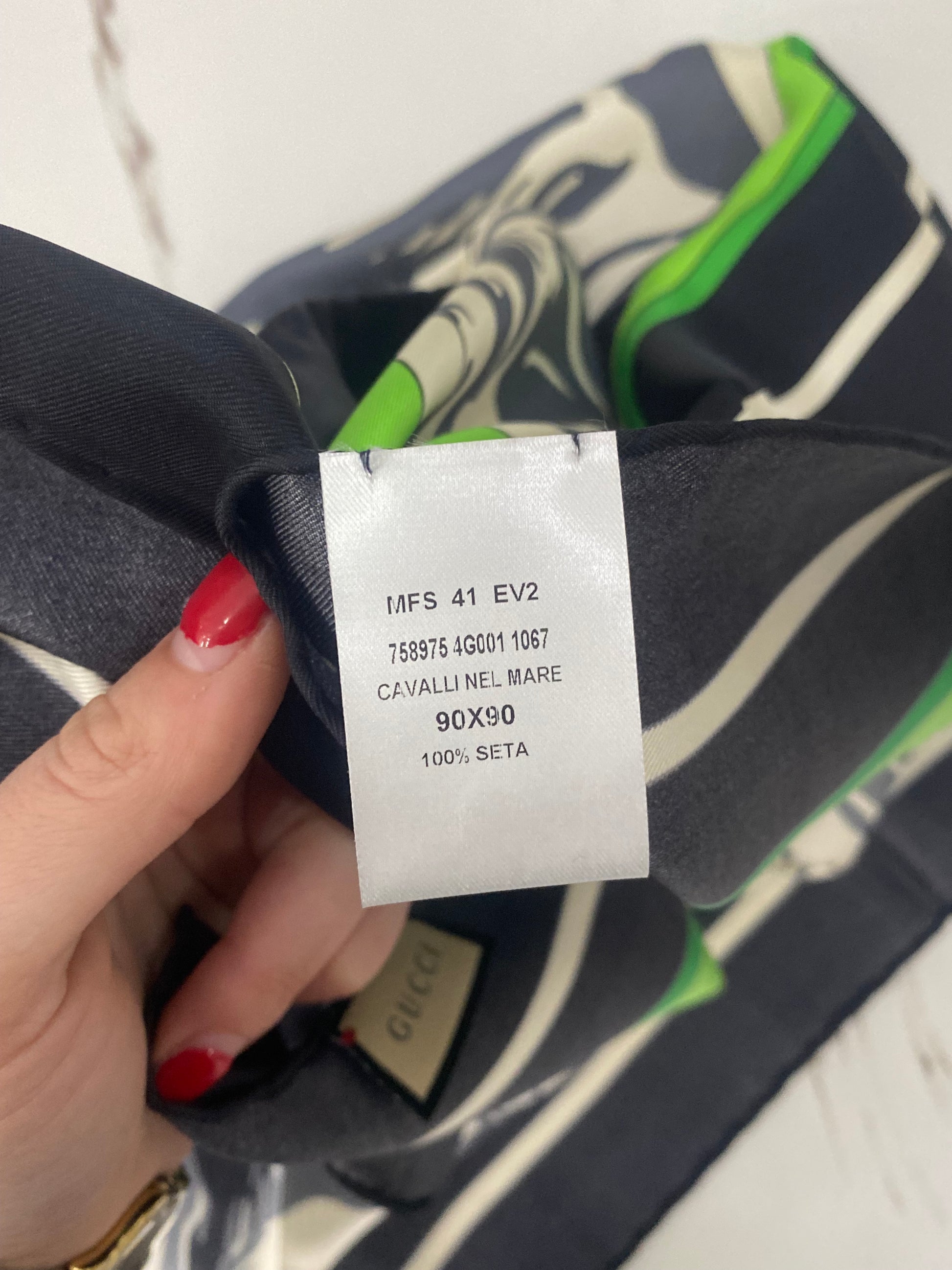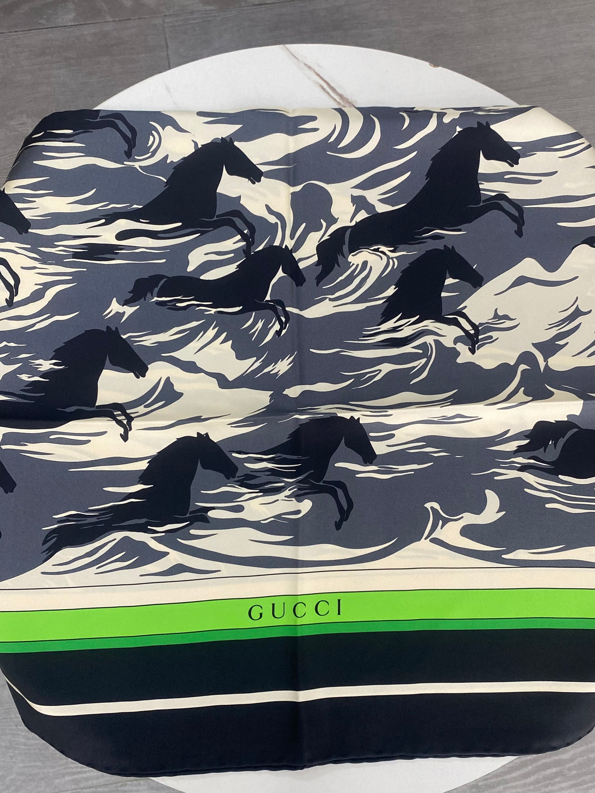 Sciarpa Gucci in seta ,presenta un motivo grafico con silhouette di cavalli stilizzati che sembrano nuotare tra le onde, con un bordo inferiore a strisce nere e verdi, e il logo "GUCCI" centrato.