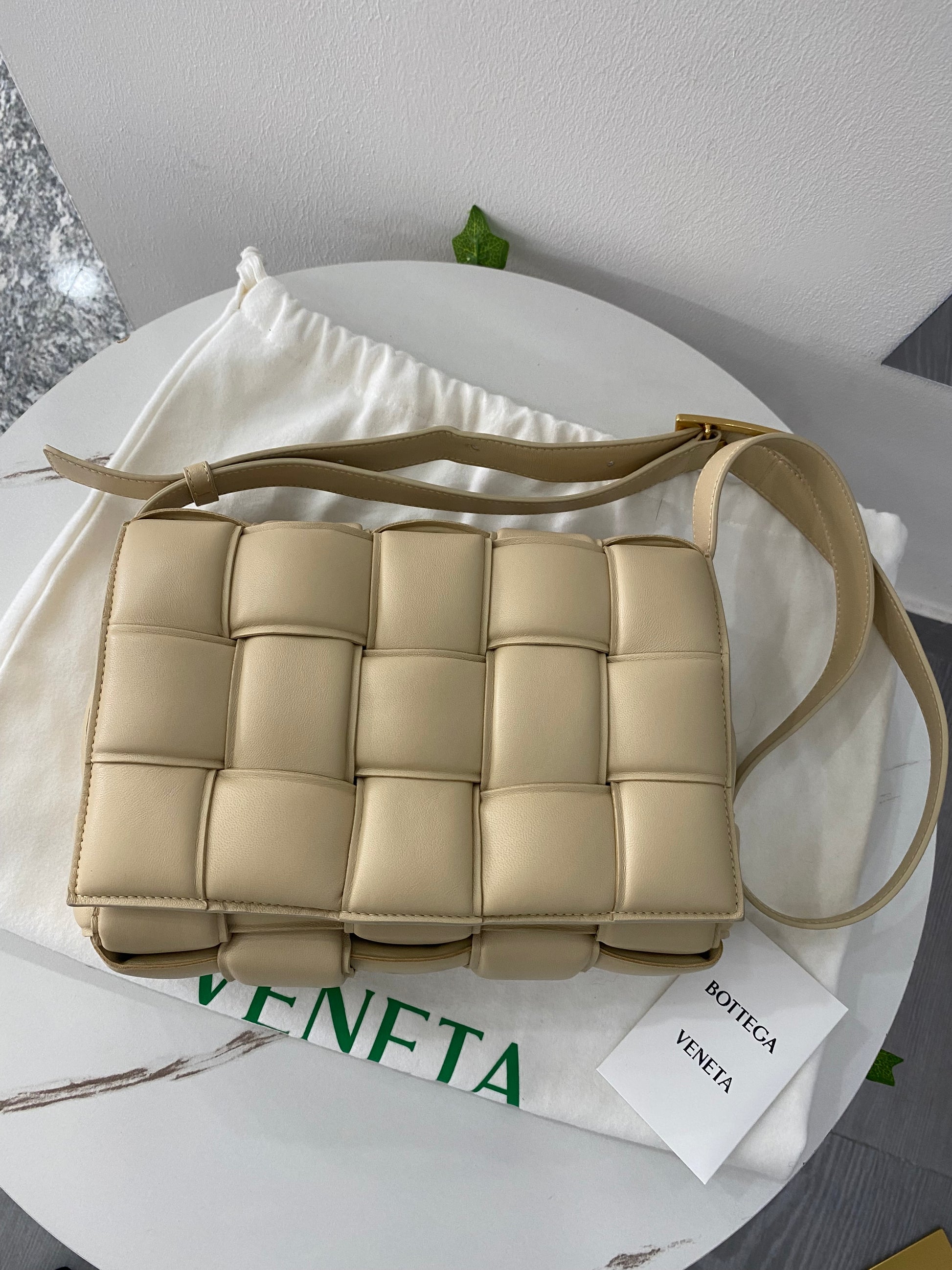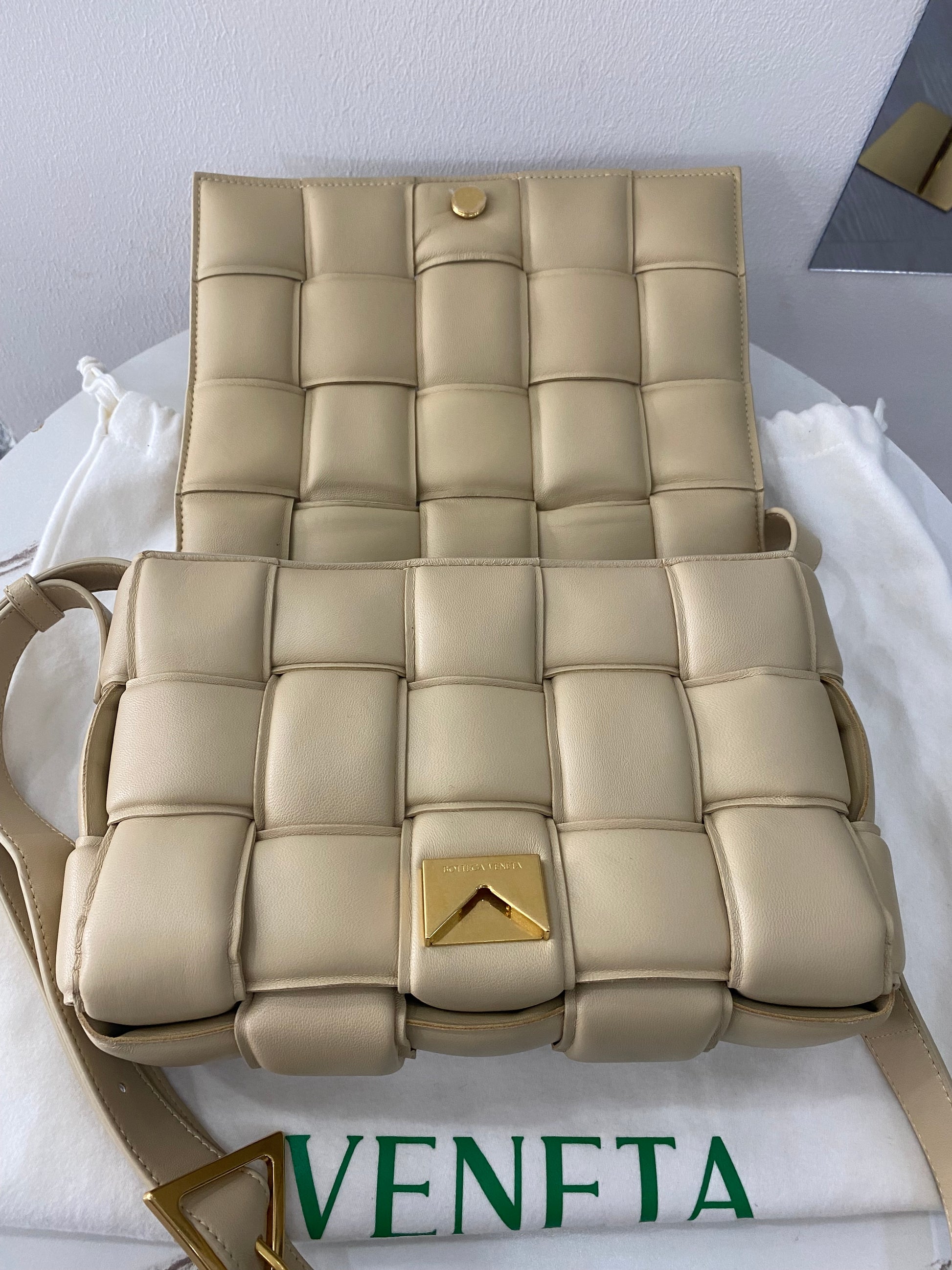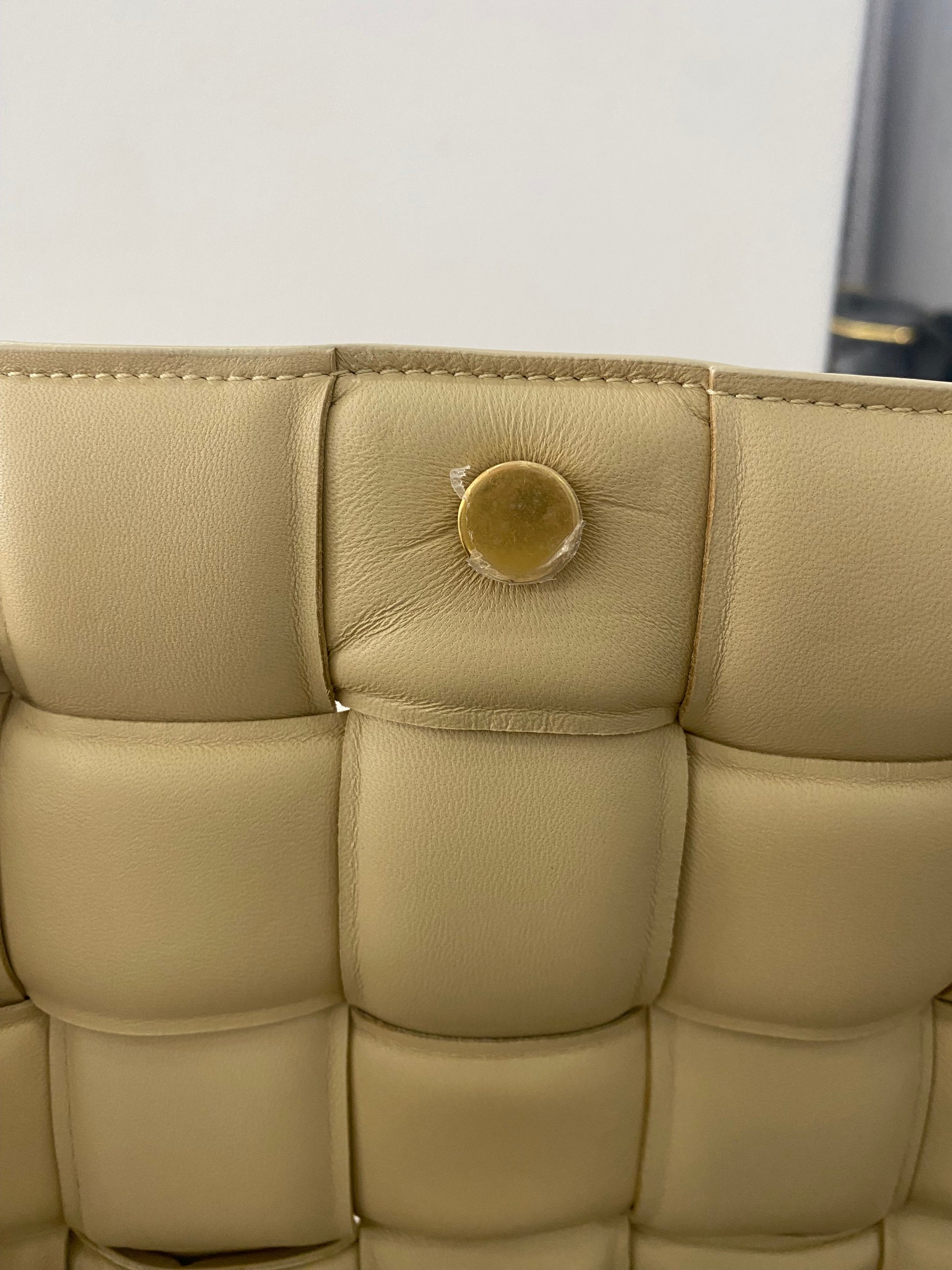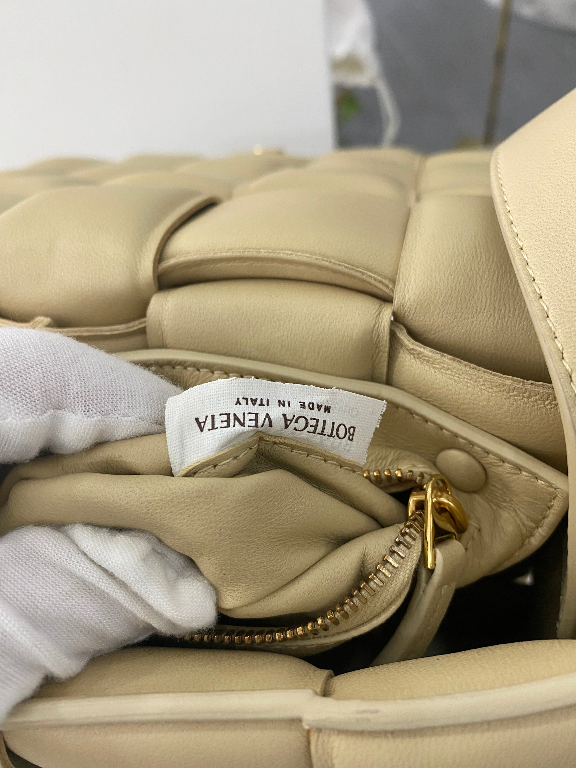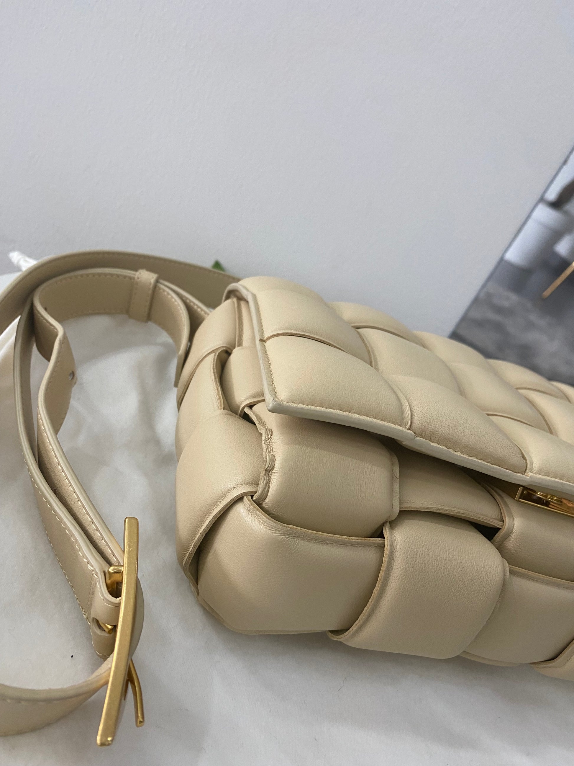 Borsa a tracolla Cassette Bottega Veneta in pelle intrecciata trapuntata beige e hardware con pellicole oro.