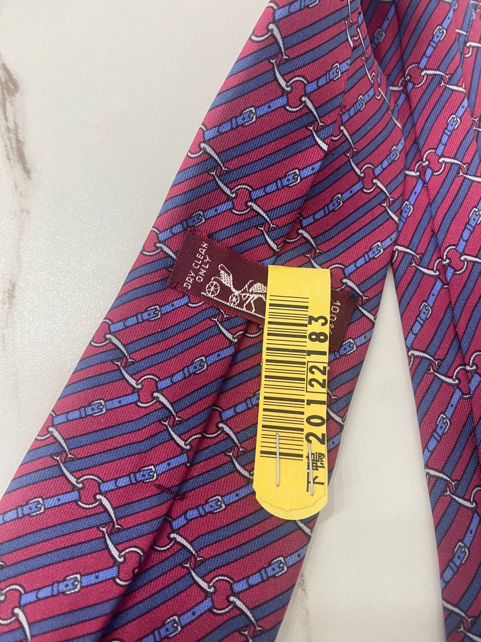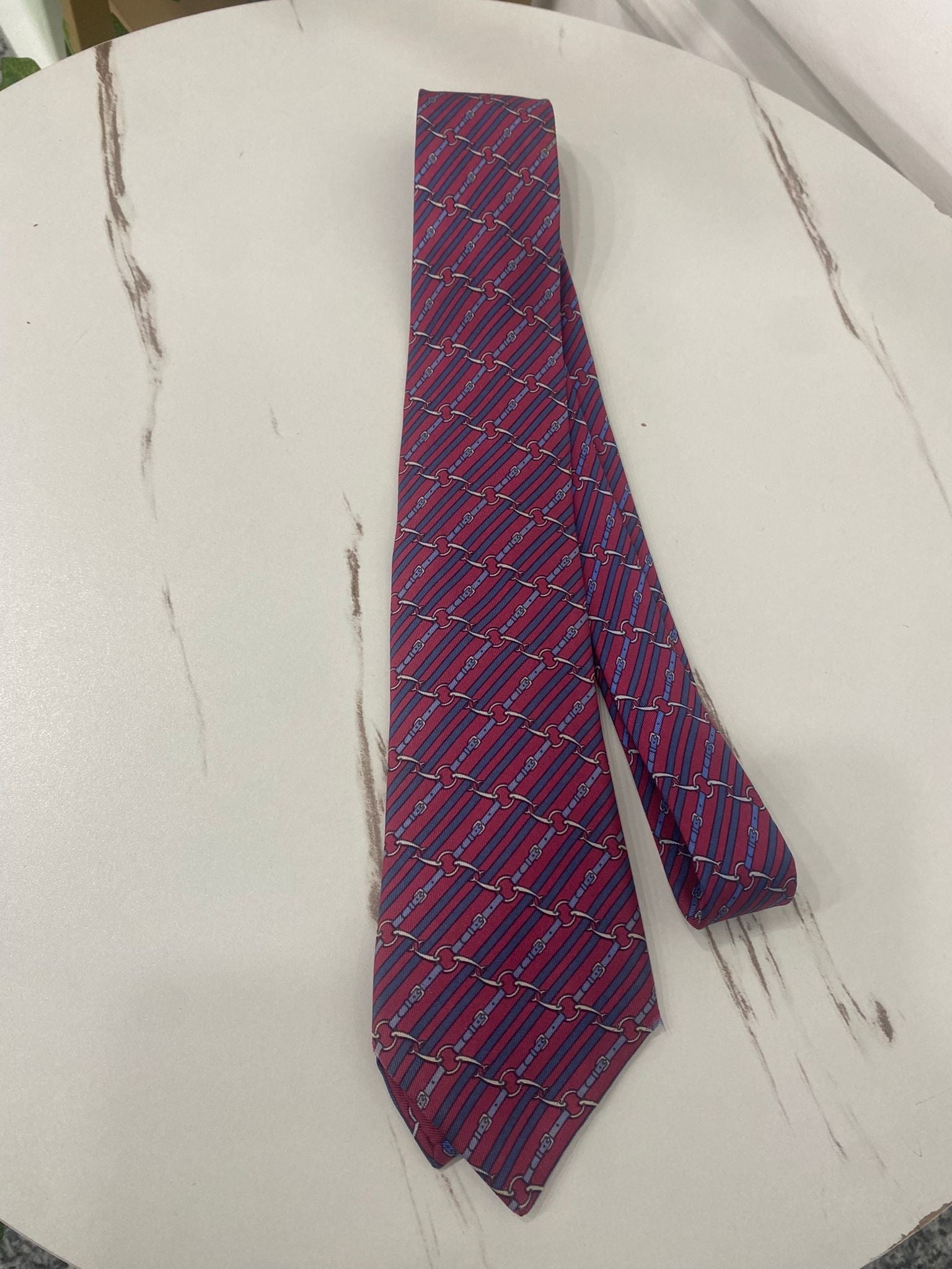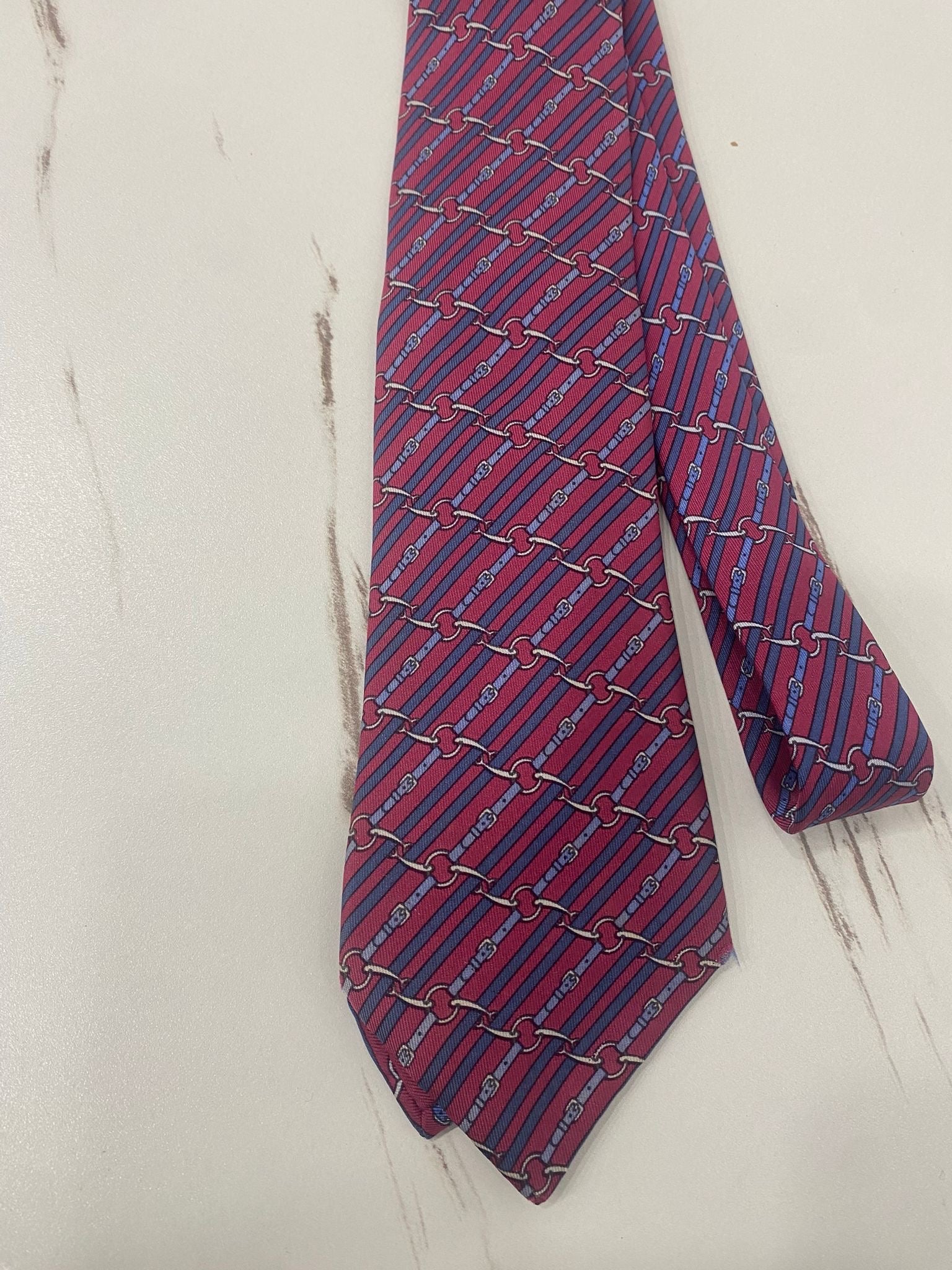 Cravatta Vintage Hermès Paris realizzata in 100% Seta.Presenta un motivo regimental a righe diagonali in tonalità bordeaux e blu.