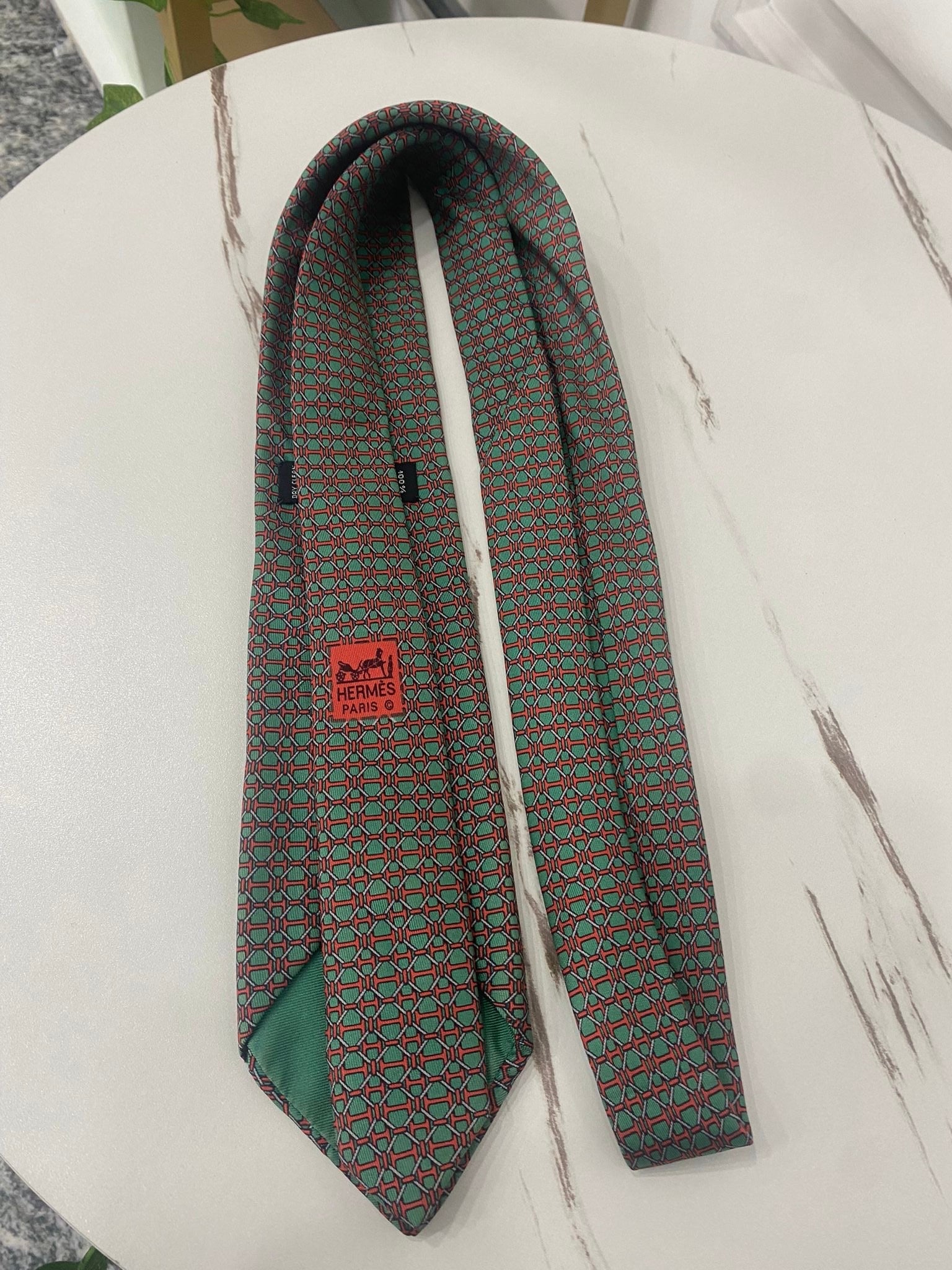 Cravatta Hermès Vintage in 100% seta ,caratterizzata da un distintivo motivo geometrico a griglia o quadrati.