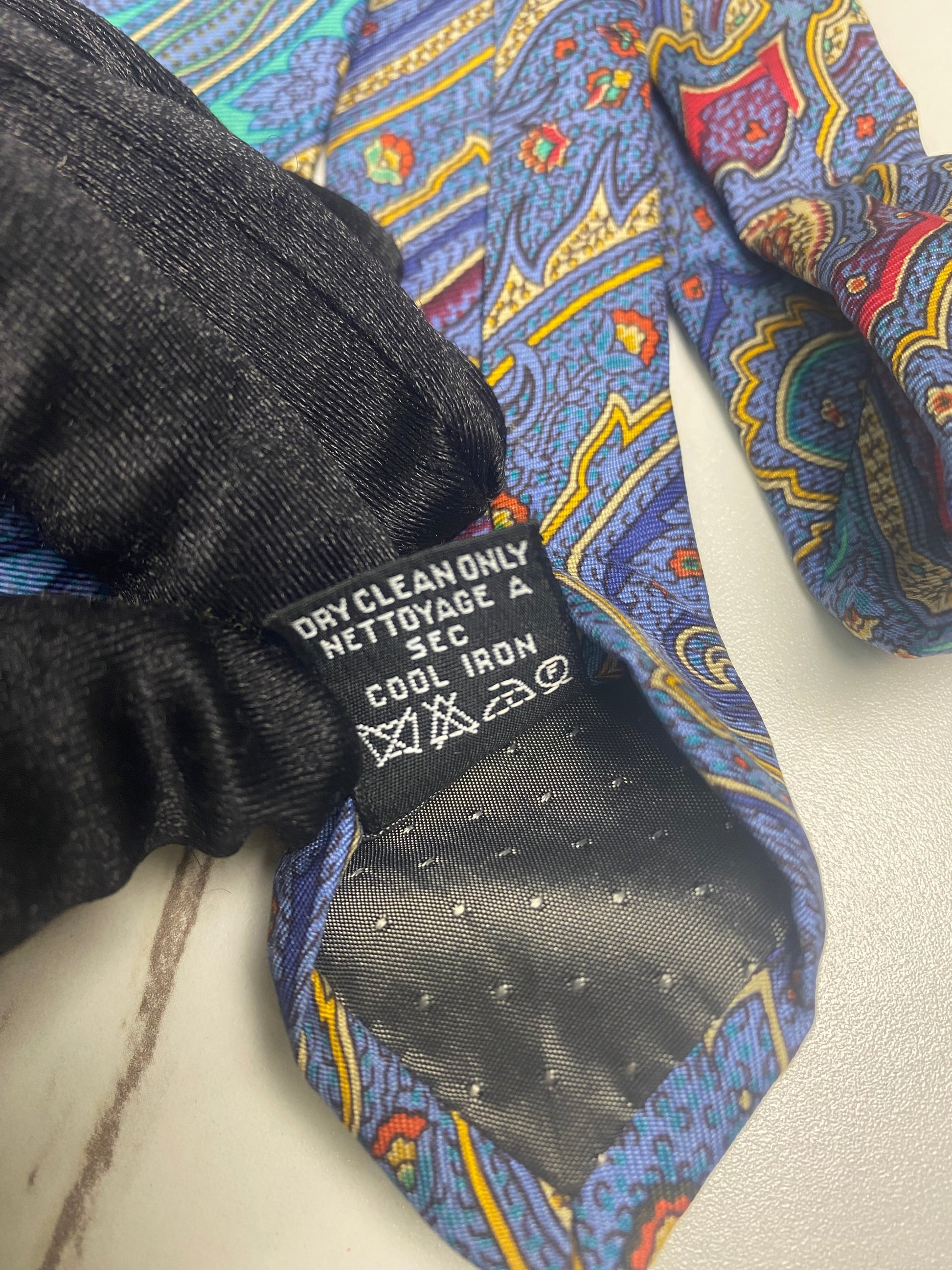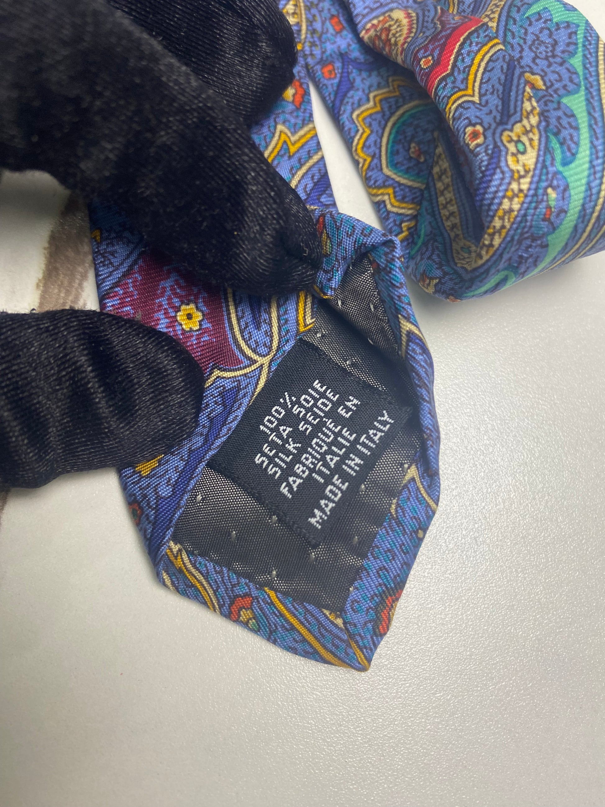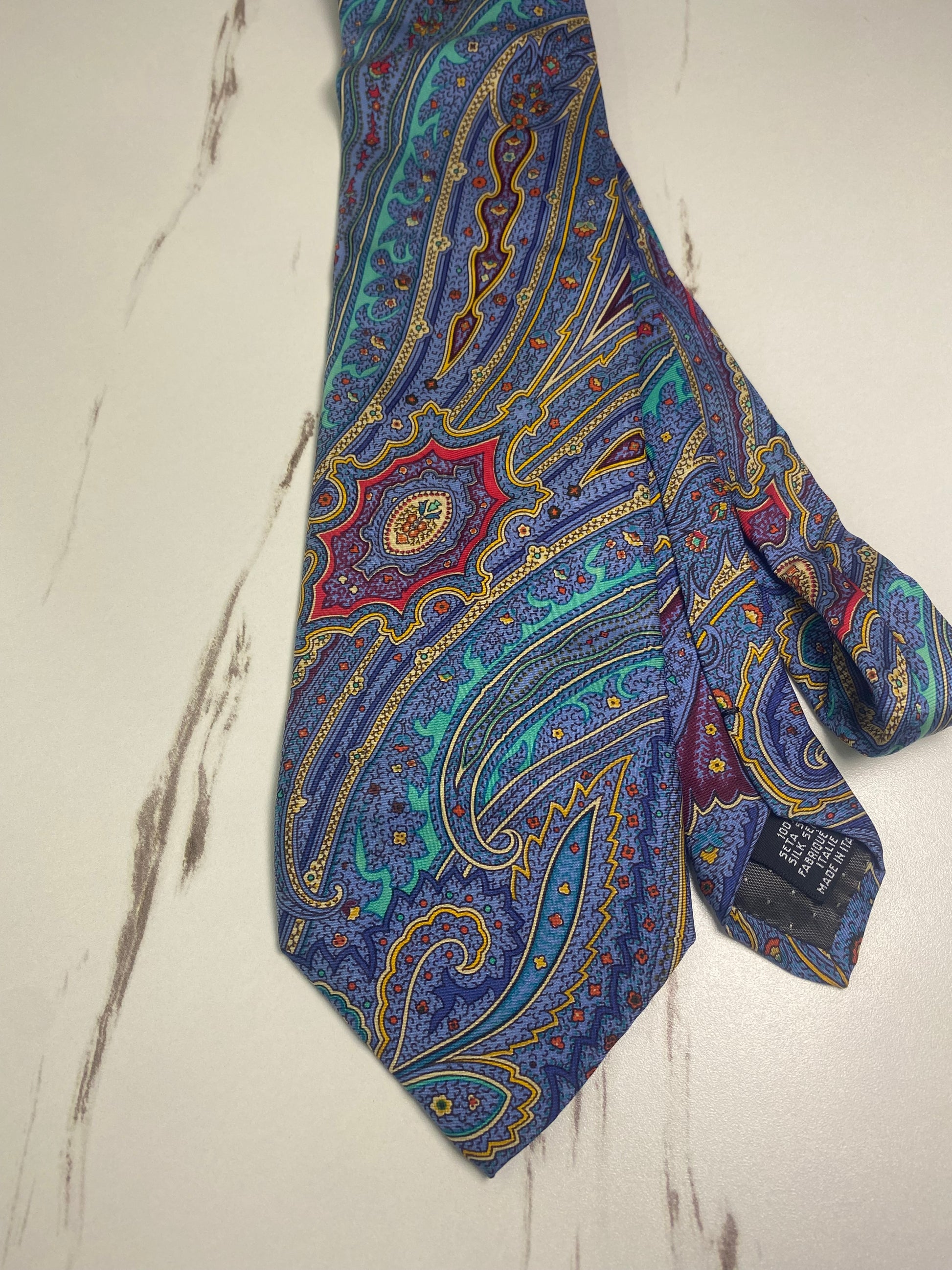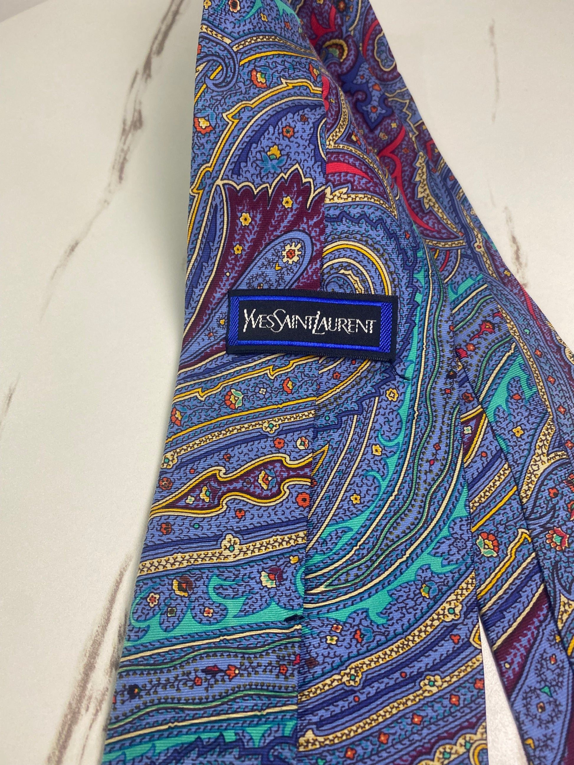 cravatta vintage Yves Saint Laurent caratterizzata da una fantasia Paisley multicolore su base blu, con dettagli in viola, rosso e verde acqua.
