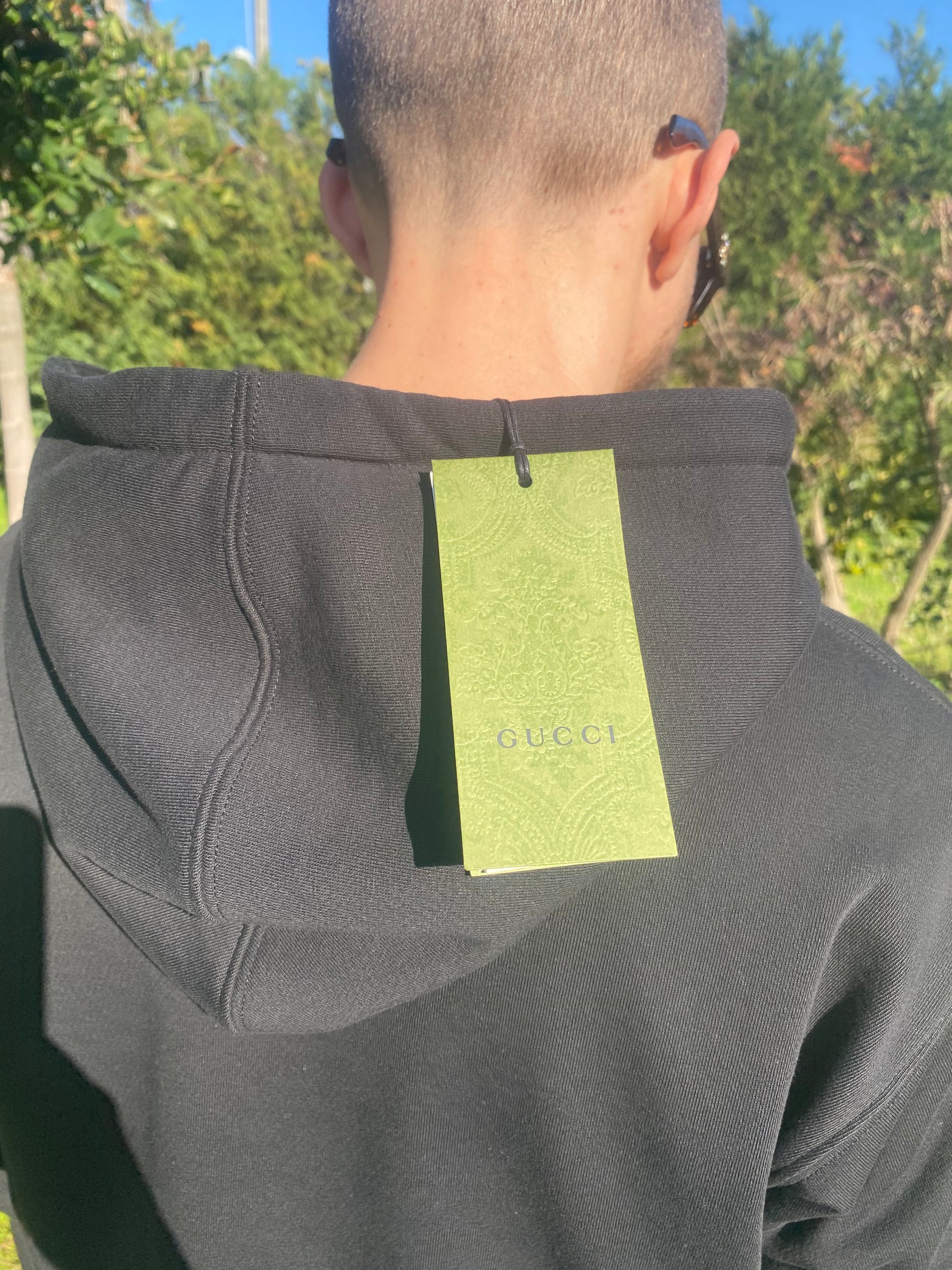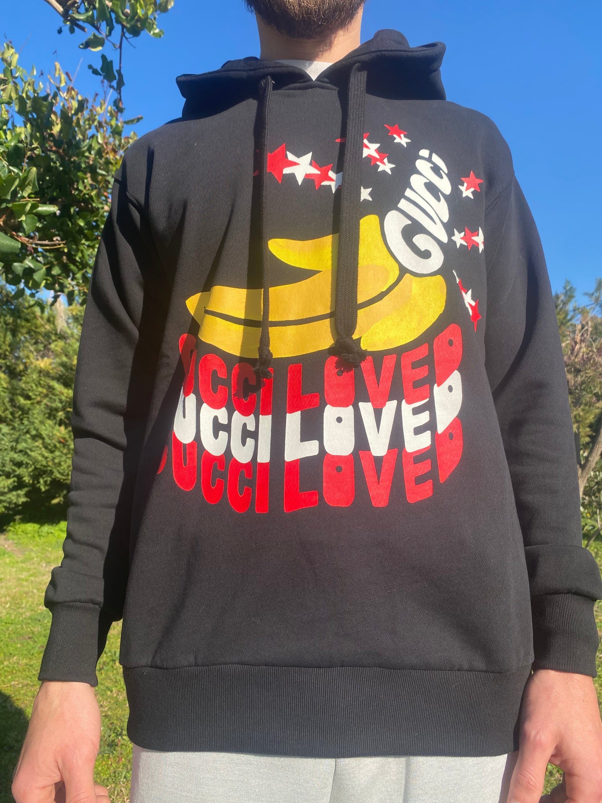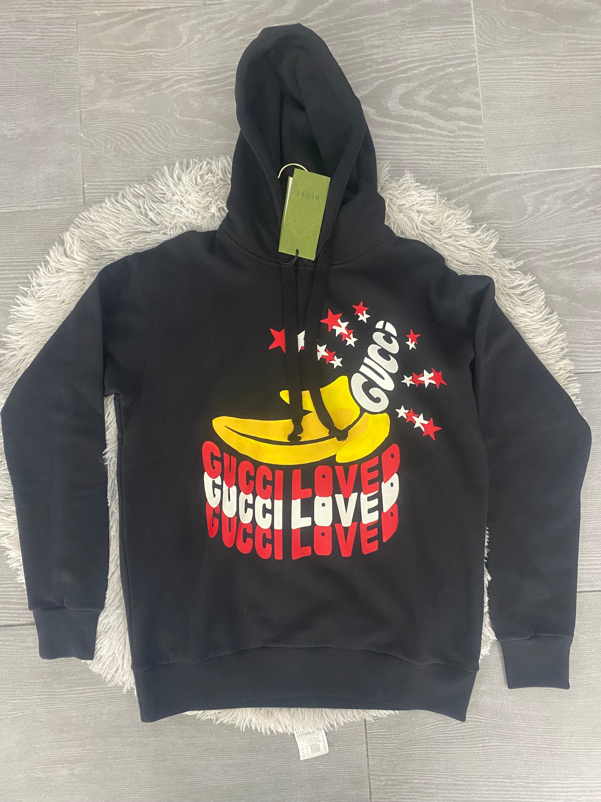 Felpa Gucci con cappuccio ‘Gucci Loved’ in cotone nero con logo frontale e grafica con banane e stelle.
