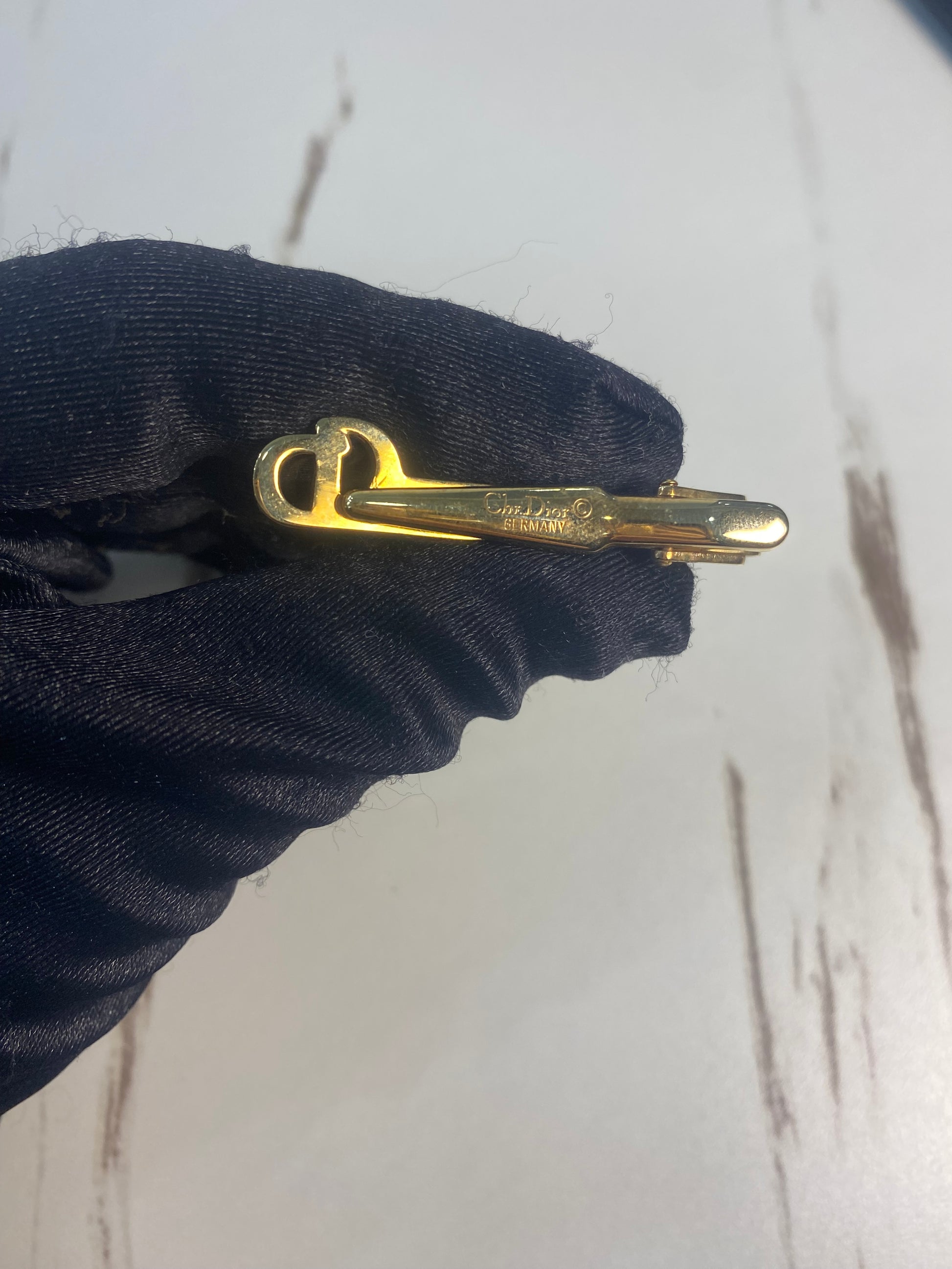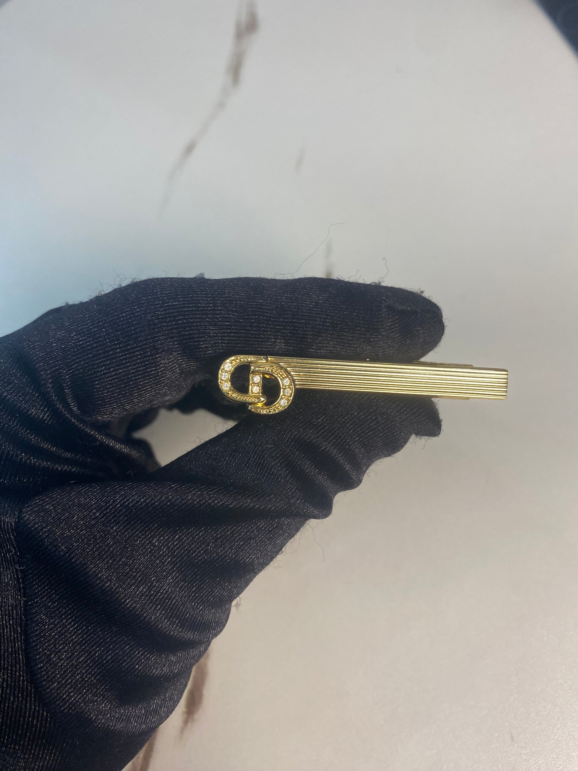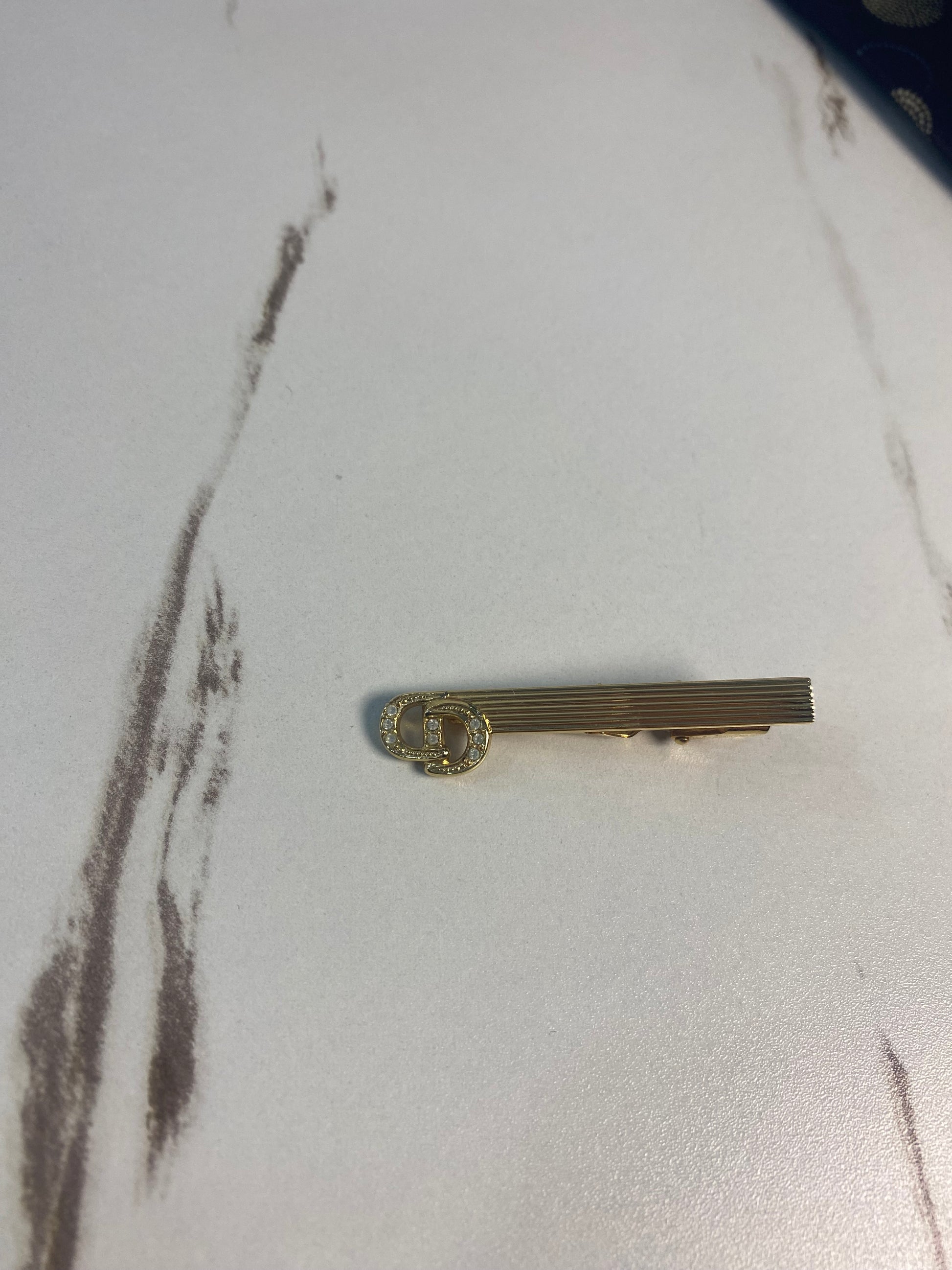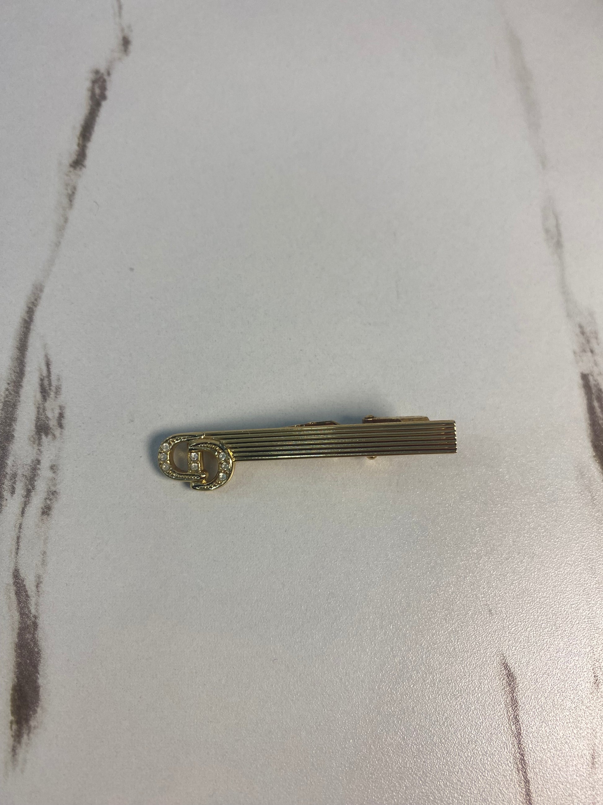 Fermacravatta vintage di Christian Dior, placcato in oro e caratterizzato dal logo "CD" decorato con cristalli.