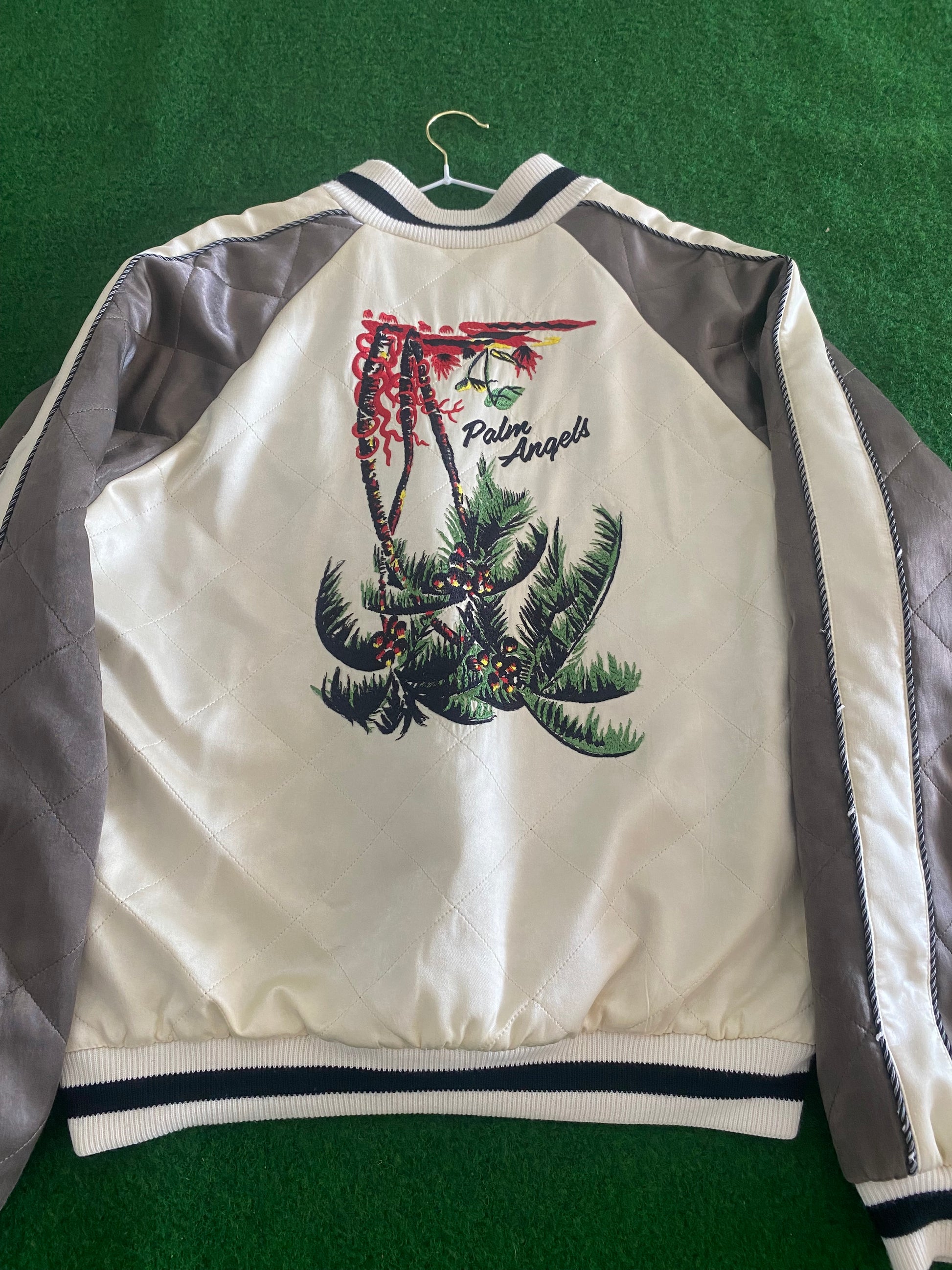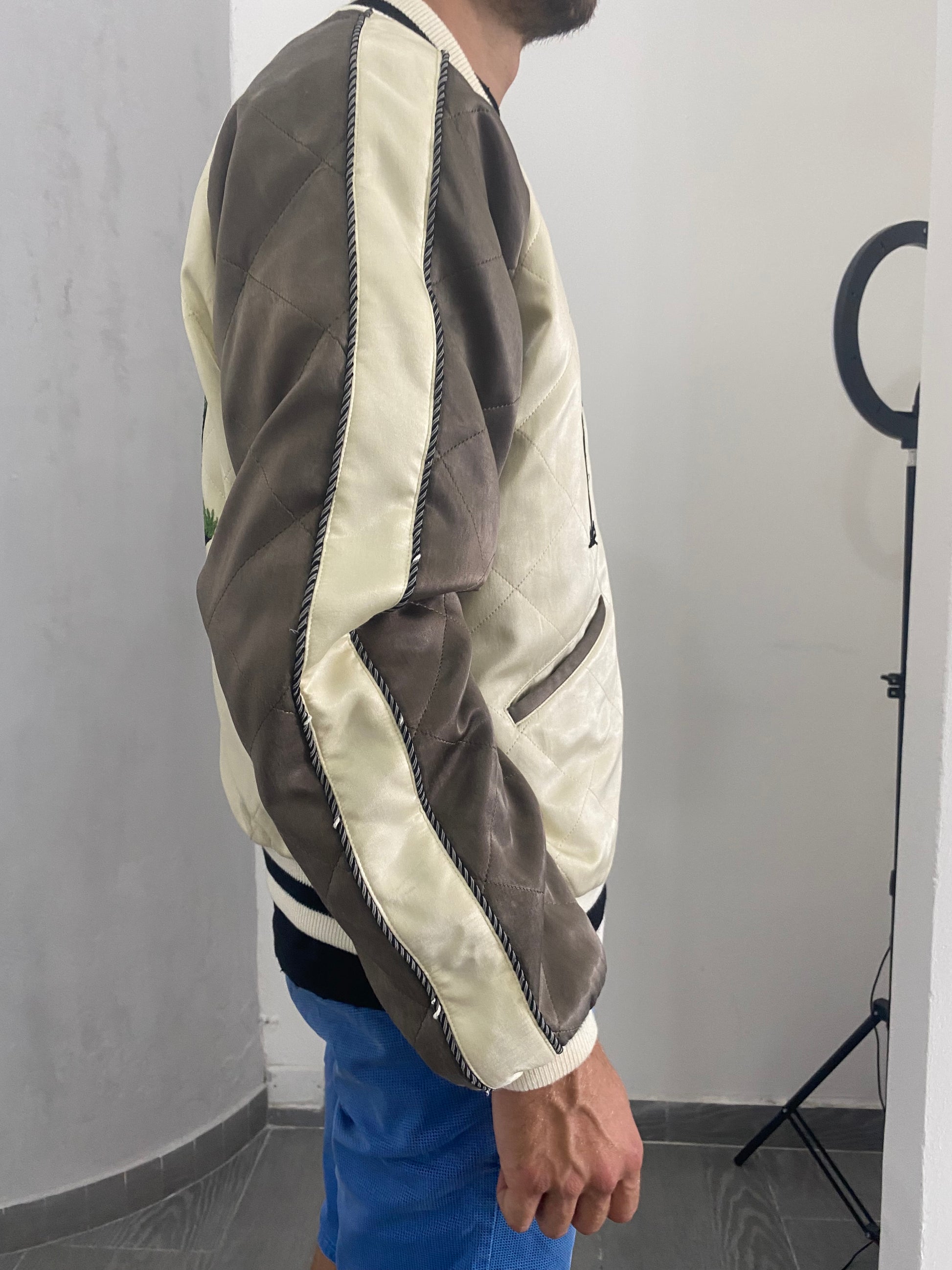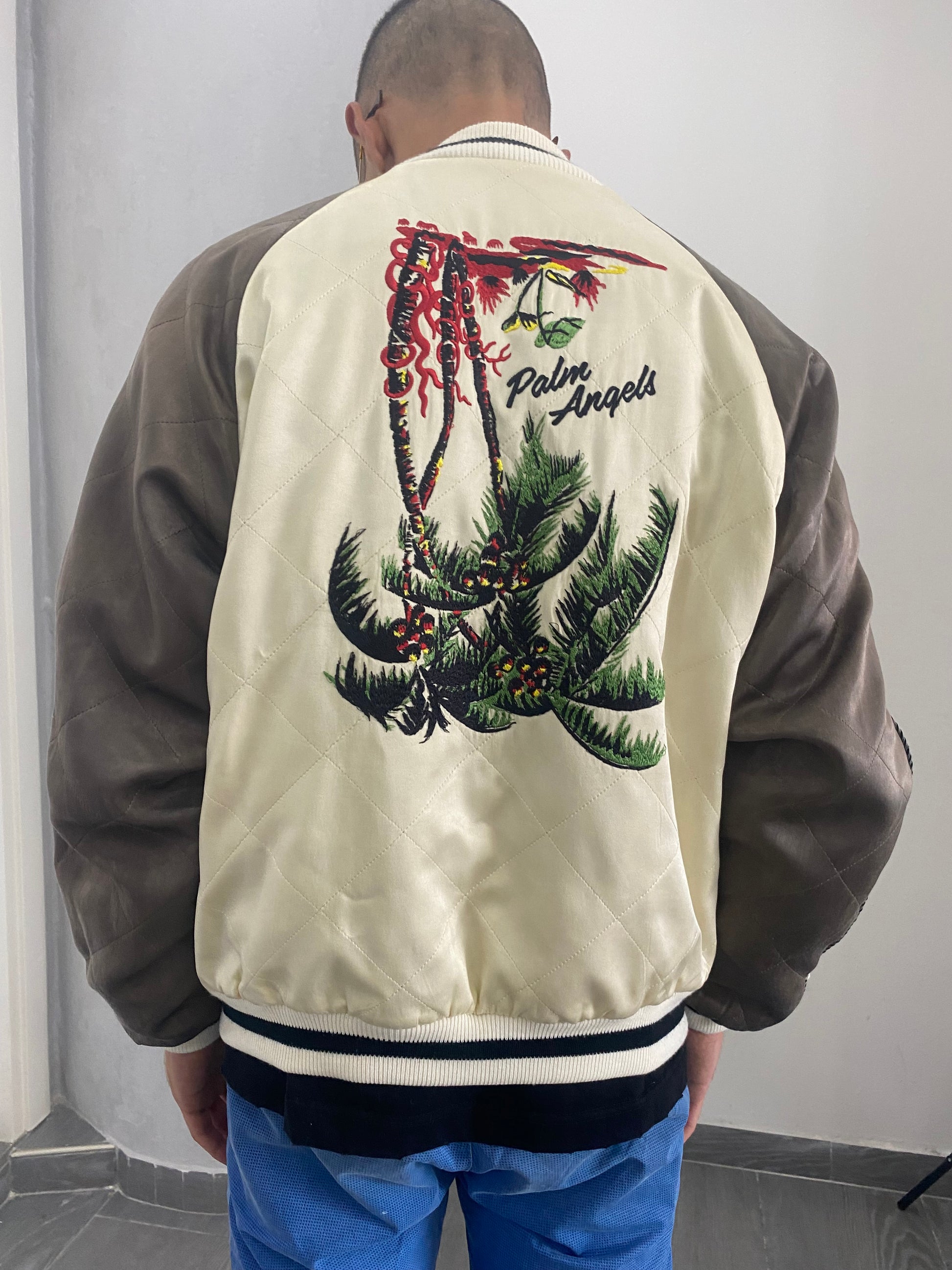 Giacca Palm Angels Bomber colore avorio con maniche grigi e strisce avario. Con ricamo Palme sul retro e avanti