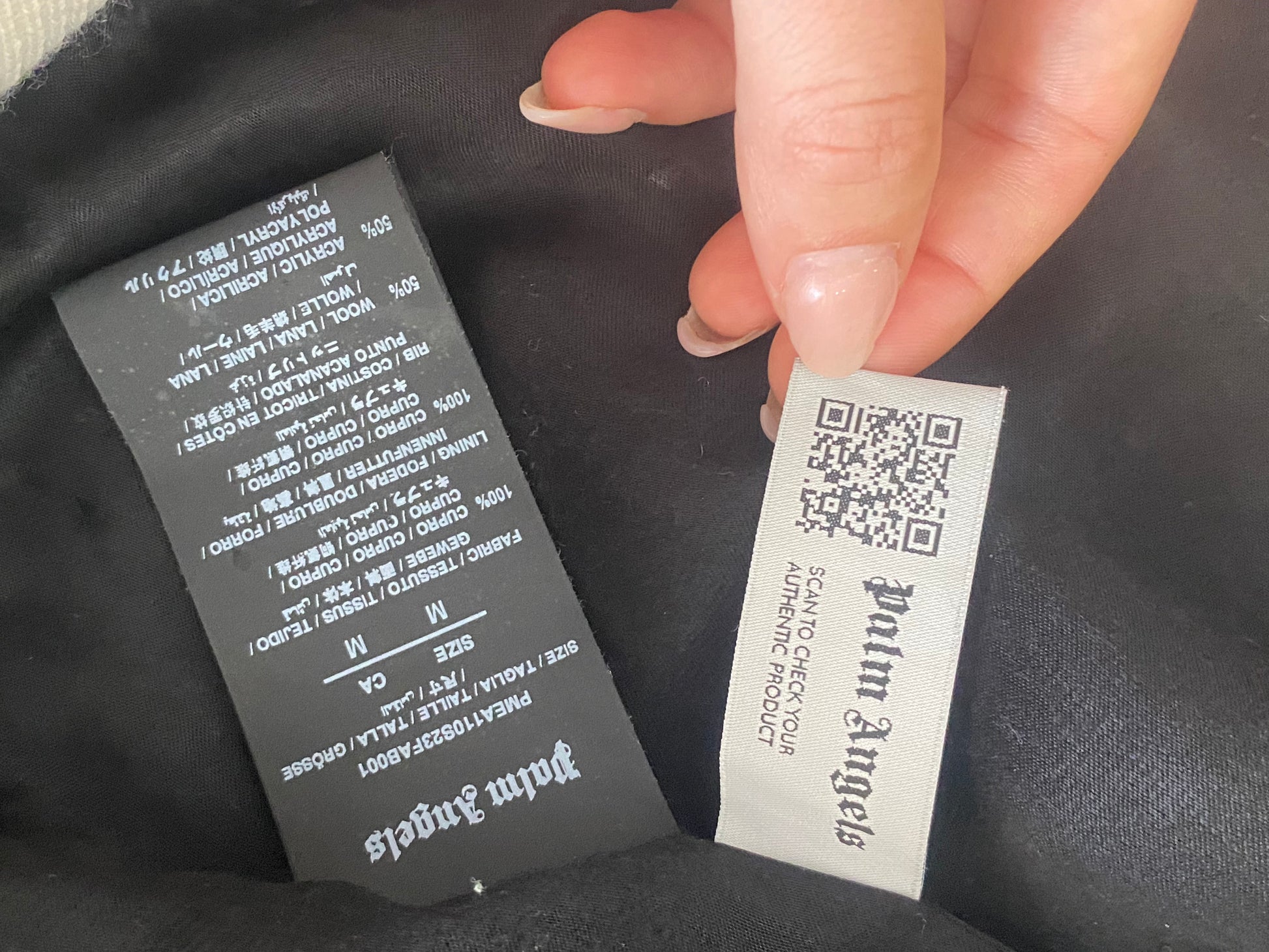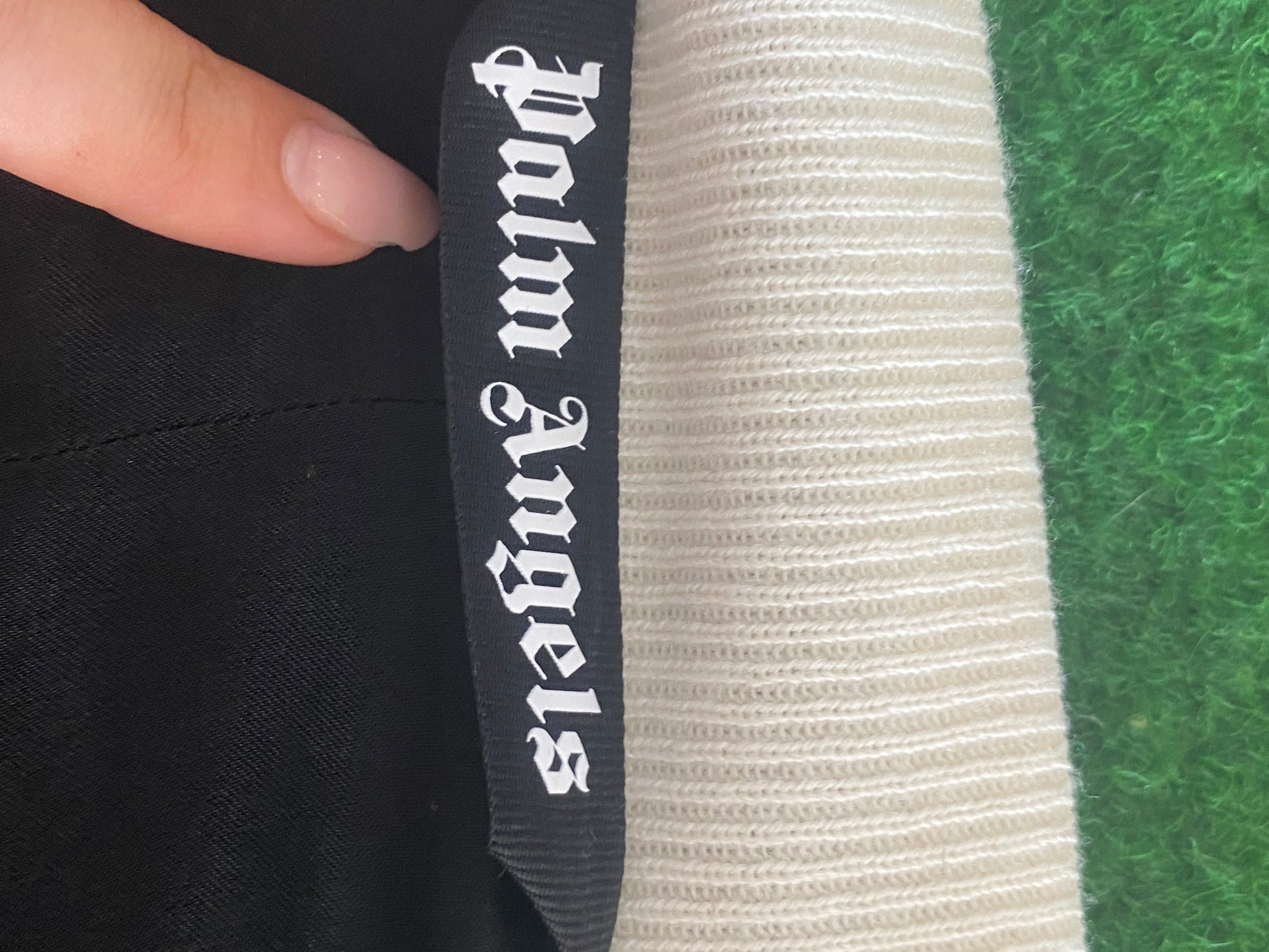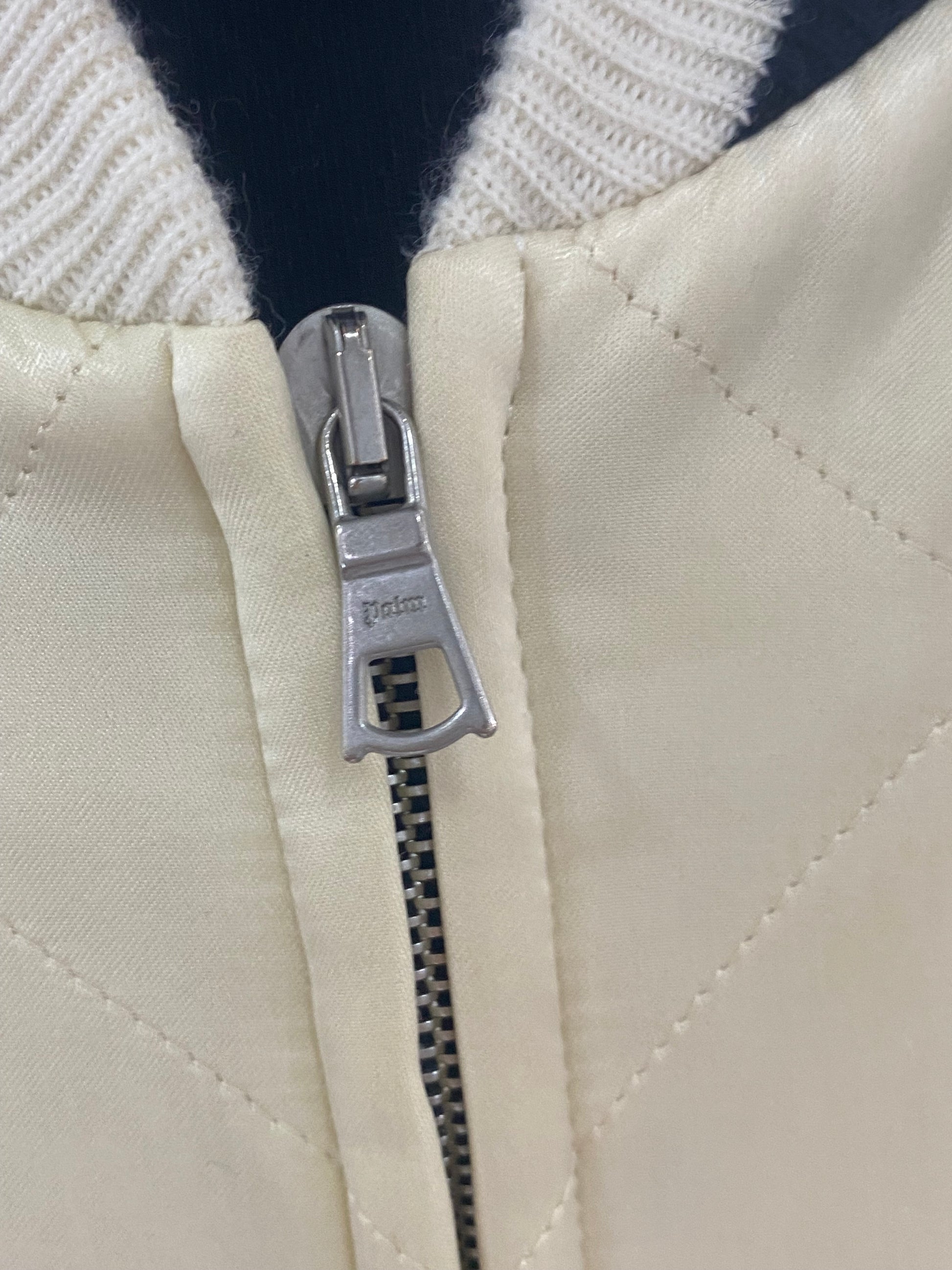 Giacca Palm Angels Bomber colore avorio con maniche grigi e strisce avario. Con ricamo Palme sul retro e avanti