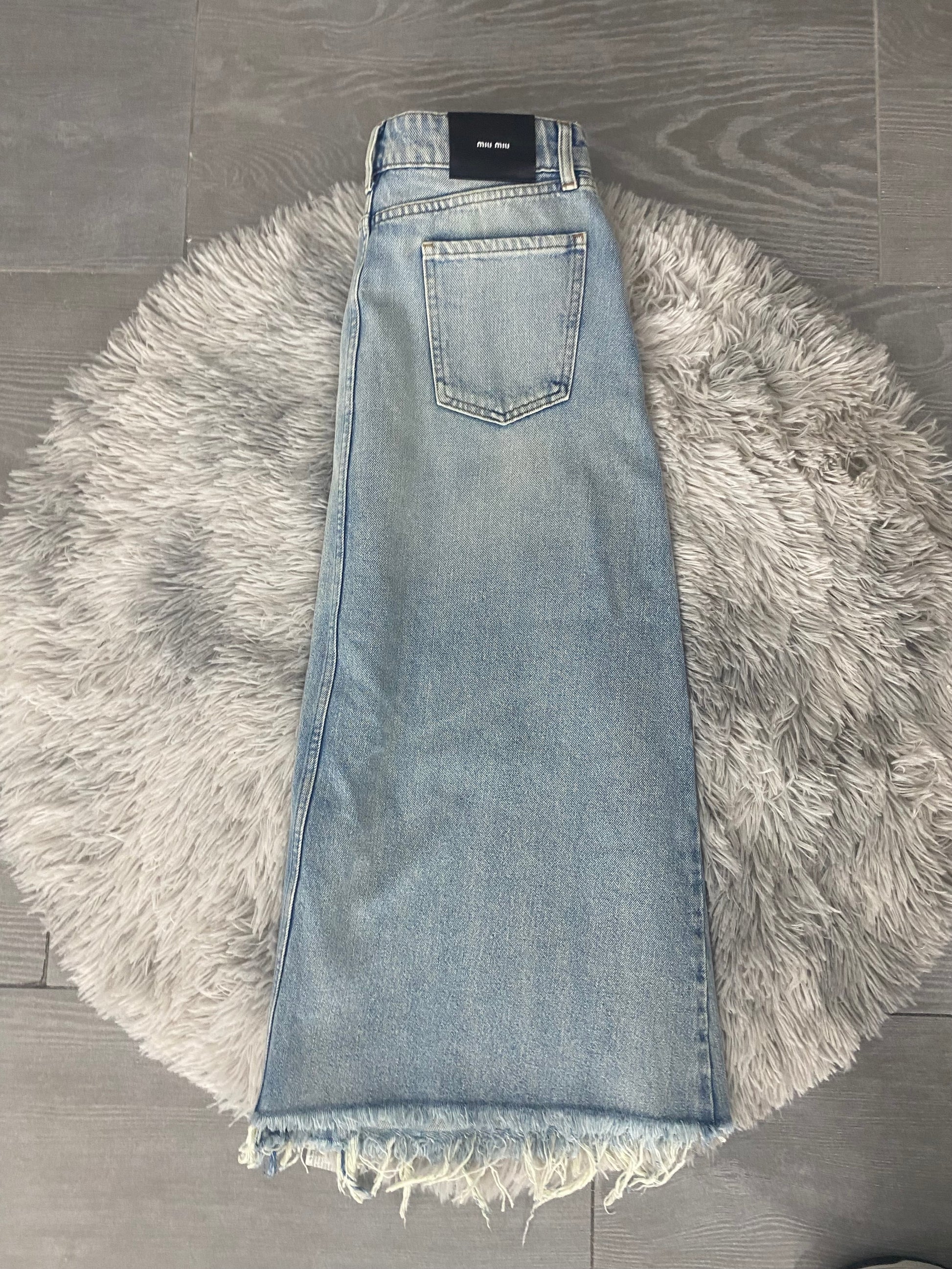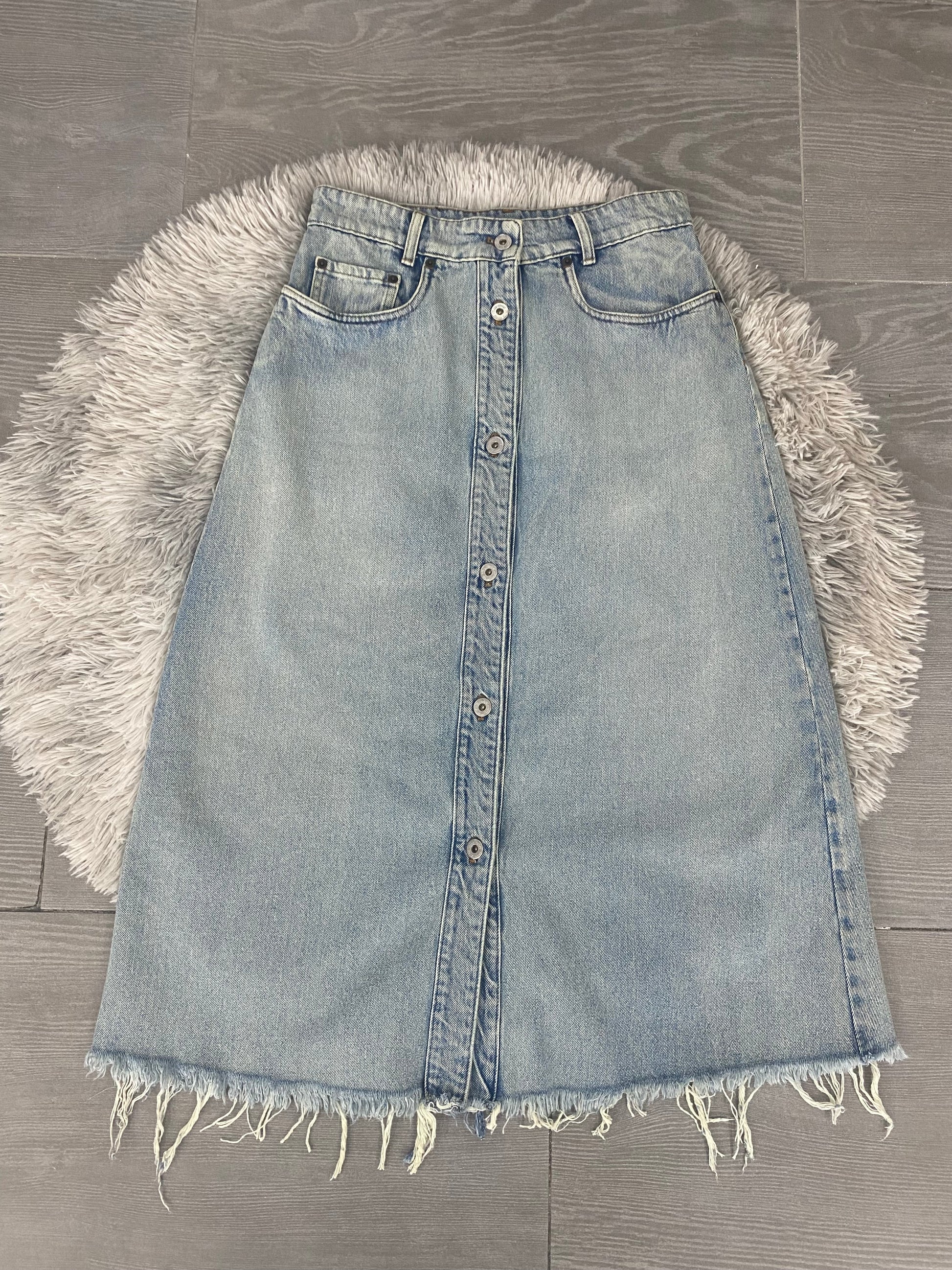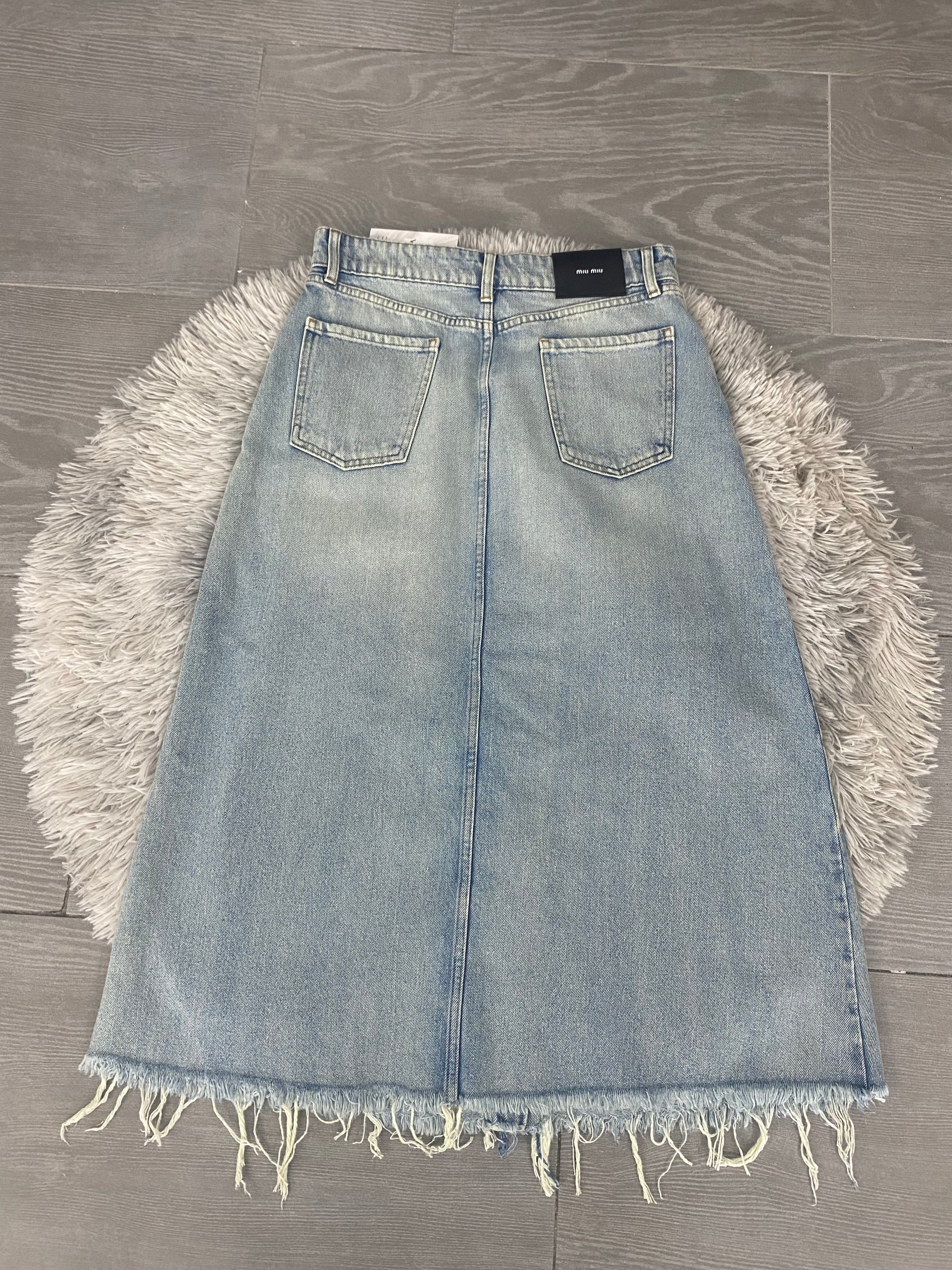 Gonna in denim Miu Miu, con chiusura a bottoni frontali. Gonna Lunga con orlo inferiore sfilacciato.