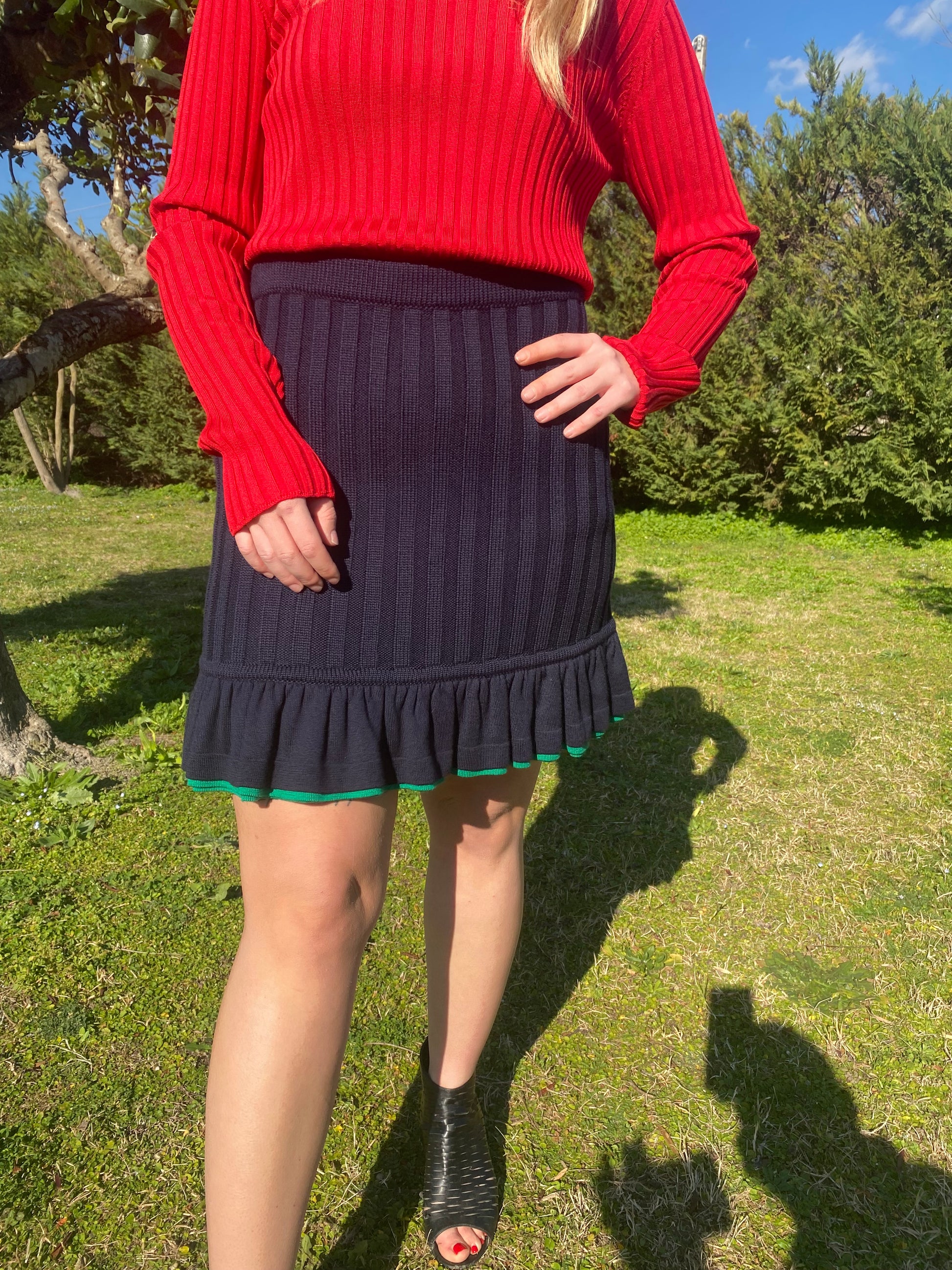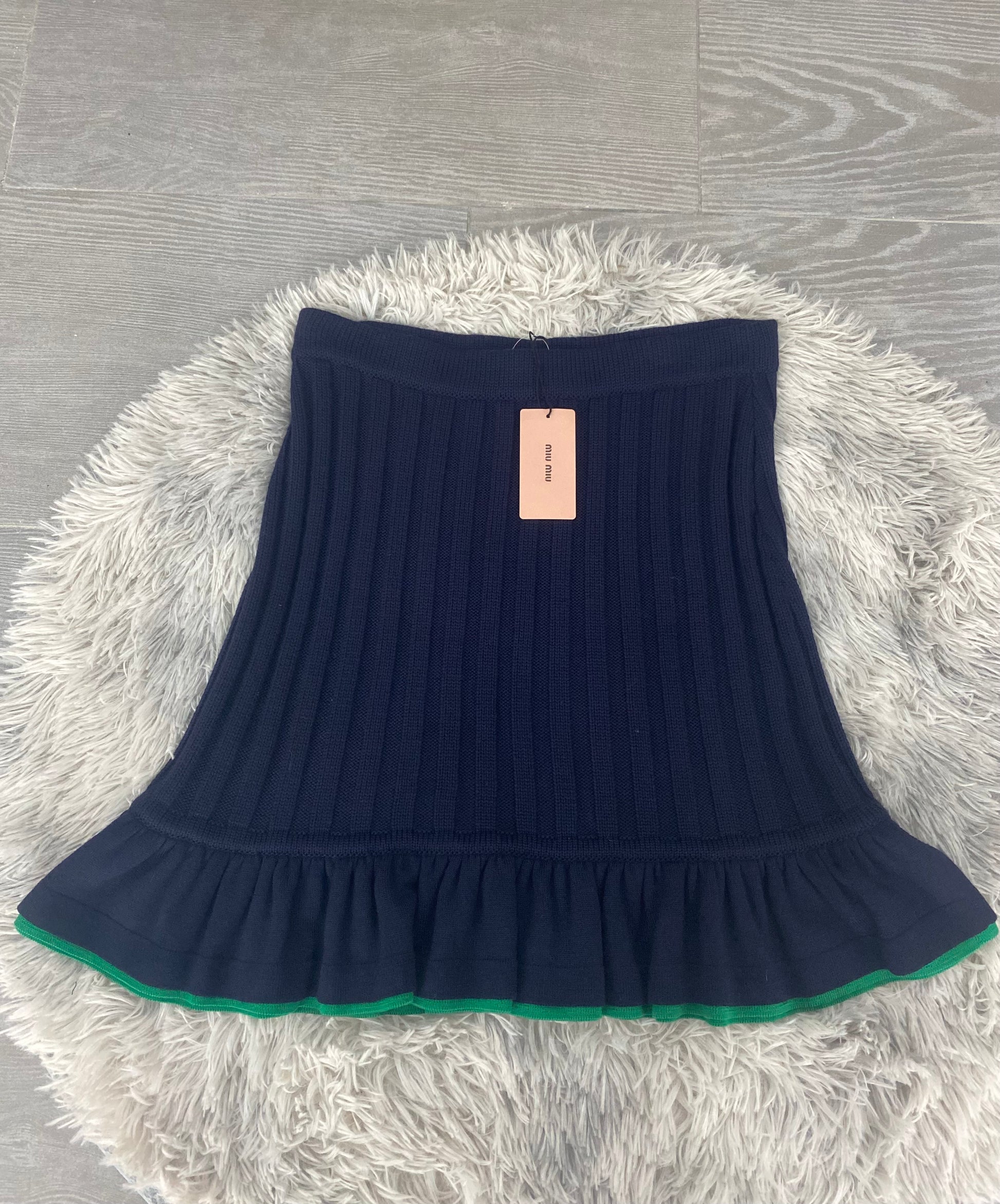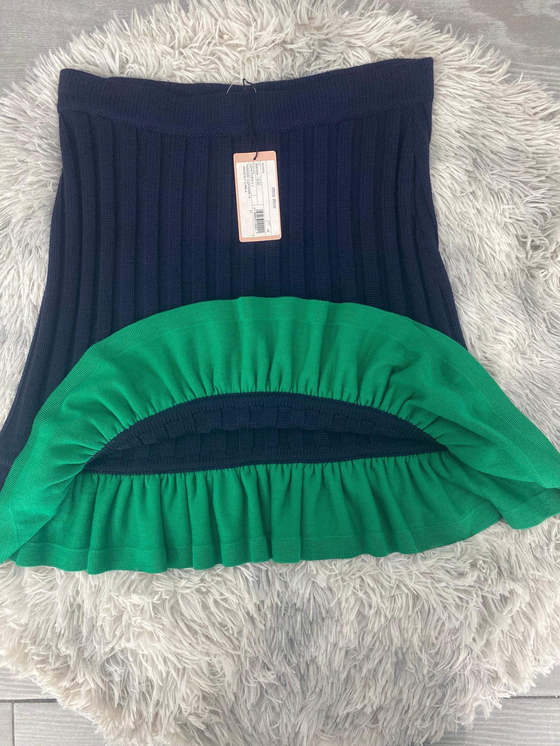 Gonna Miu Miu in lama colore blu scuro, con dettagli colore verde.
