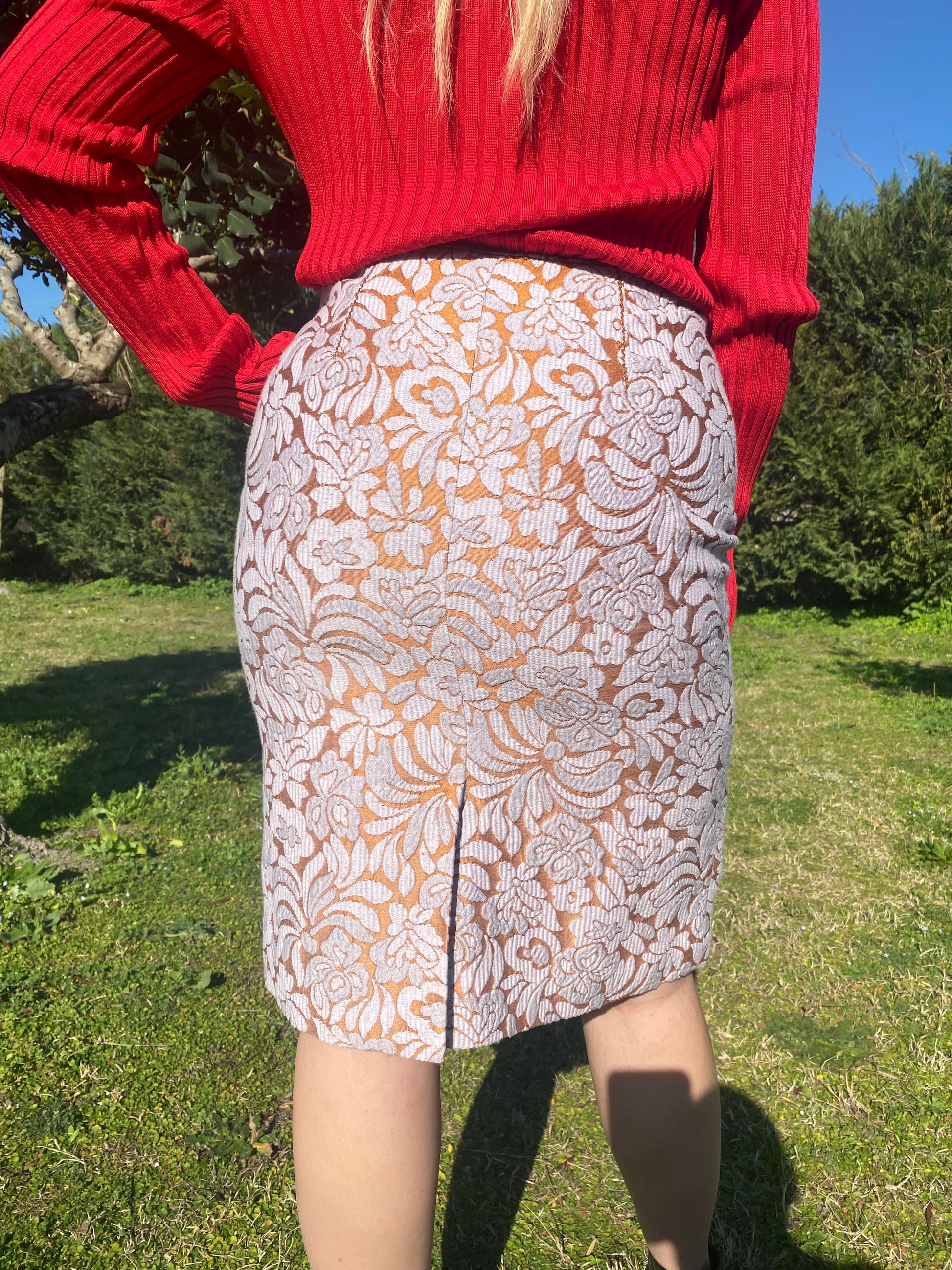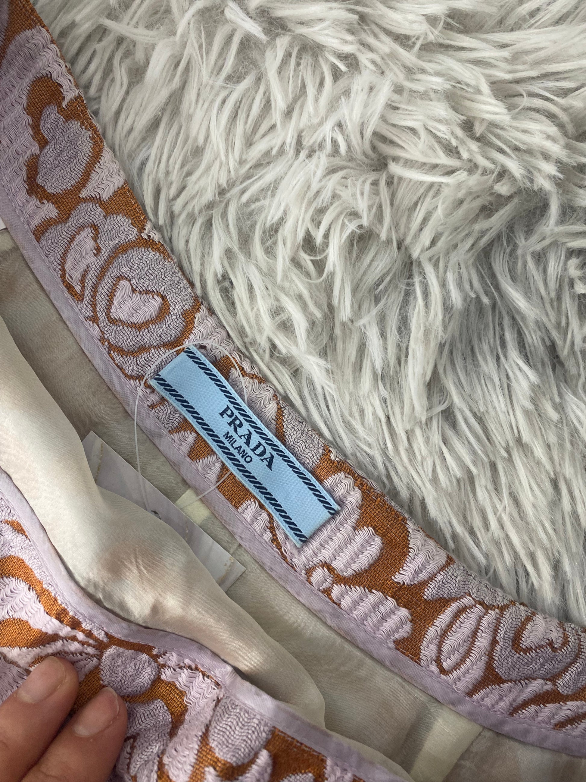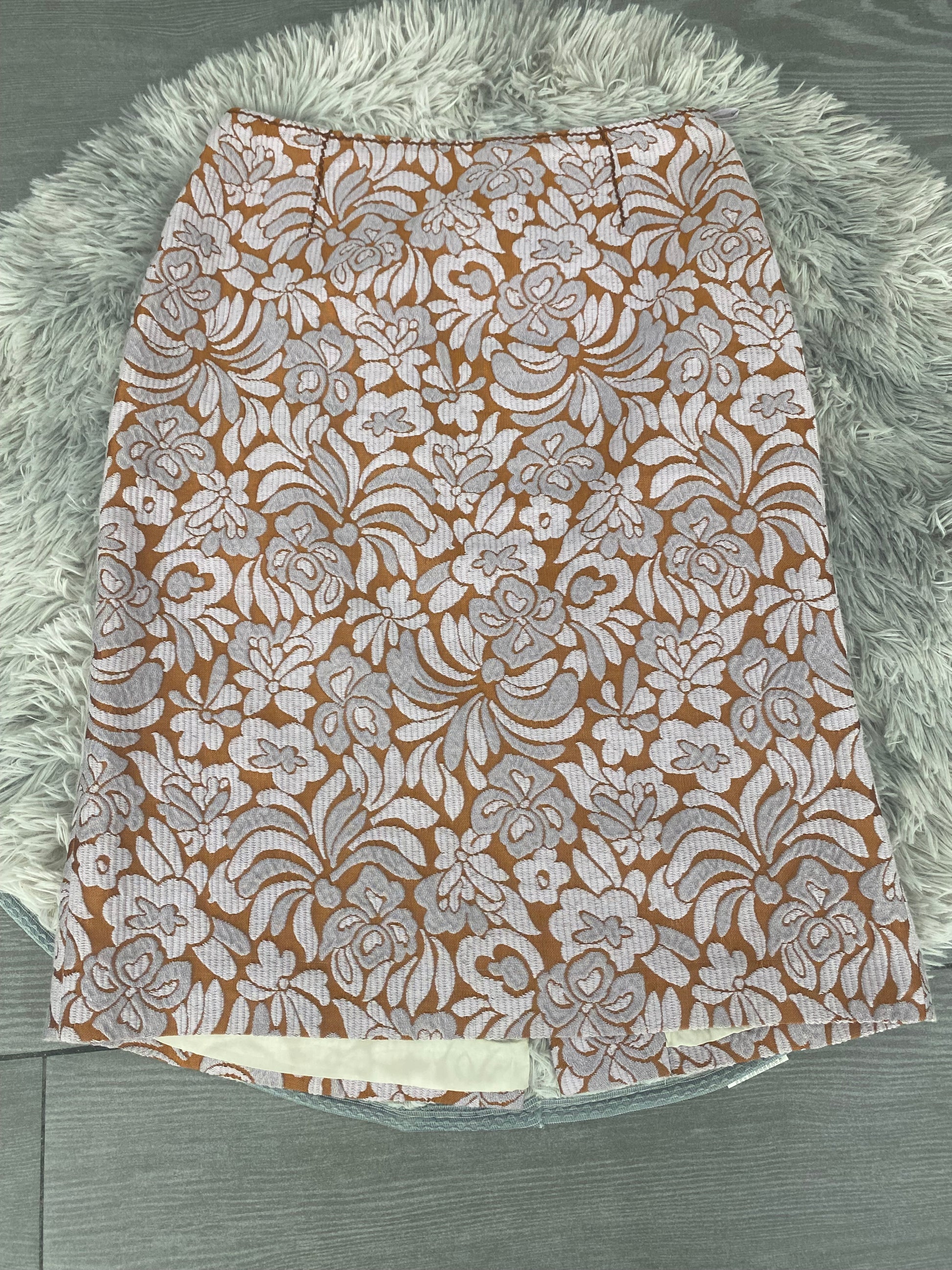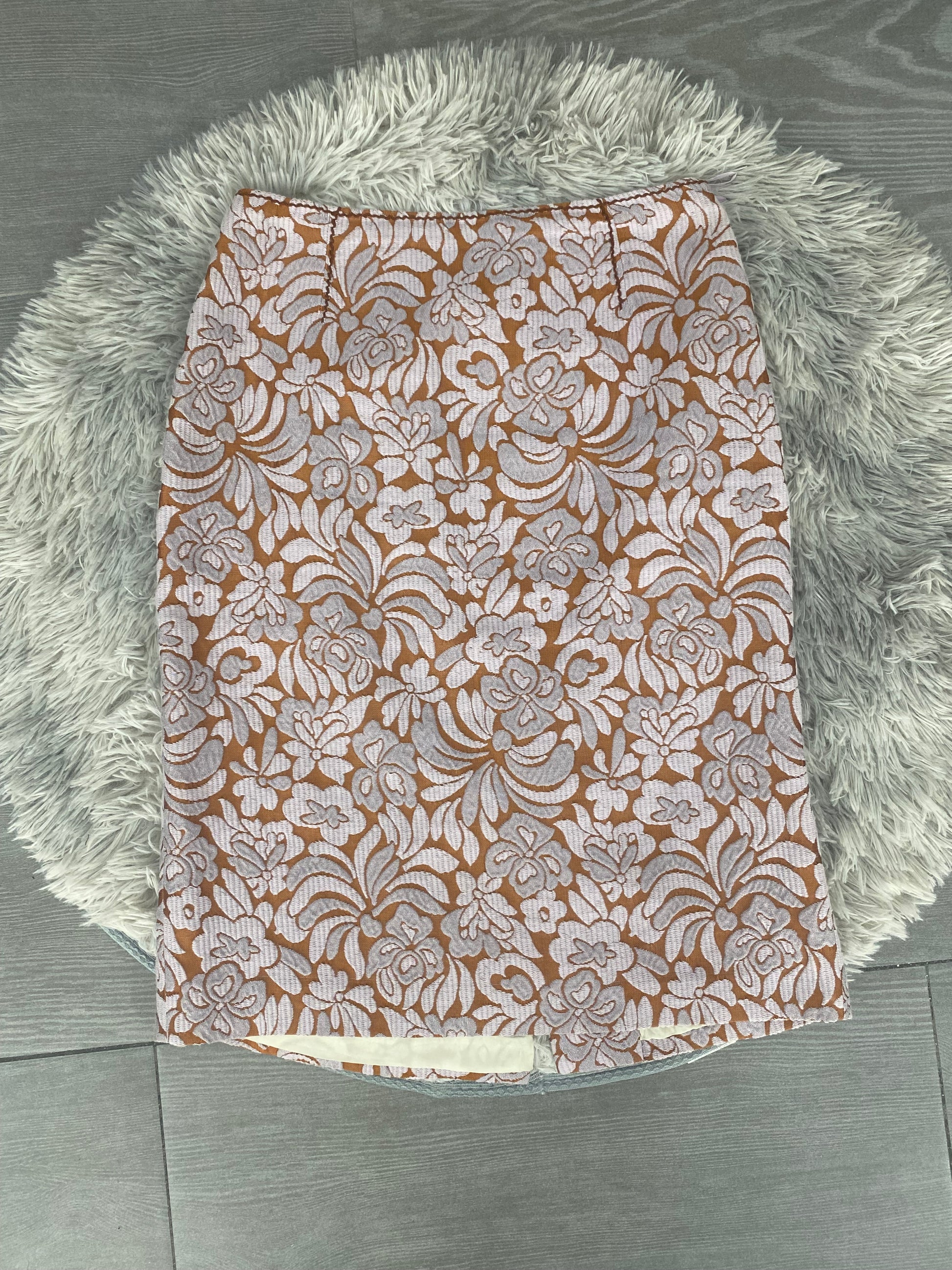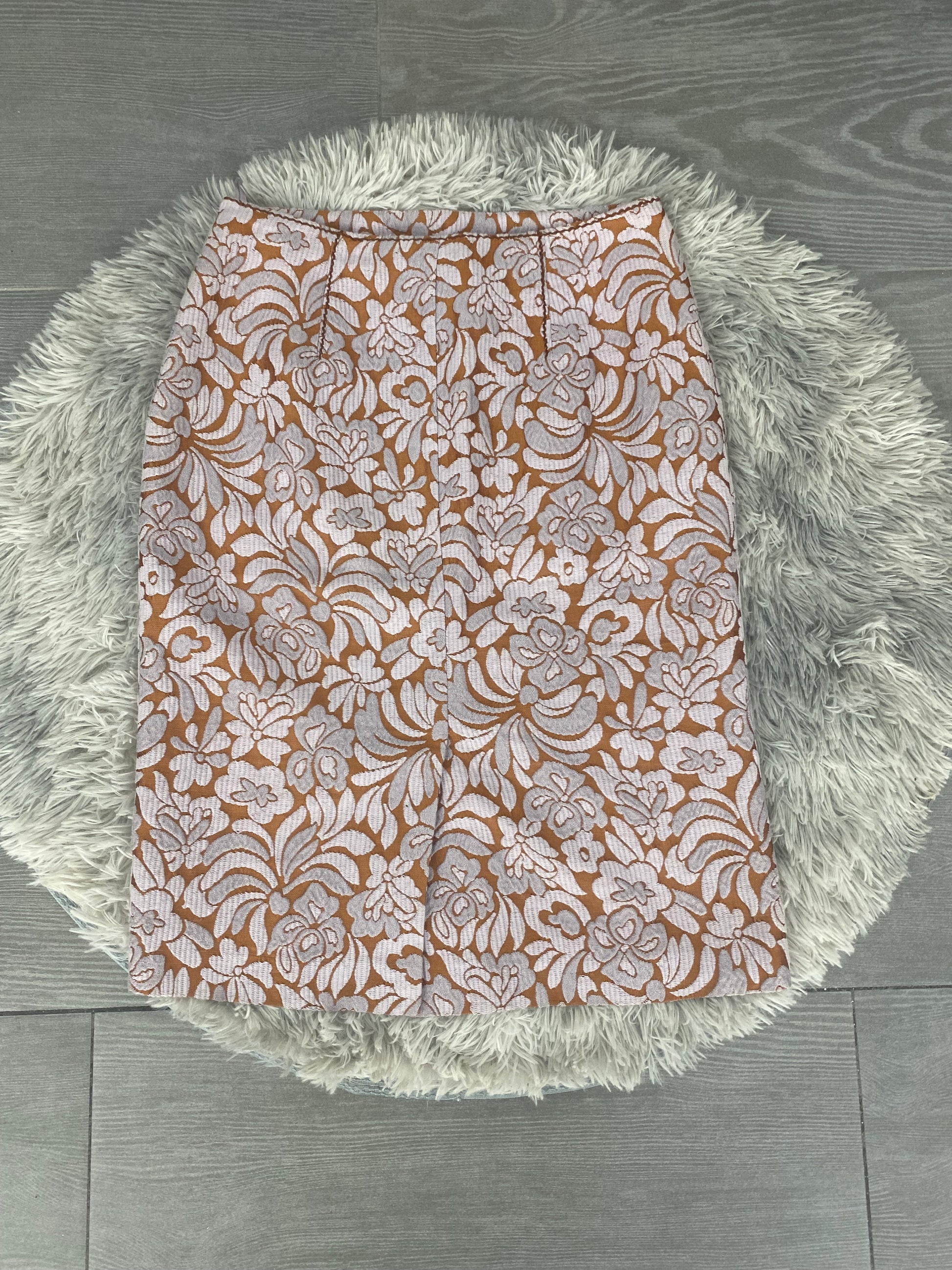 Gonna Prada con ricamo floreale rosa e arancione.