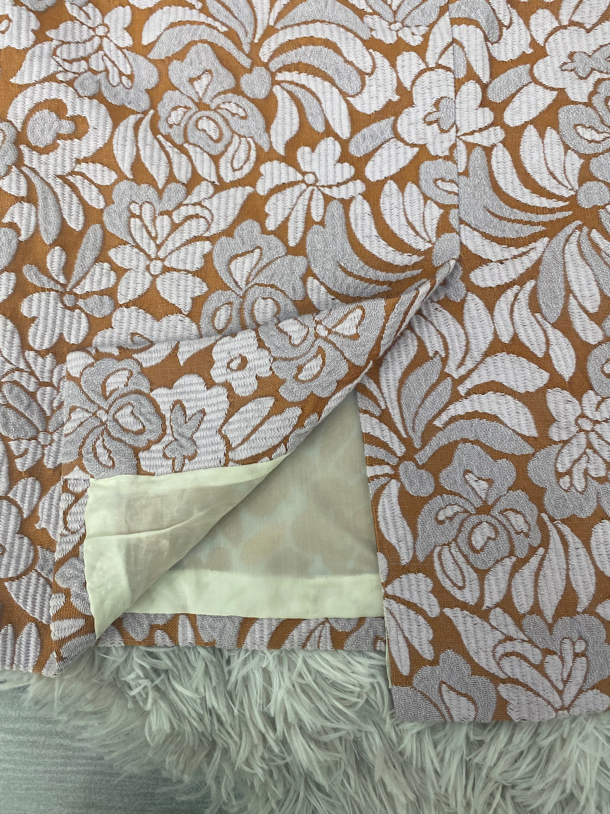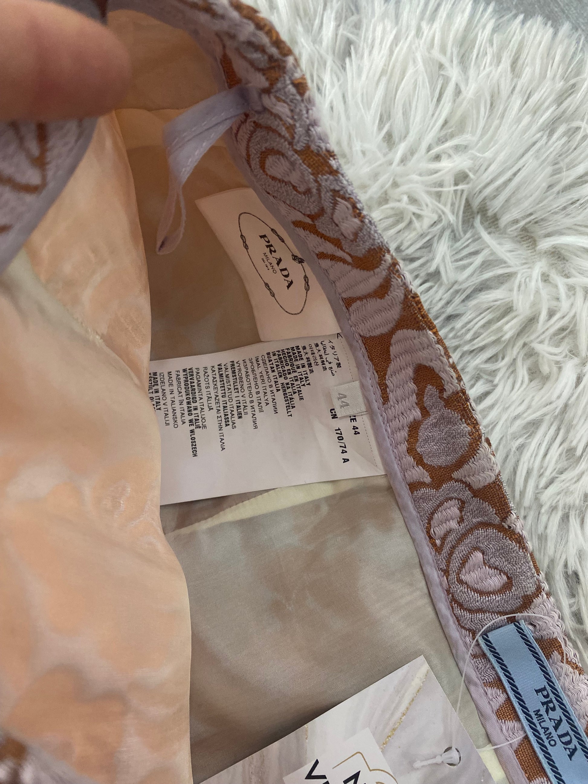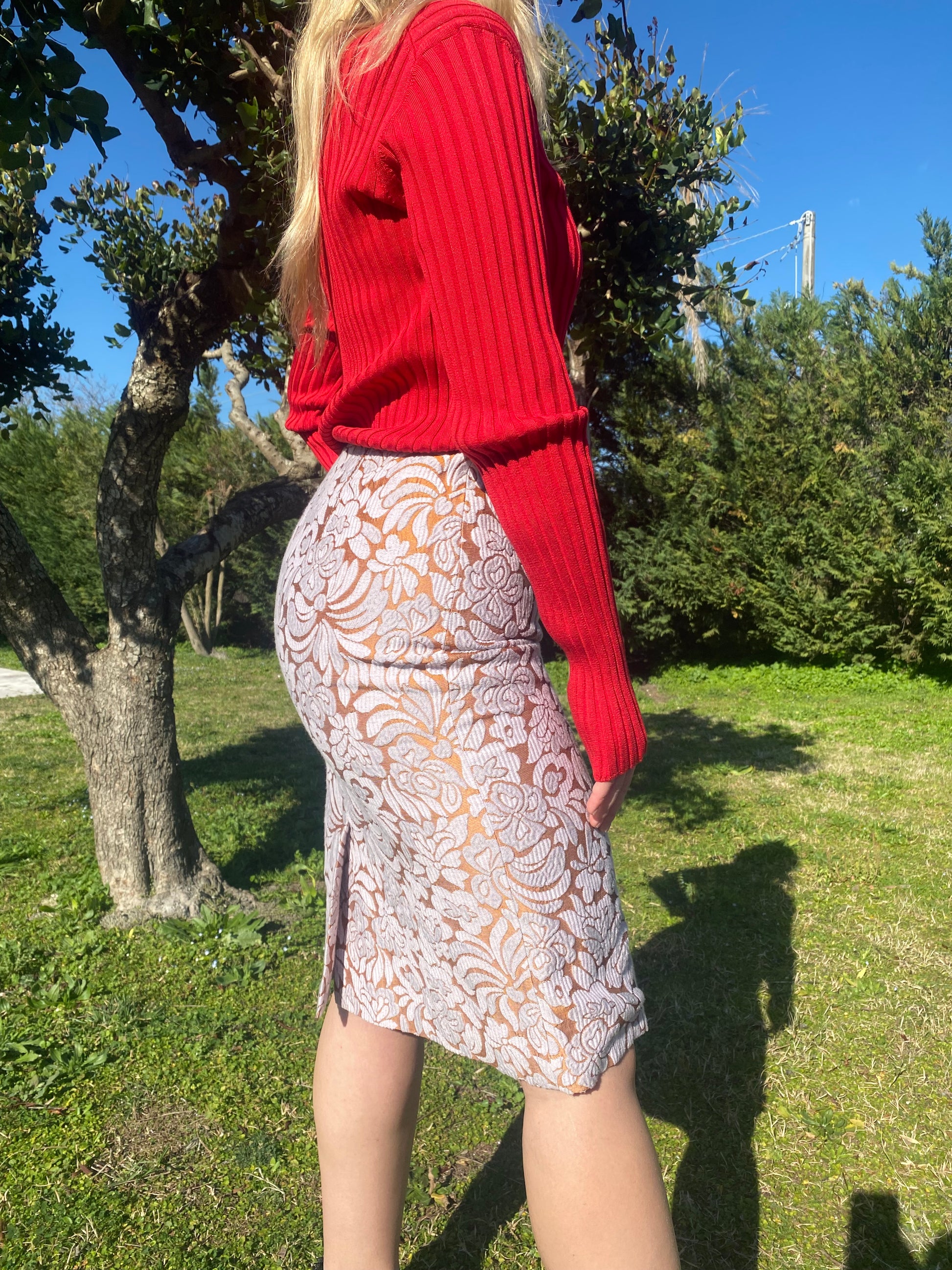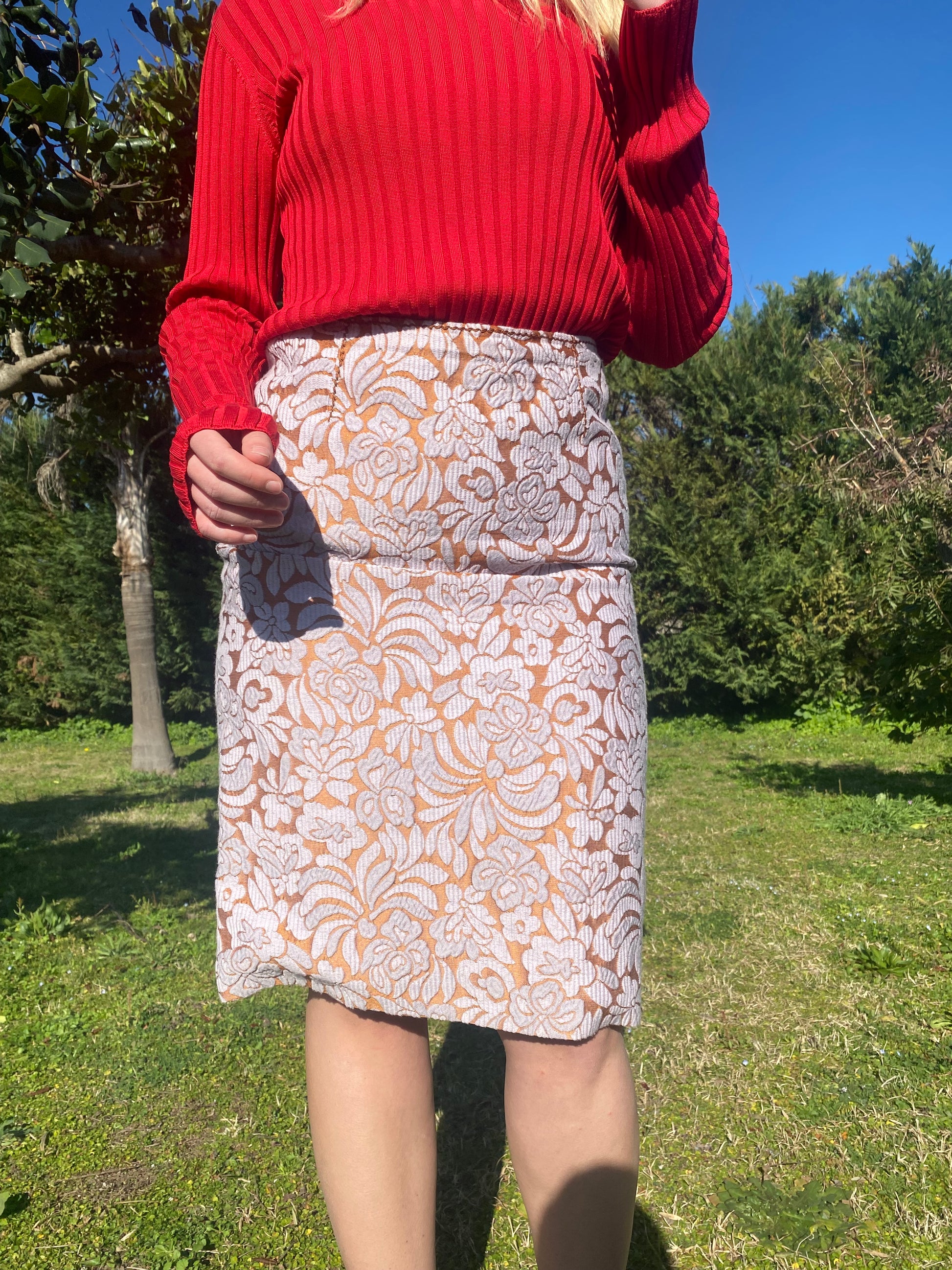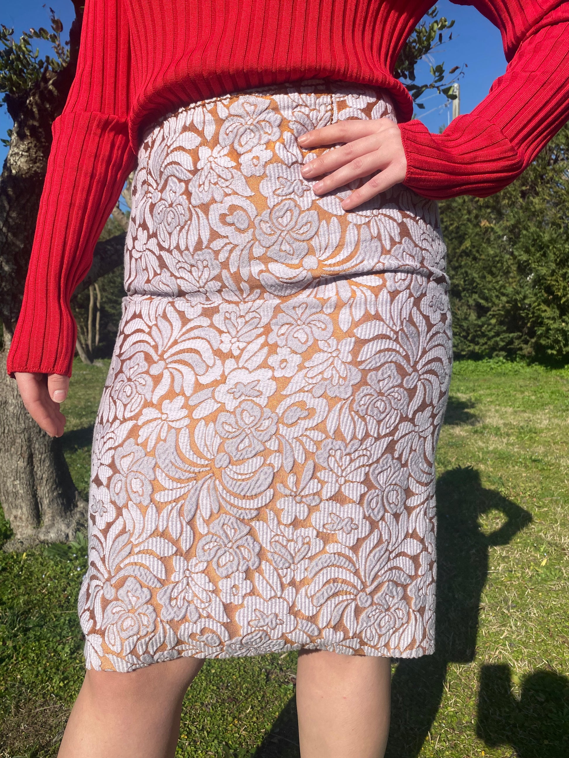 Gonna Prada con ricamo floreale rosa e arancione.