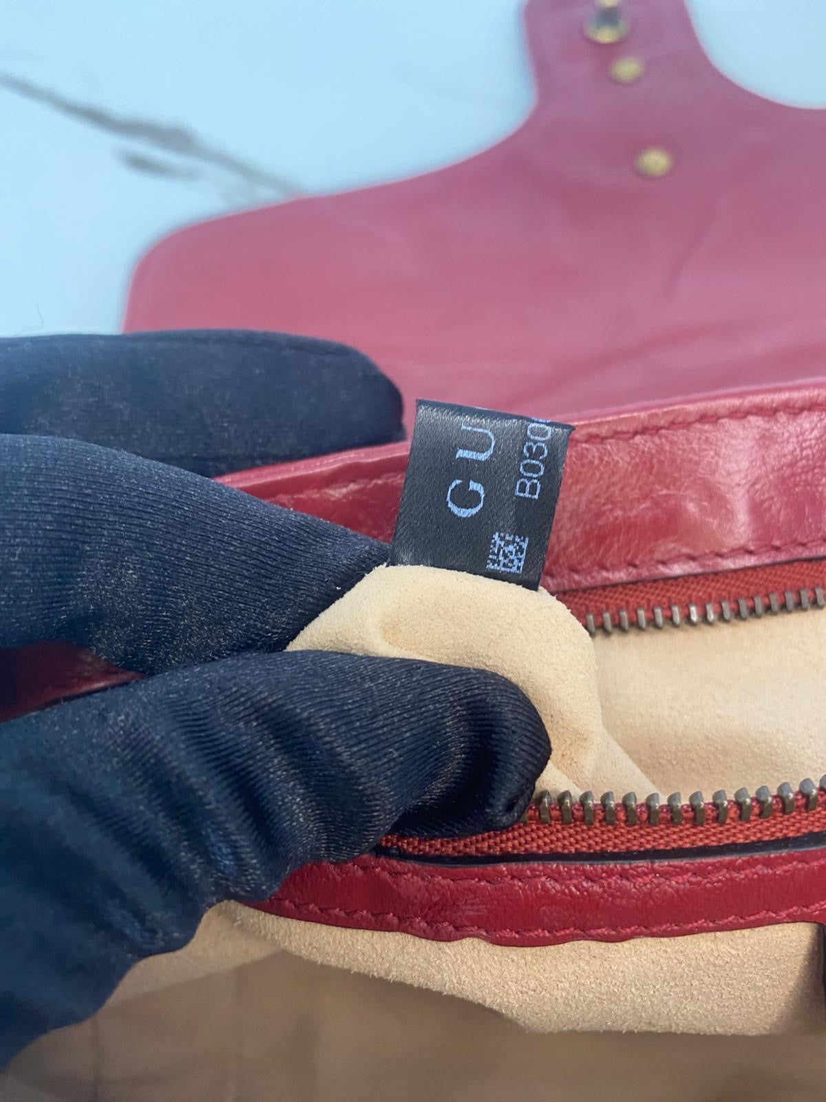 Borsa Gucci Marmont GG Flap in pelle nera e dettagli in pelle rossa. Con hardware oro e logo frontale con GG intrecciate.
