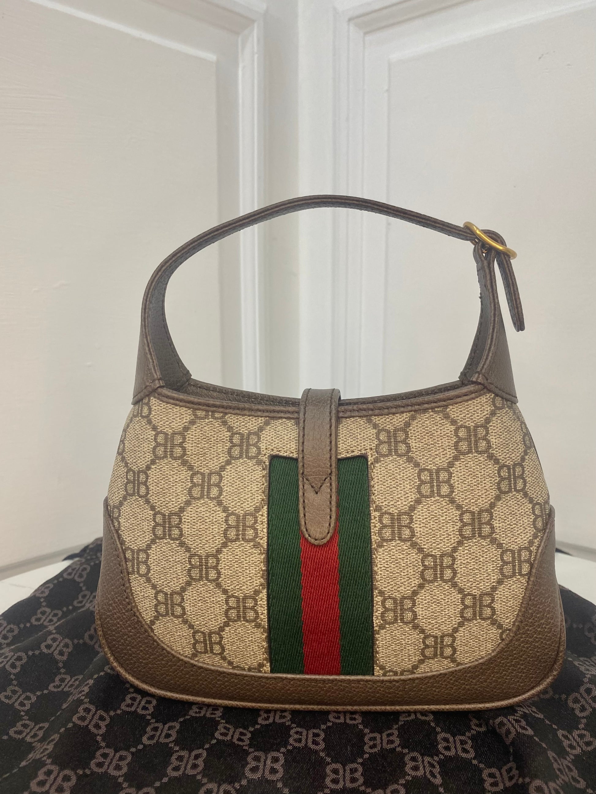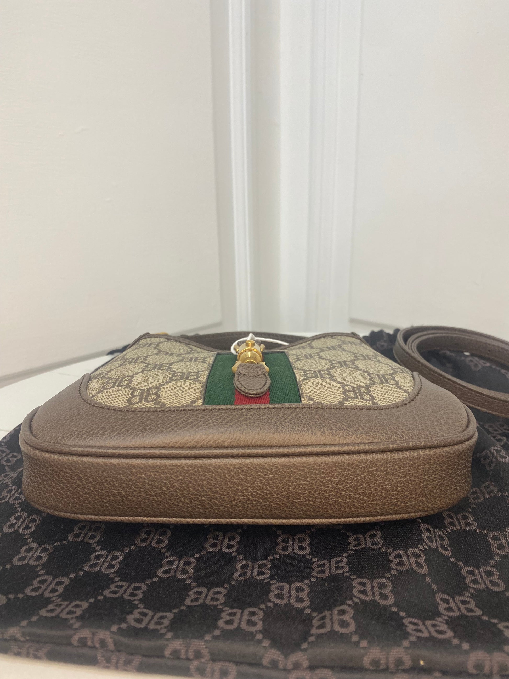 Borsa Gucci X Balenciaga Mini Jackie in Tela Denim logata Balenciaga e finiture in pelle marrone. Borsa Limited Edition a Spalla/Tracolla con Manico regolabile e allungabile con tracolla separata. Chiusura a pistone dorata. •Condizioni: come NUOVA , mai indossata completa di cartellino •Completa della sua tracolla supplementare, dust bag e cartellini.