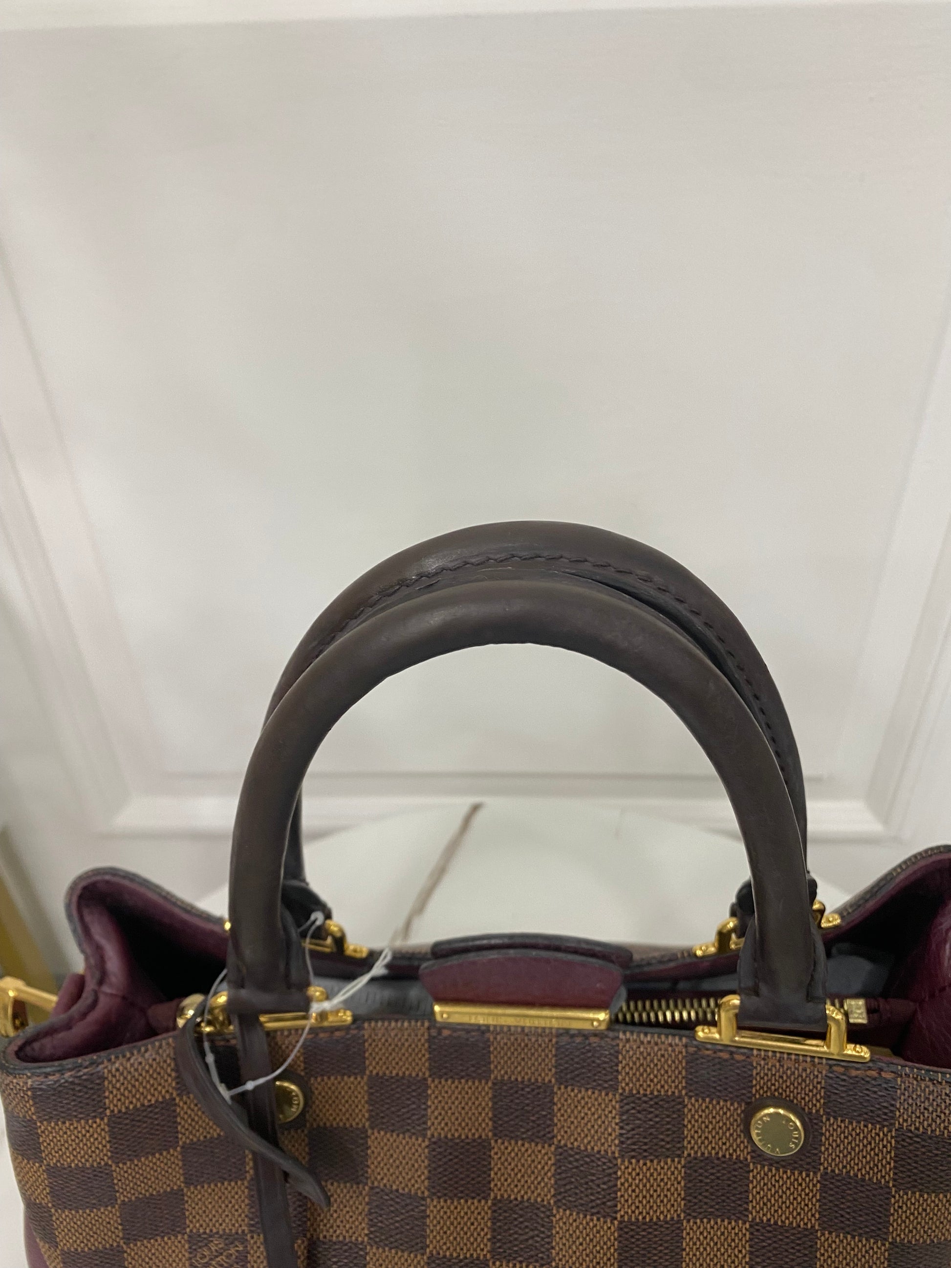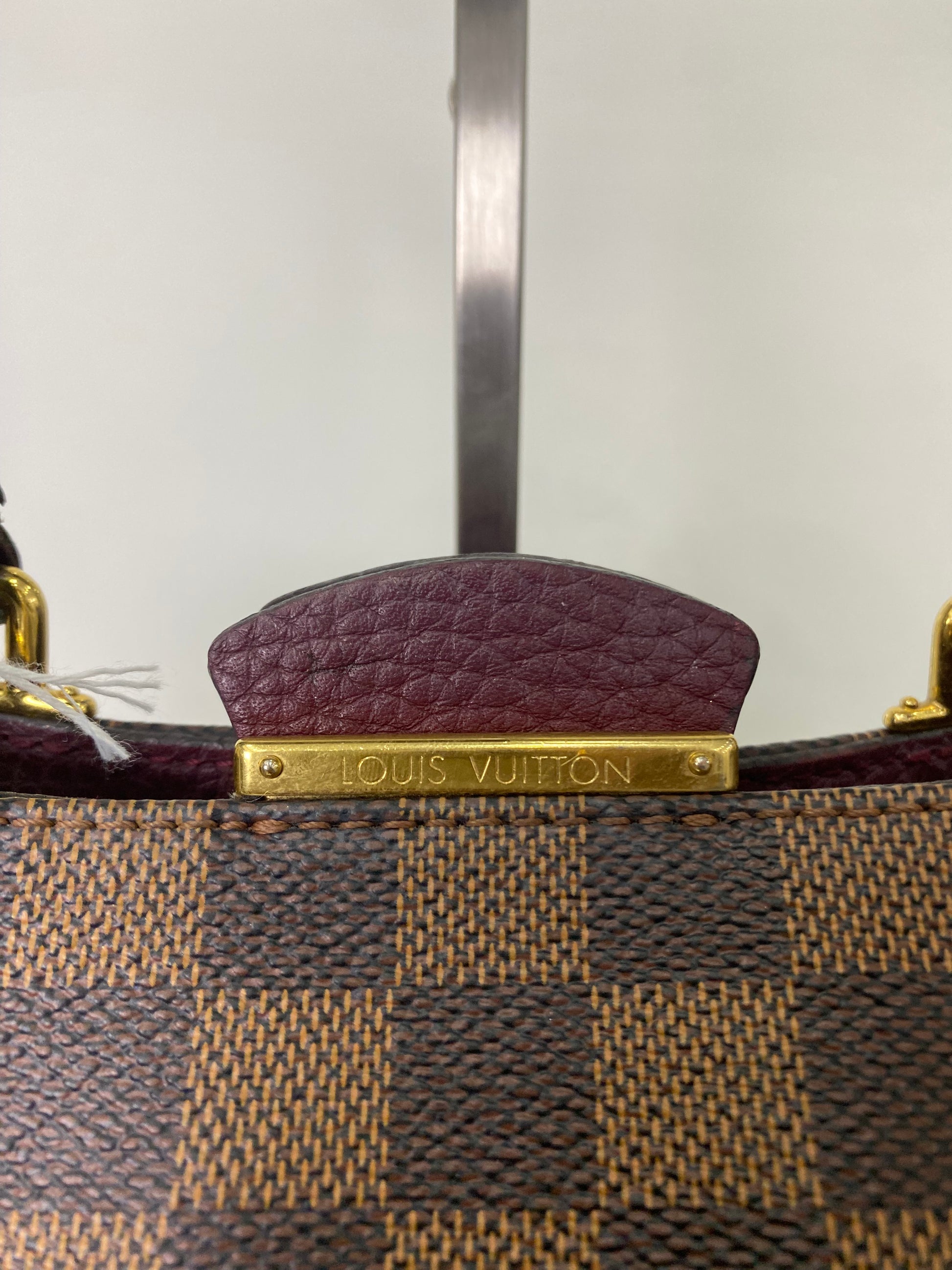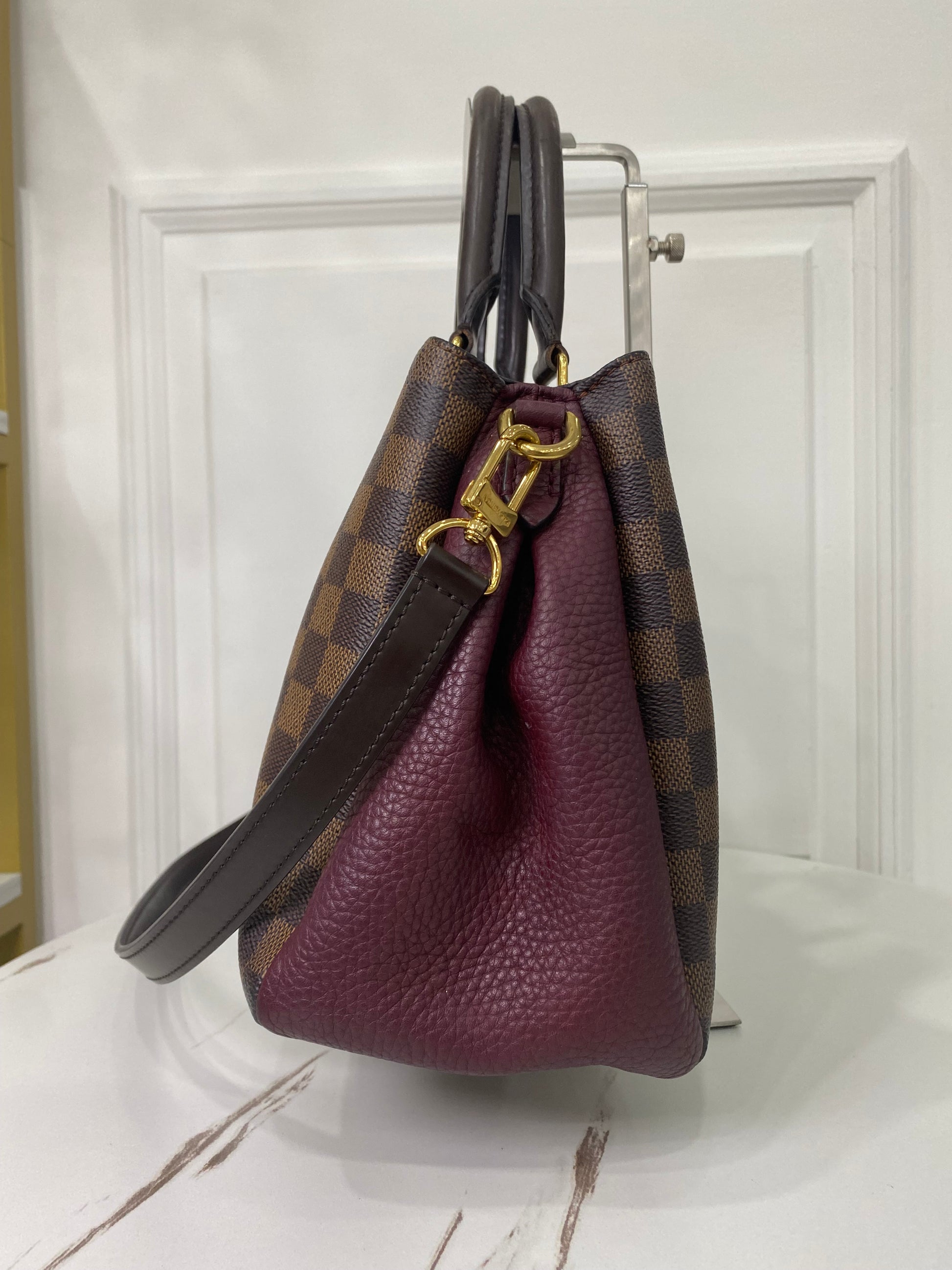 Louis Vuitton Brittany in tela Damier Ébène e dettagli in pelle martellata bordeaux laterale. Con hardware oro.
