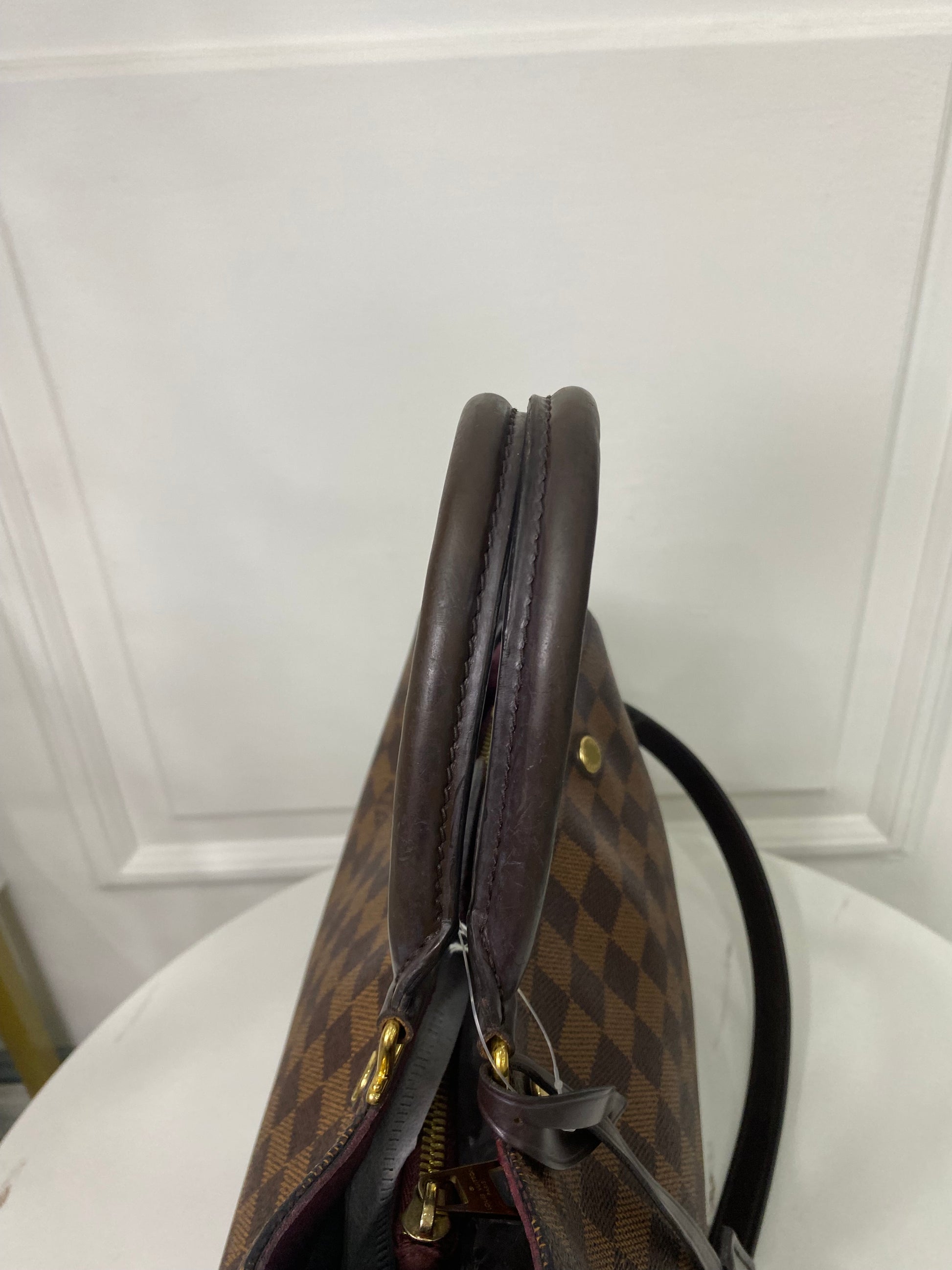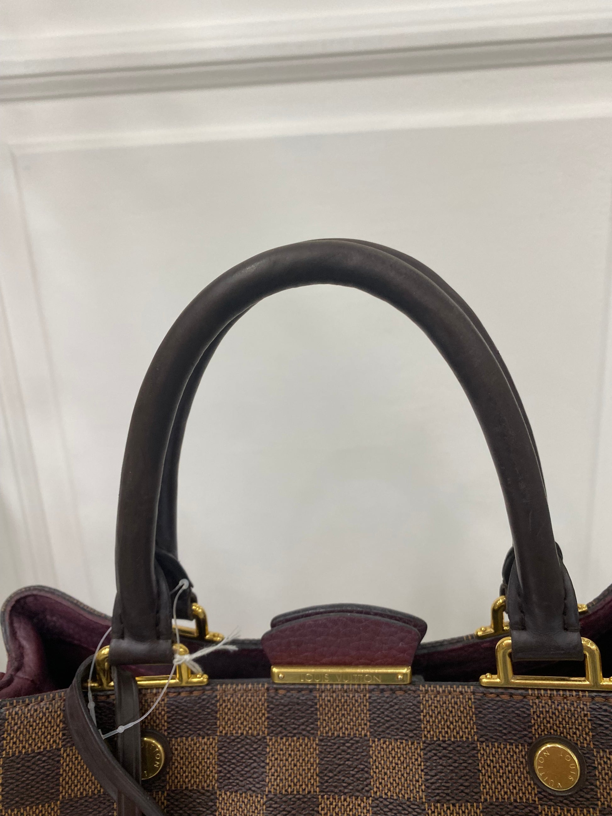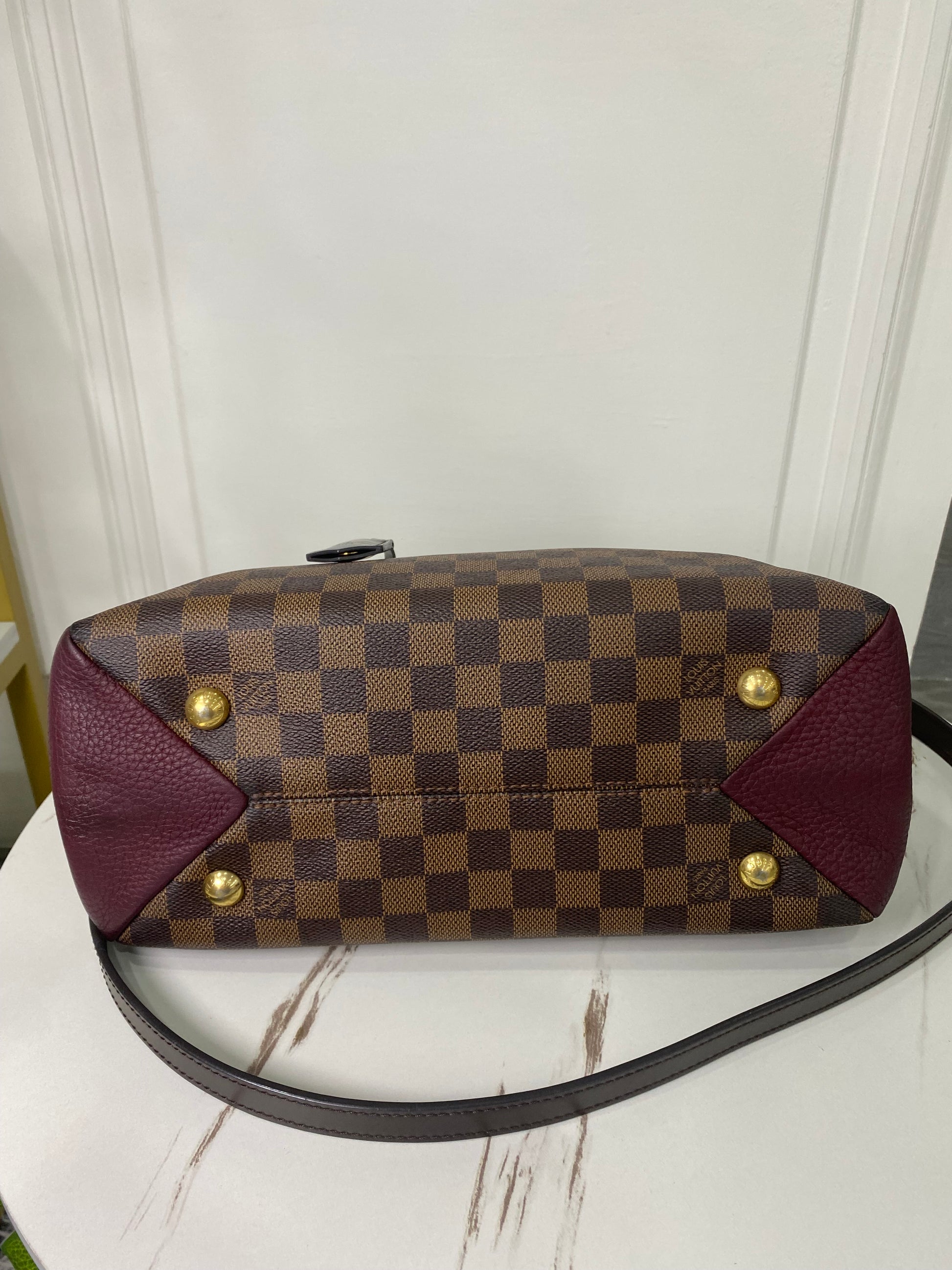 Louis Vuitton Brittany in tela Damier Ébène e dettagli in pelle martellata bordeaux laterale. Con hardware oro.