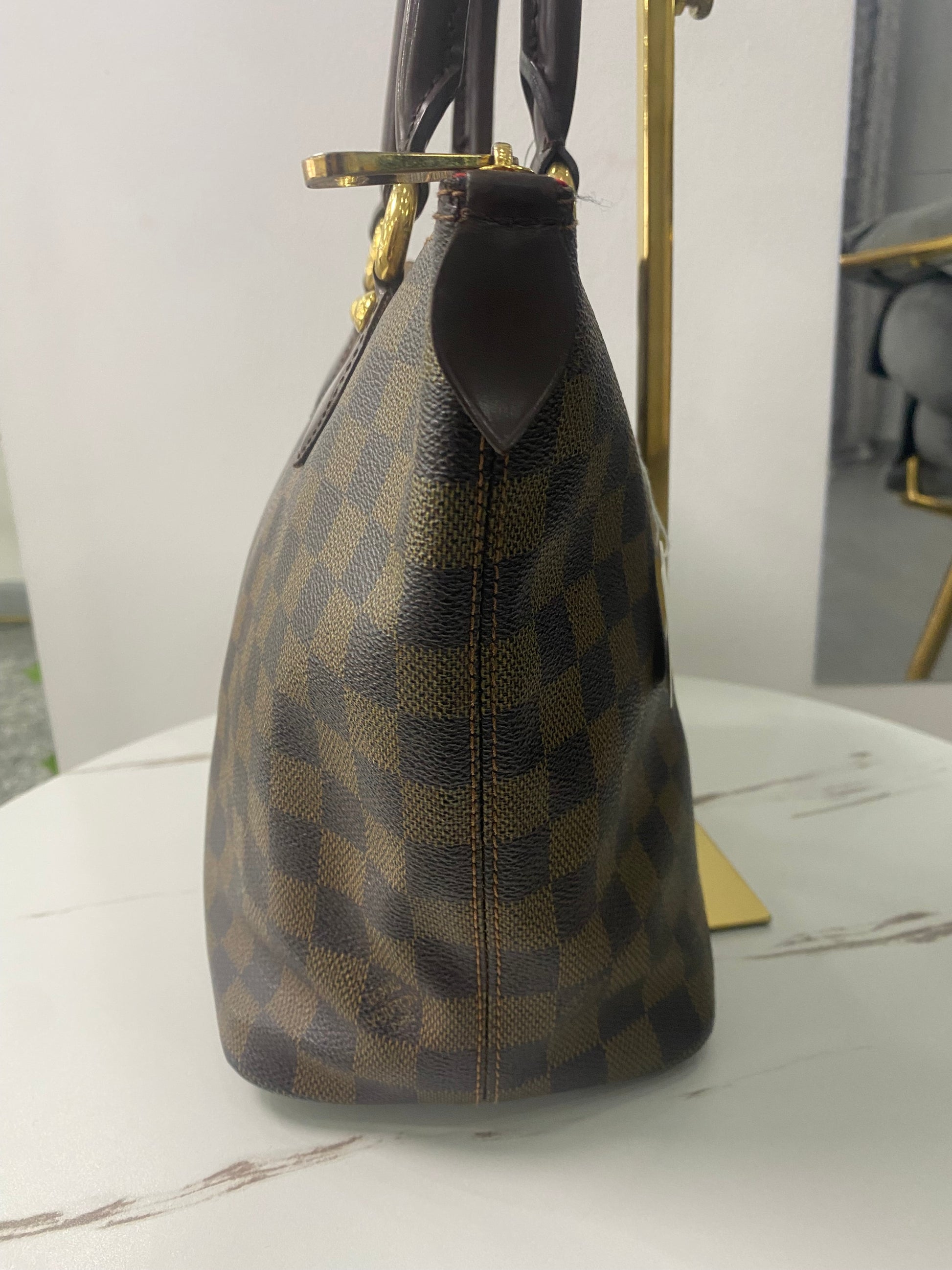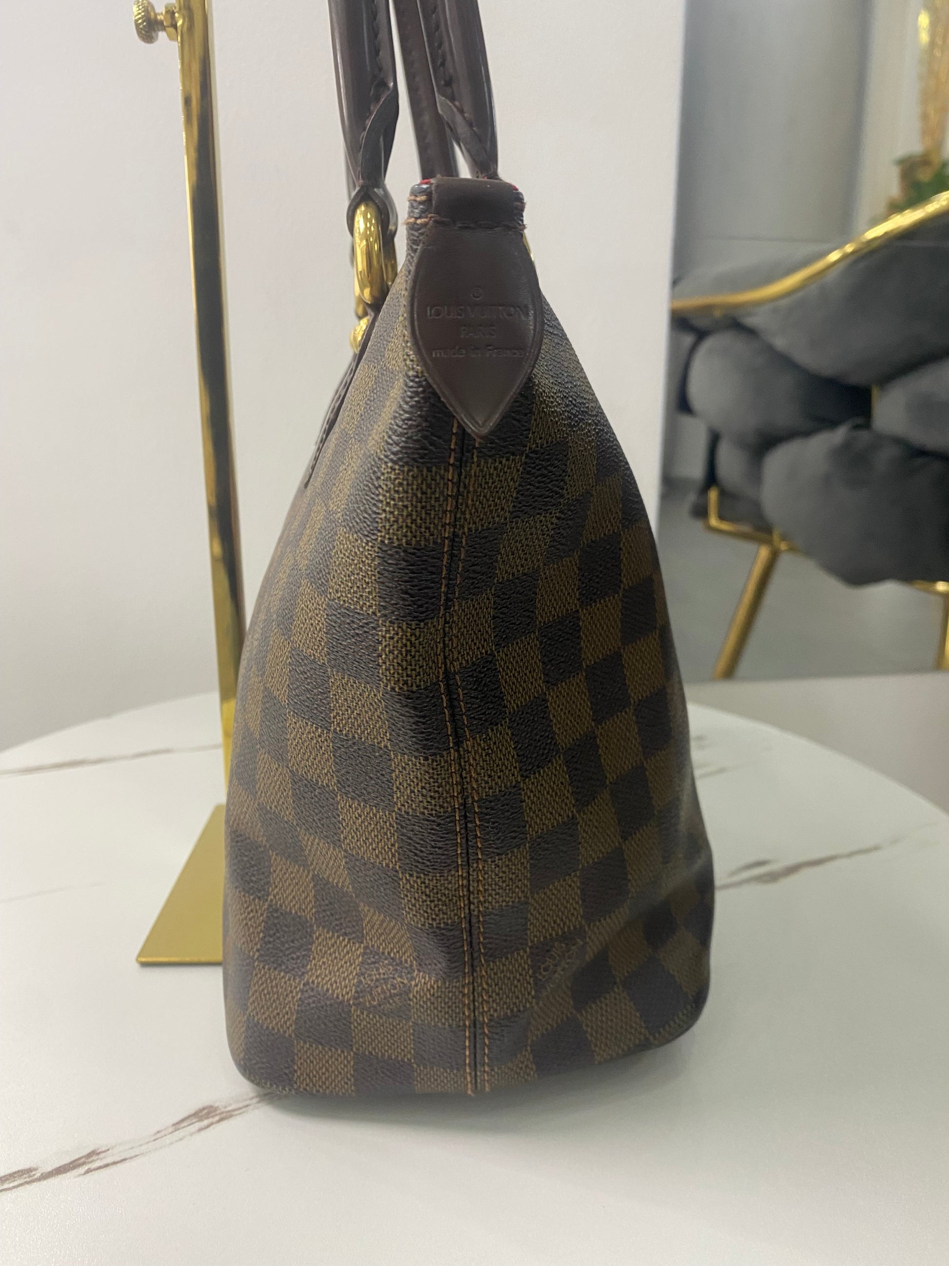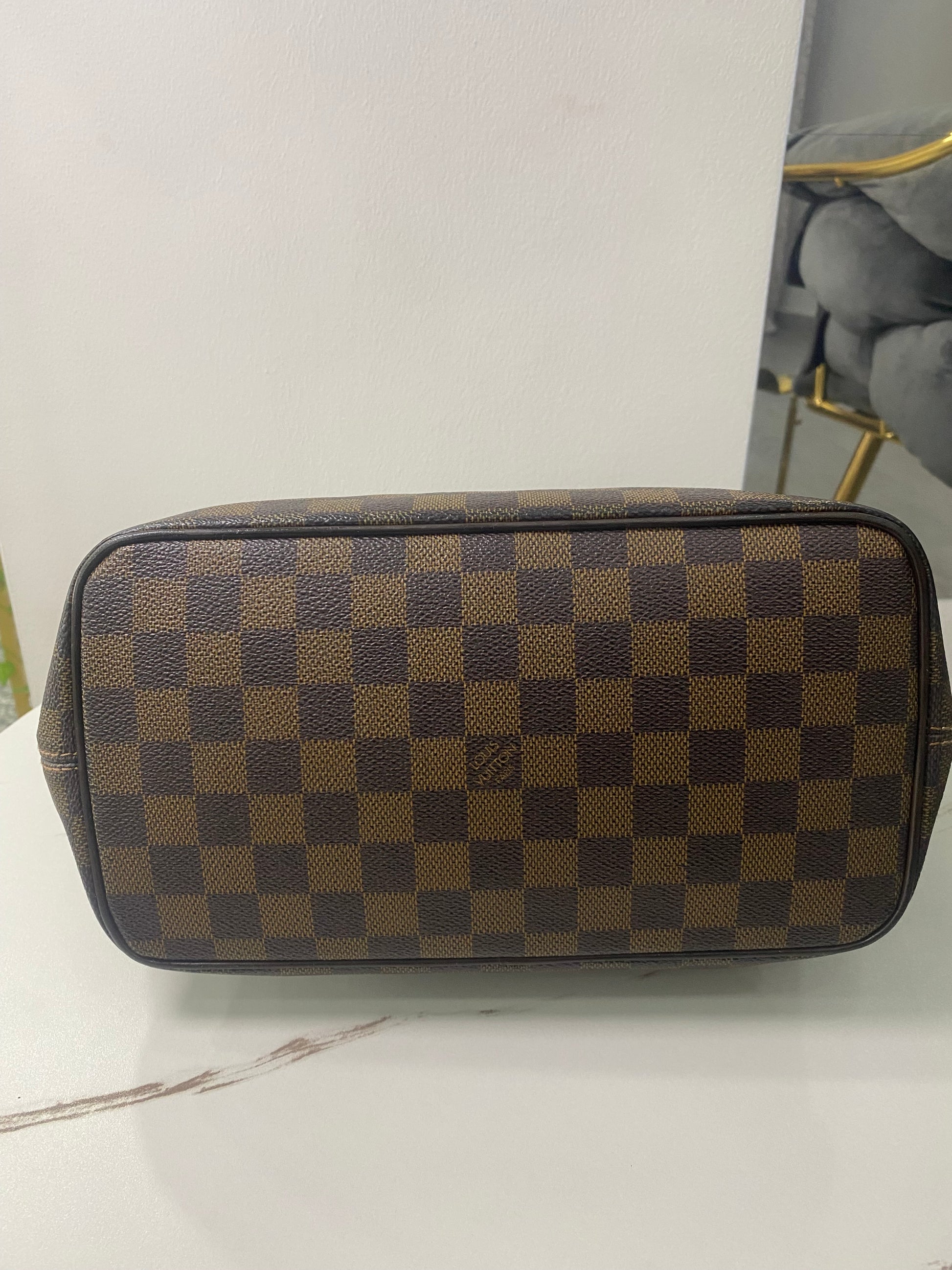 Borsa Louis Vuitton Saleya PM in canvas Damier Ébène e dettagli in pelle marrone.Con hardware oro e chiusura a cerniera.