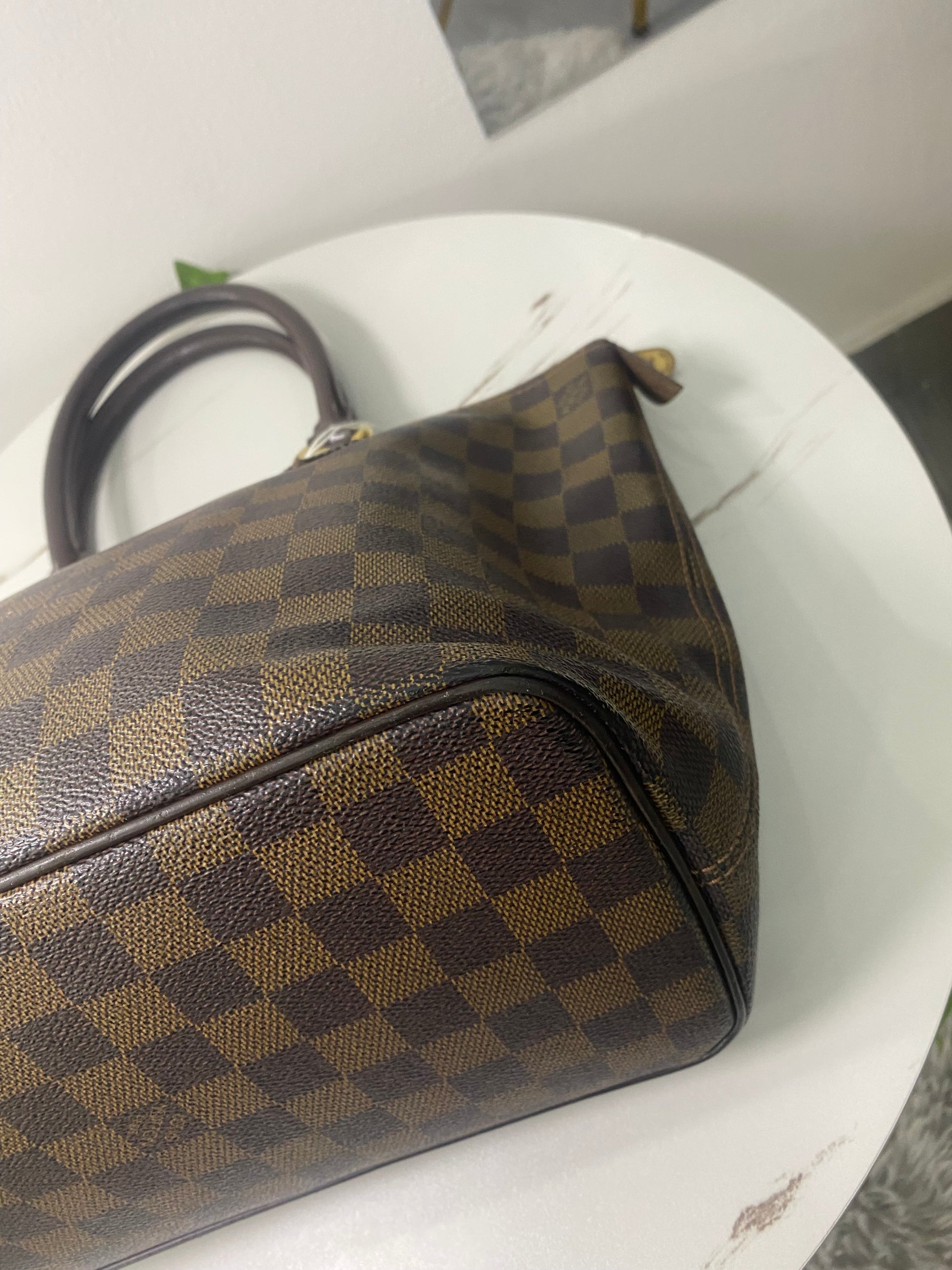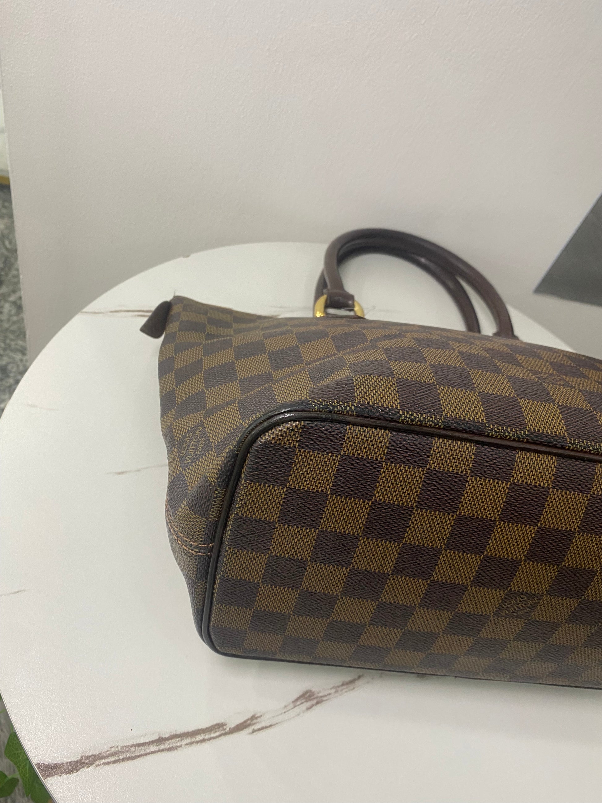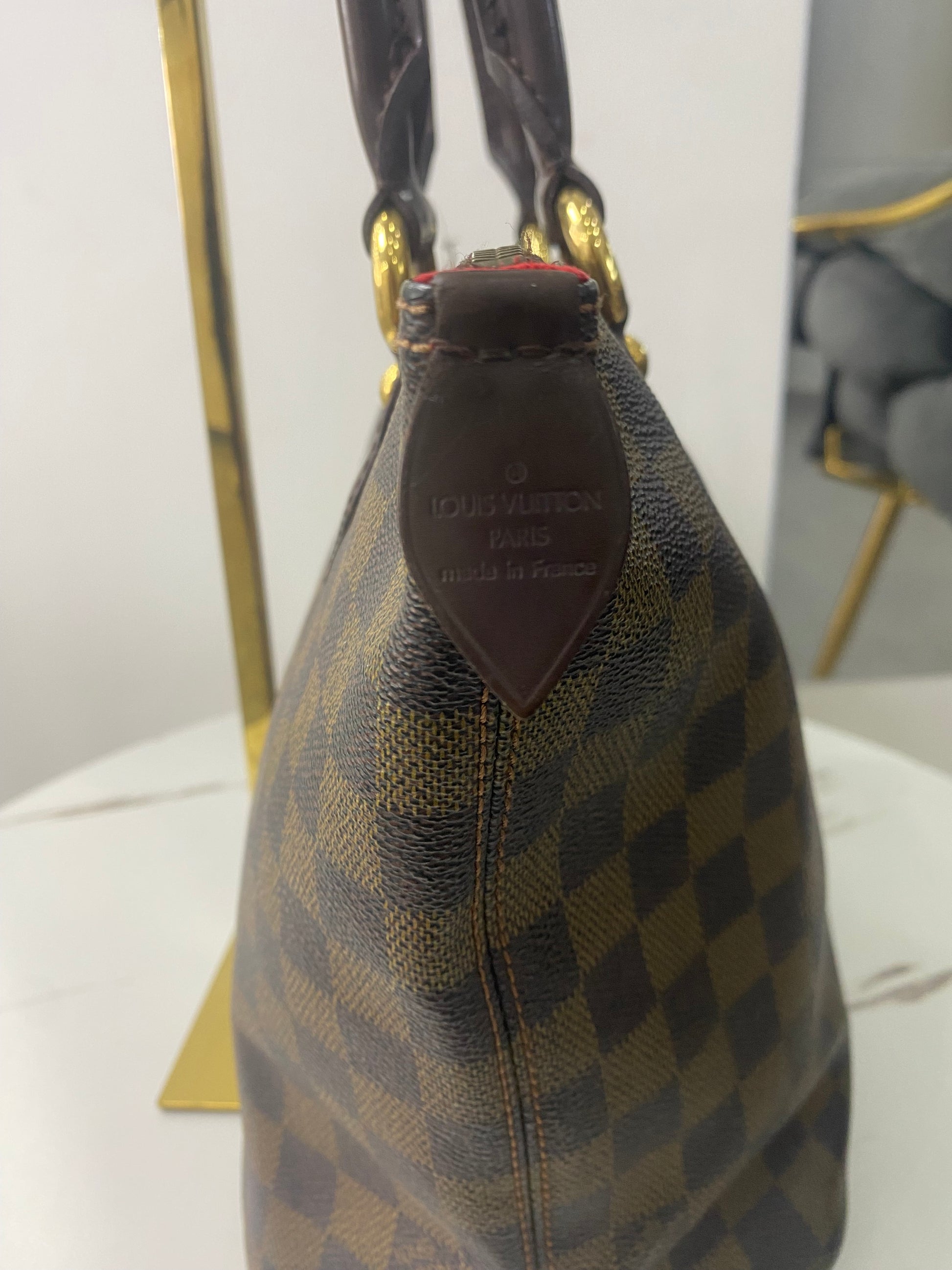 Borsa Louis Vuitton Saleya PM in canvas Damier Ébène e dettagli in pelle marrone.Con hardware oro e chiusura a cerniera.