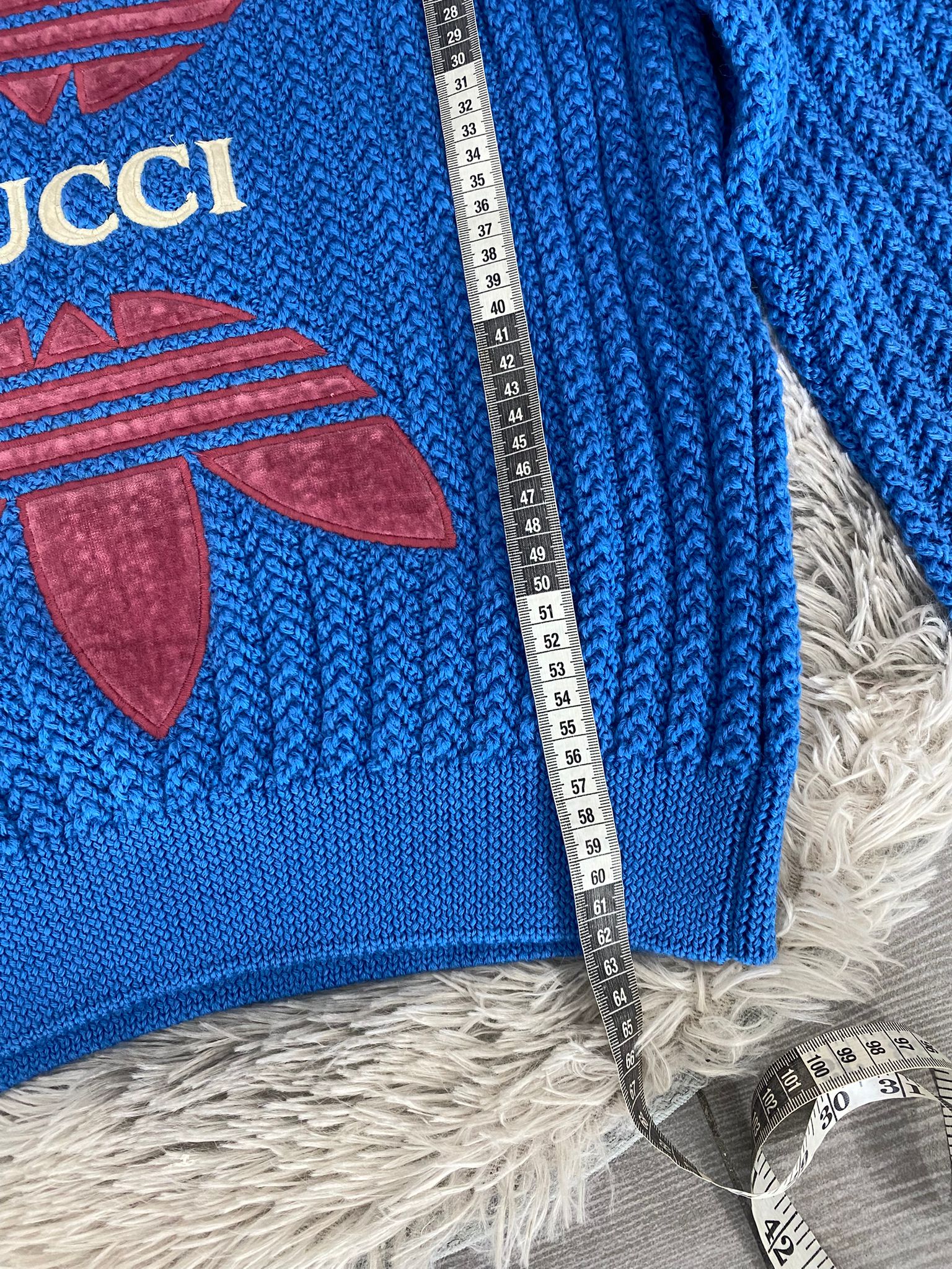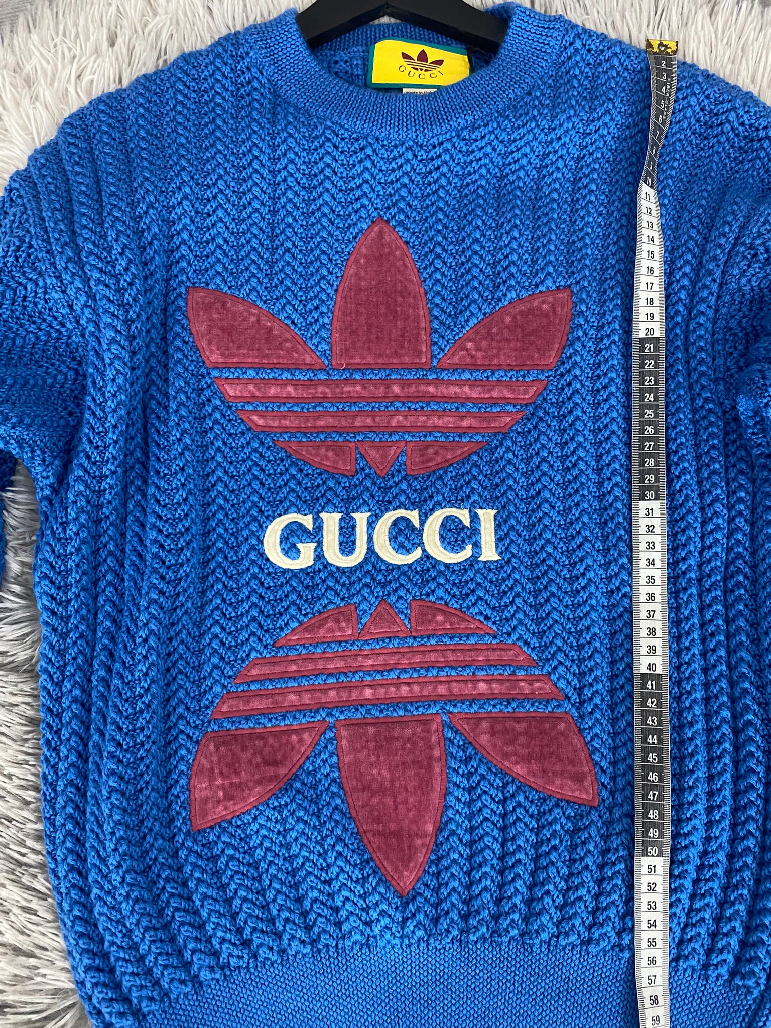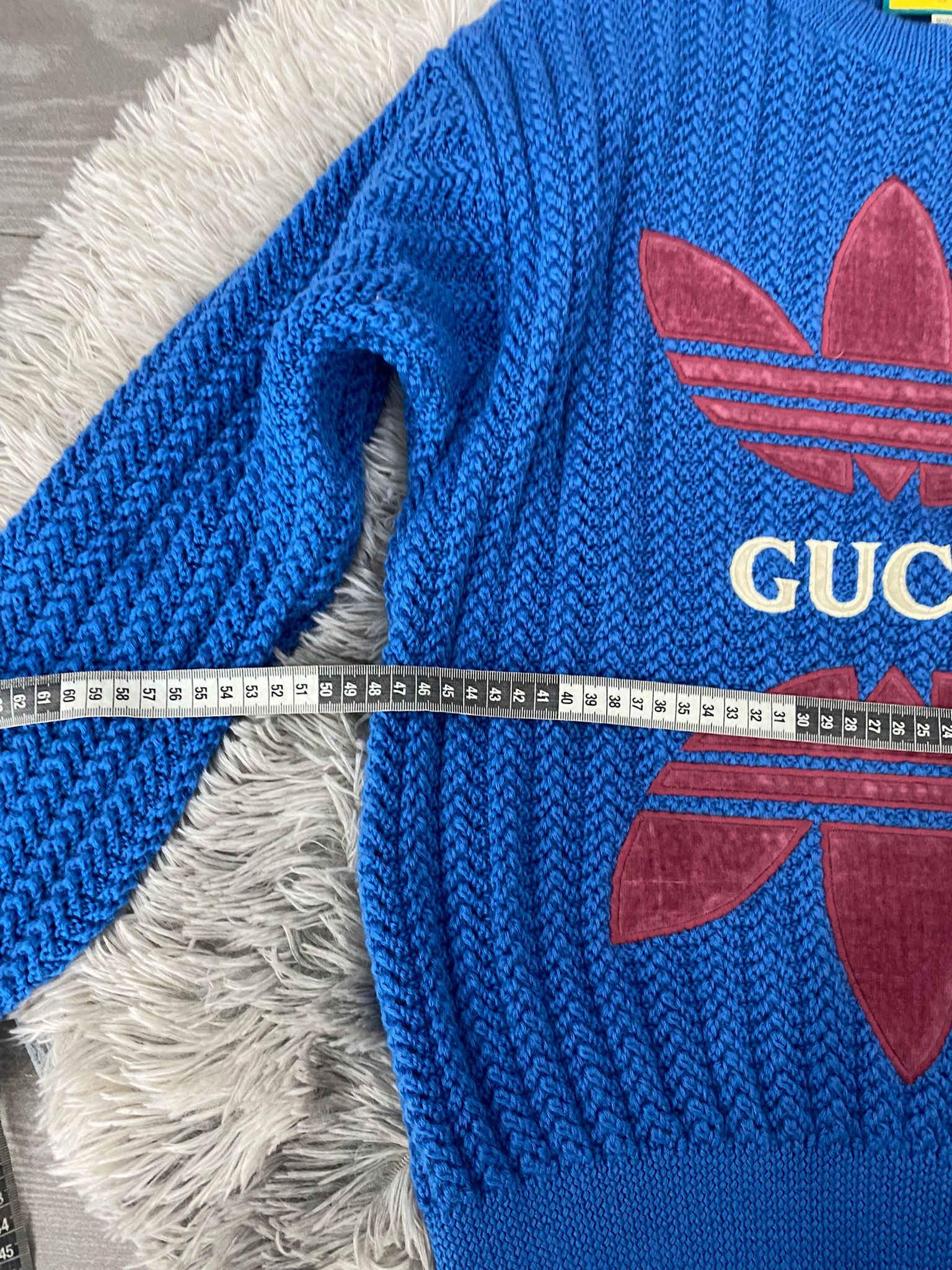 Maglione Gucci X Adidas in lana colore blu . Con logo frontale Gucci in bianco.