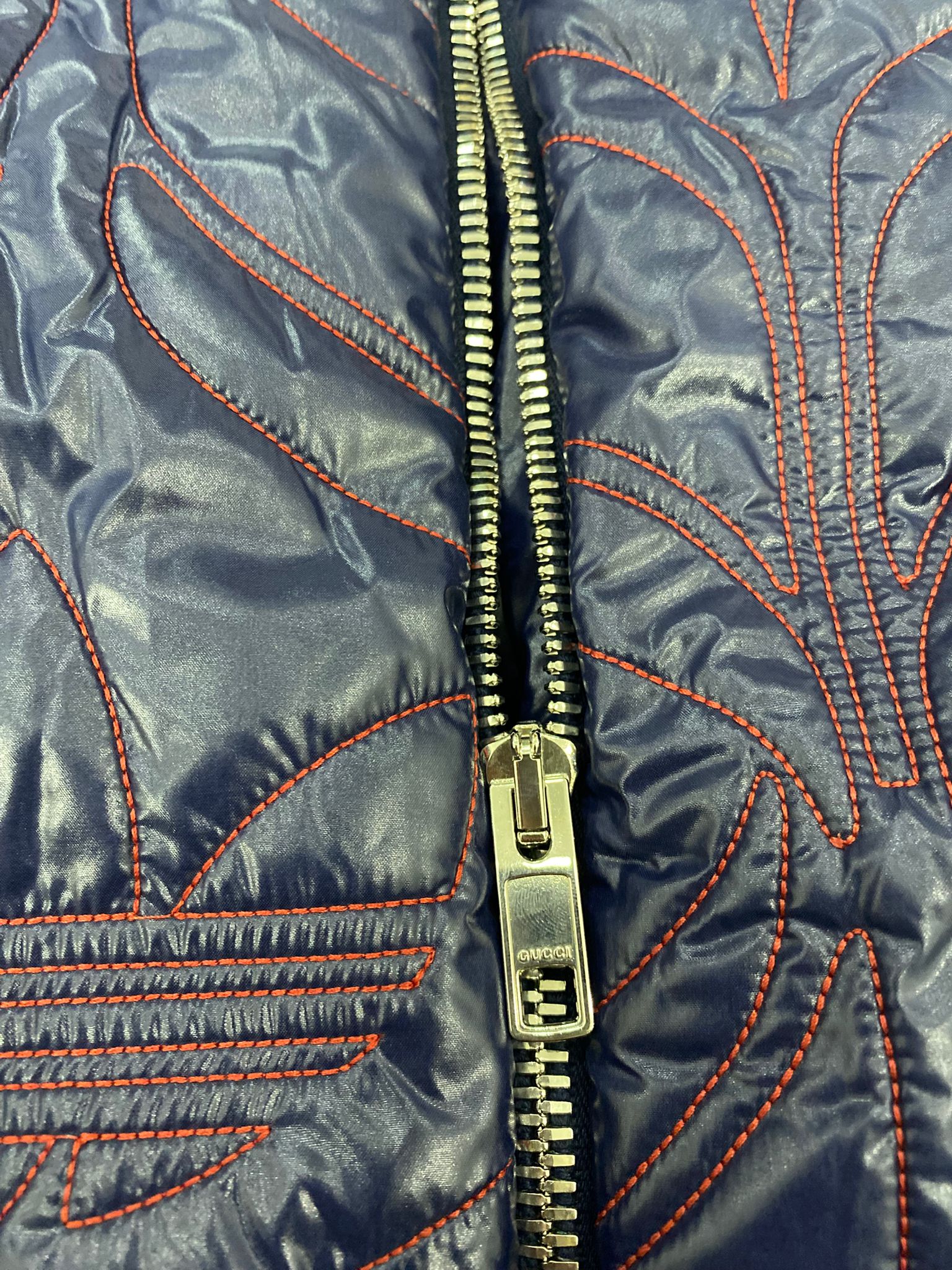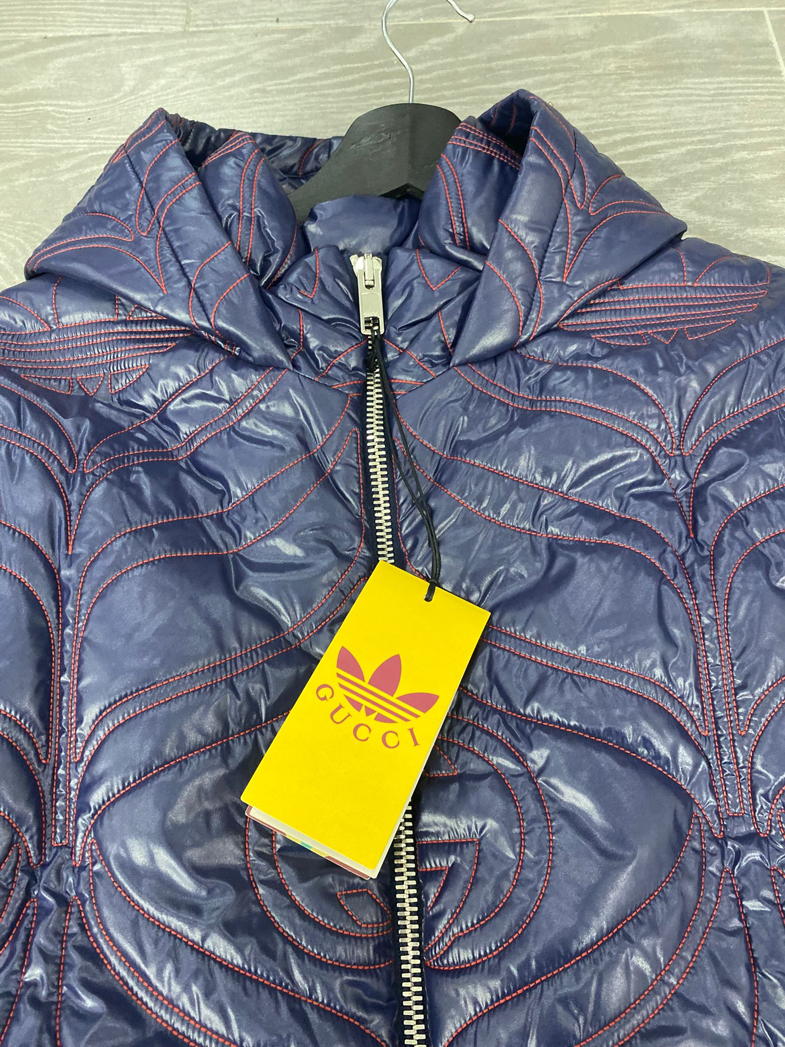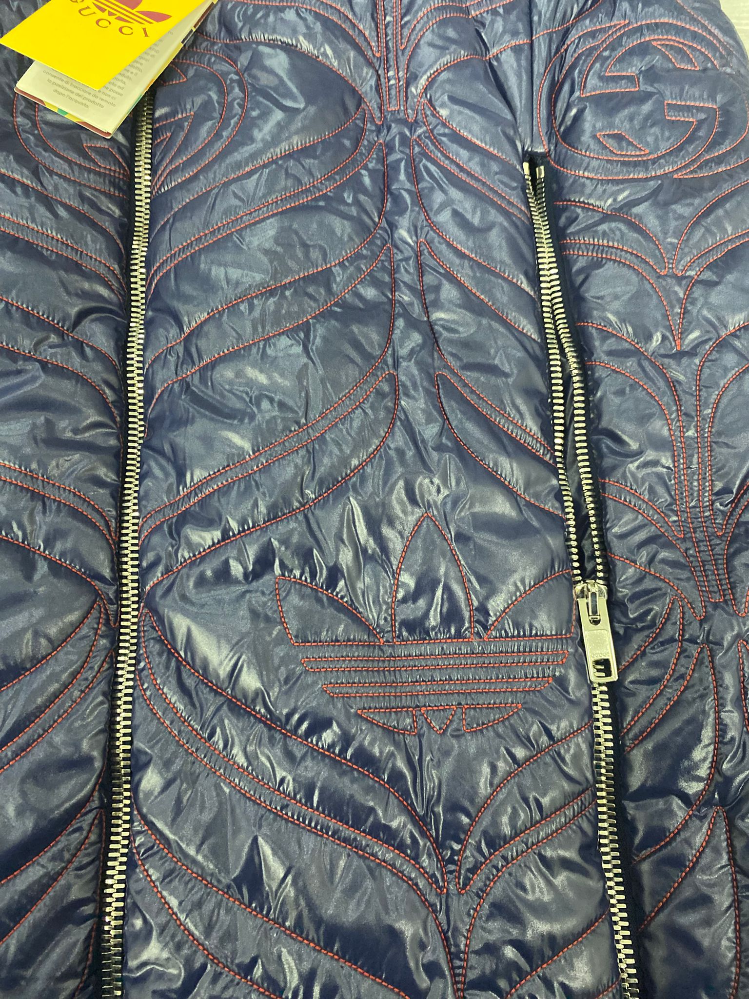 Piumino a Mantella Gucci X Adidas, capo esclusivo ,realizzato in nylon blu scuro con ricami rossi a contrasto, presenta l'iconico motivo "GG" di Gucci intrecciato con il logo del trifoglio di adidas.