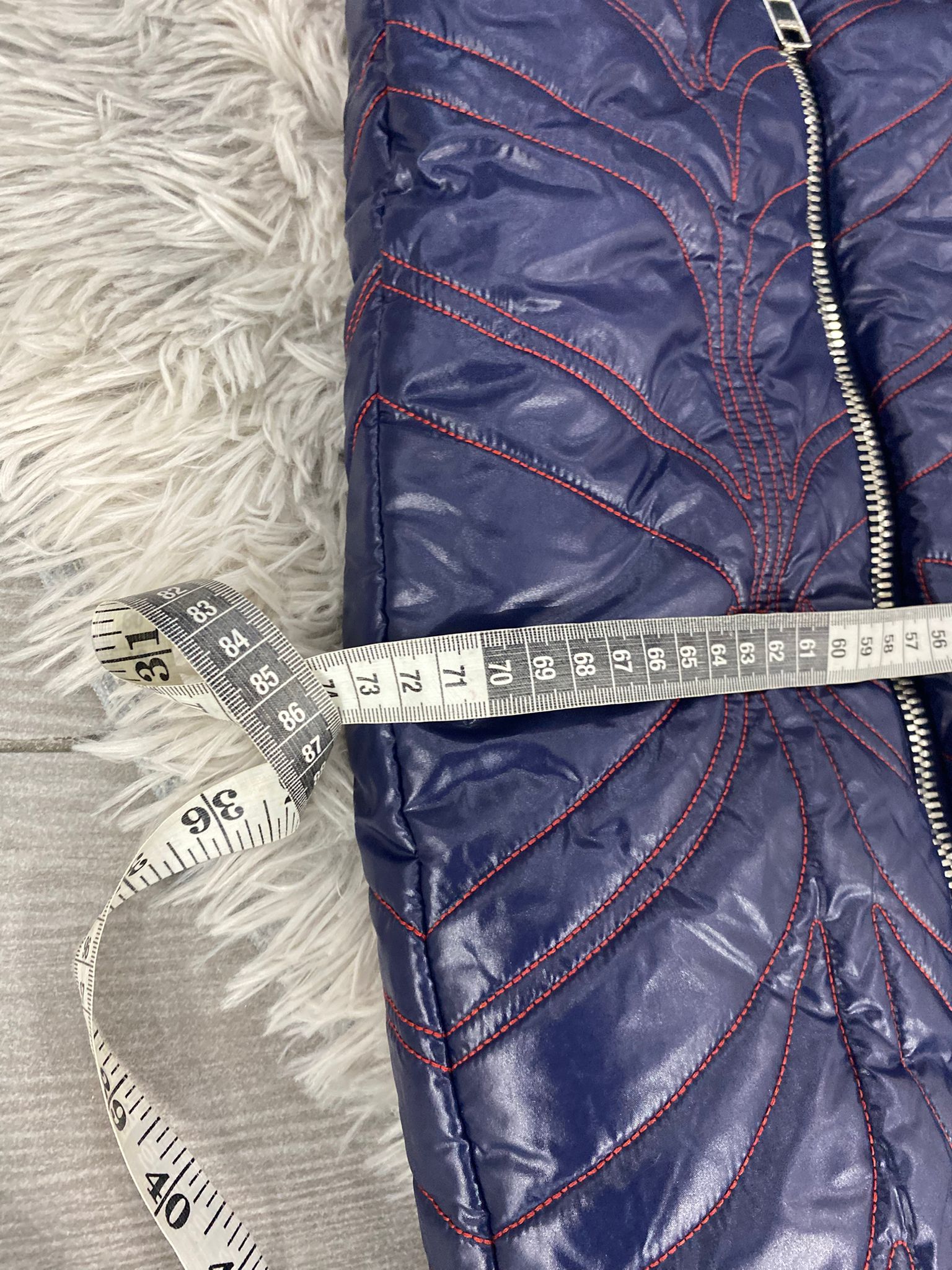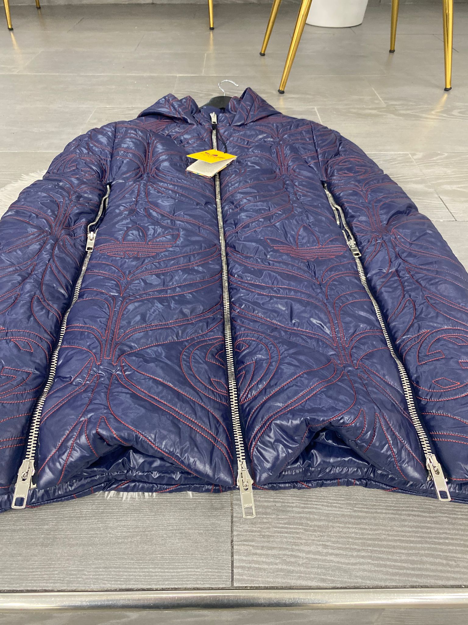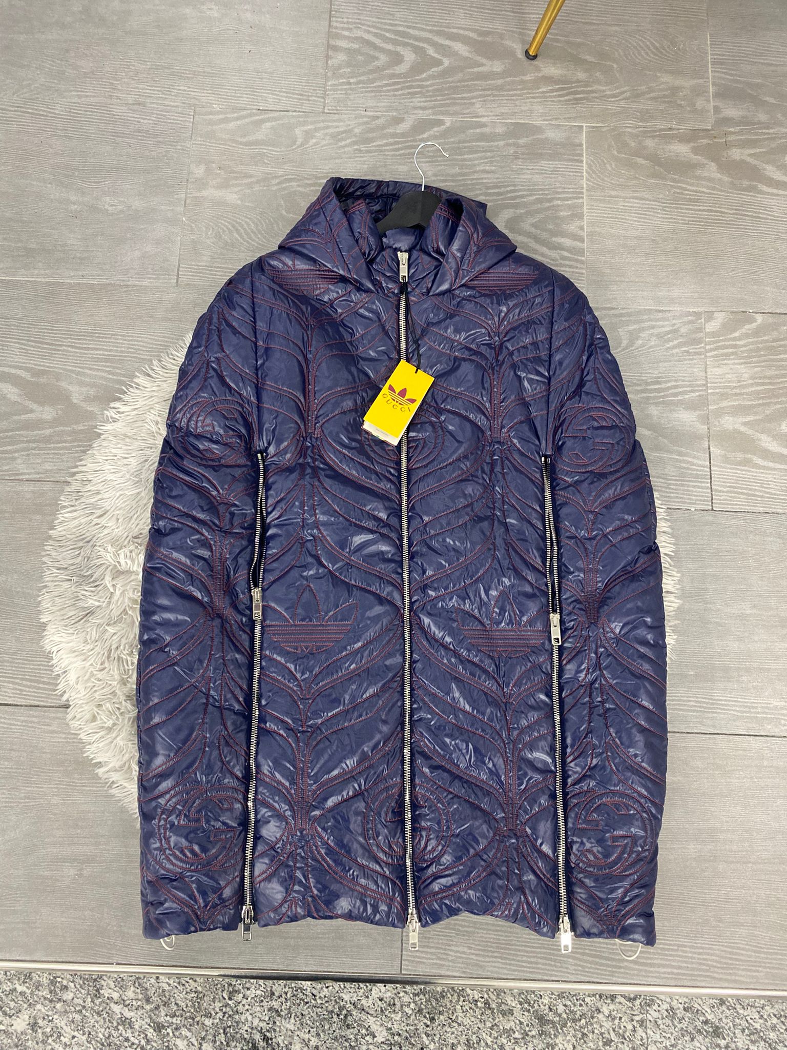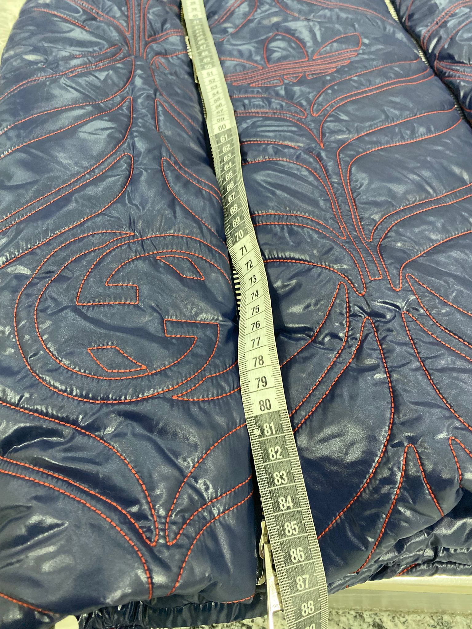 Piumino a Mantella Gucci X Adidas, capo esclusivo ,realizzato in nylon blu scuro con ricami rossi a contrasto, presenta l'iconico motivo "GG" di Gucci intrecciato con il logo del trifoglio di adidas.