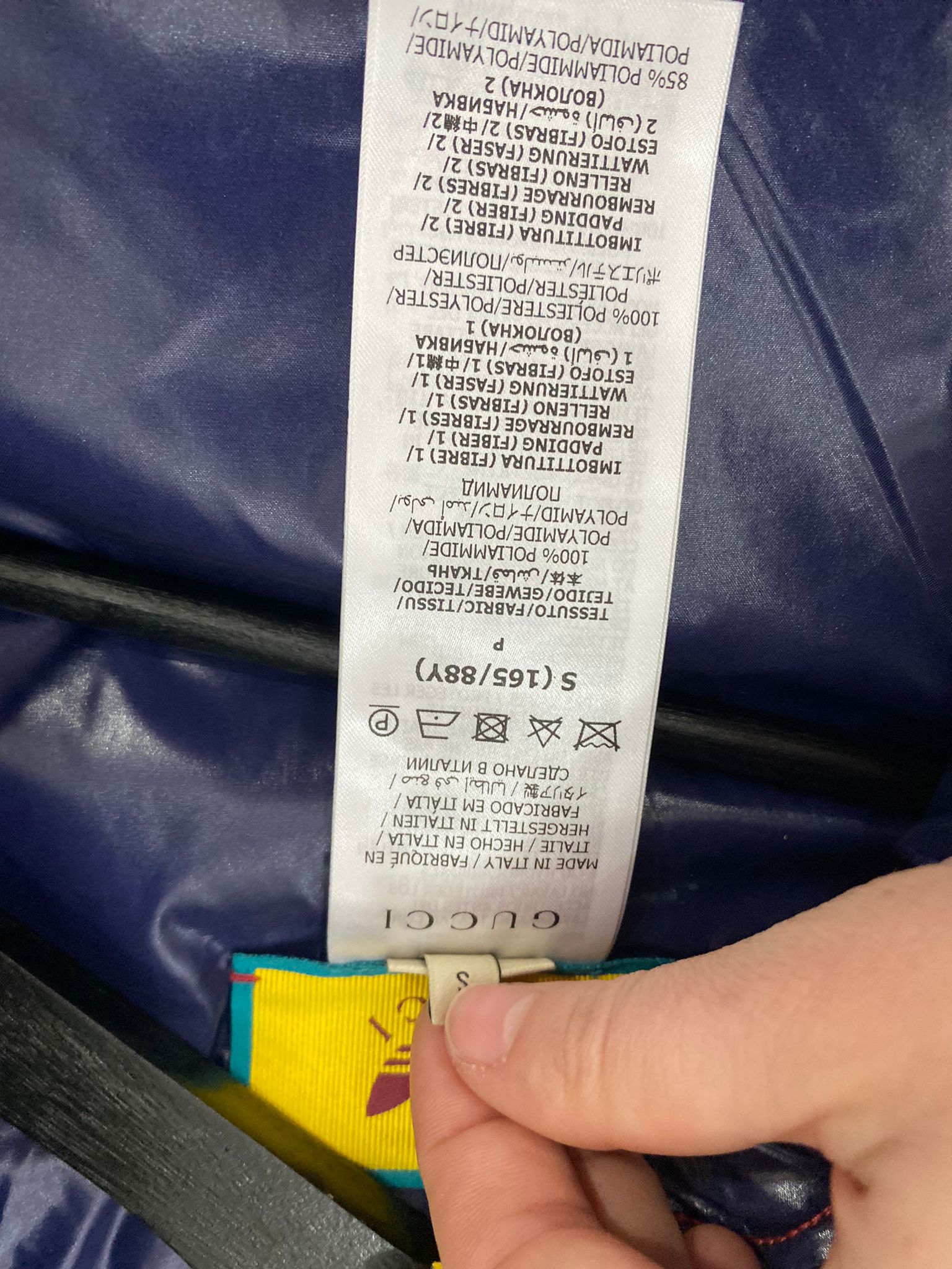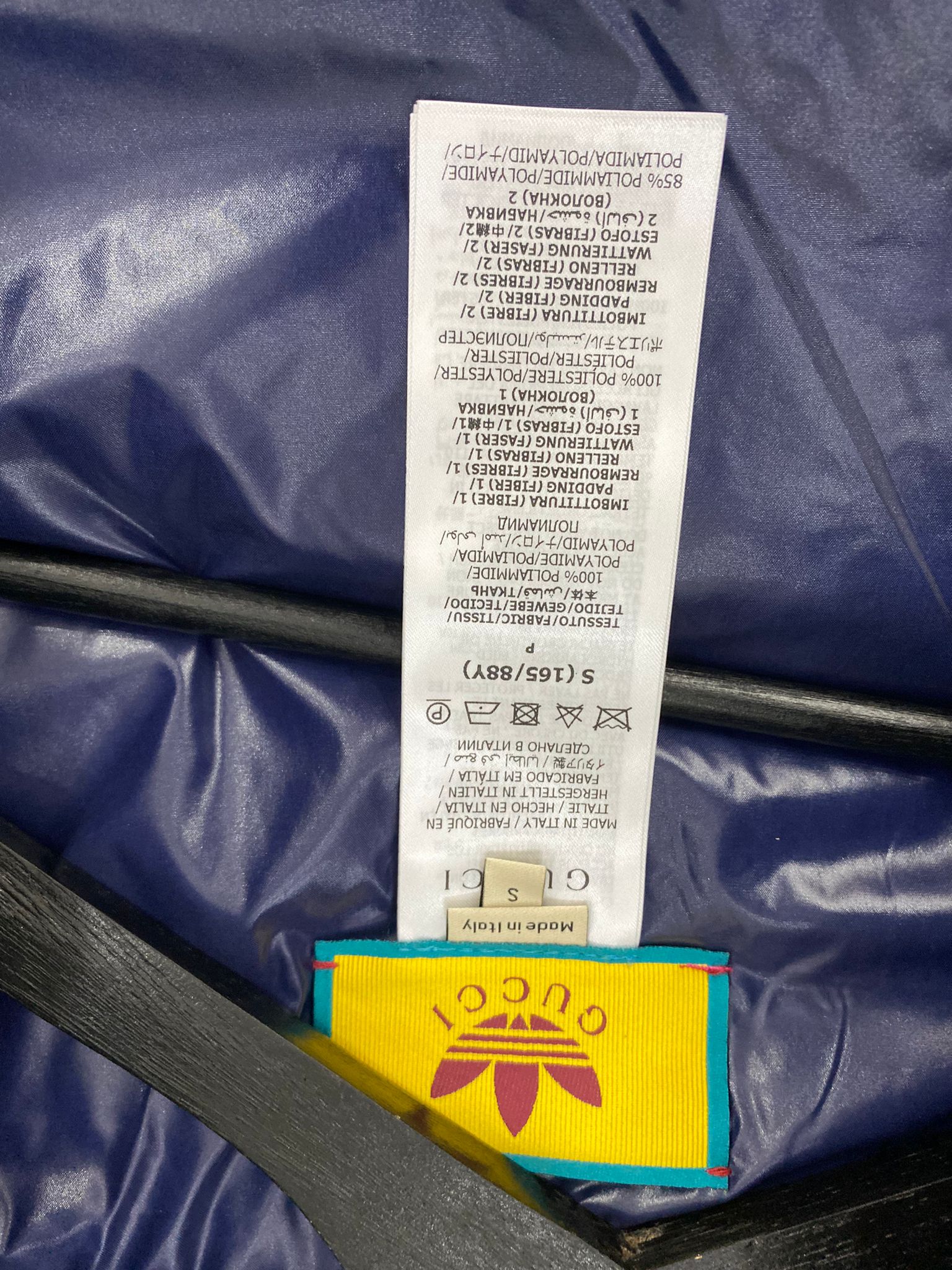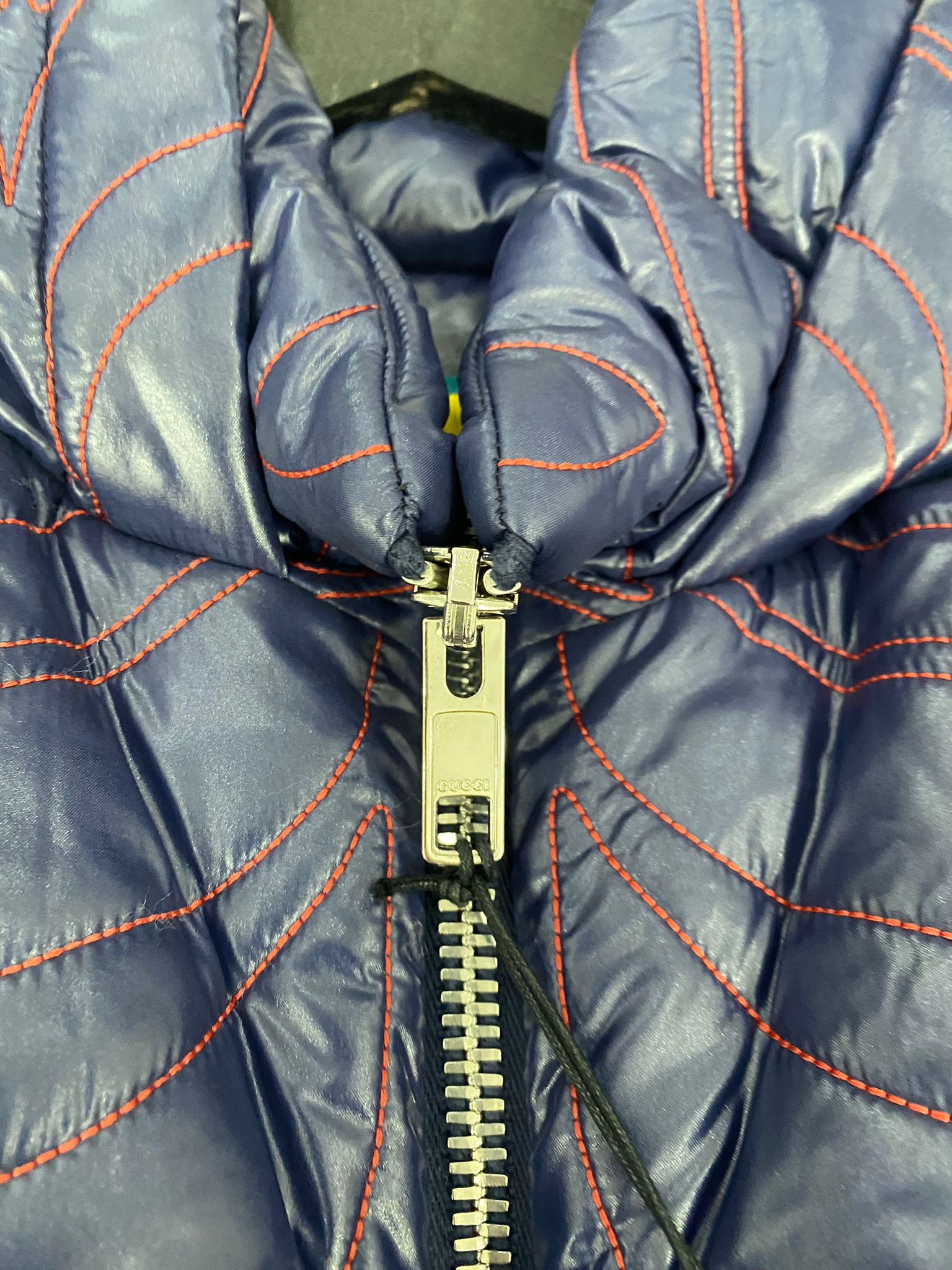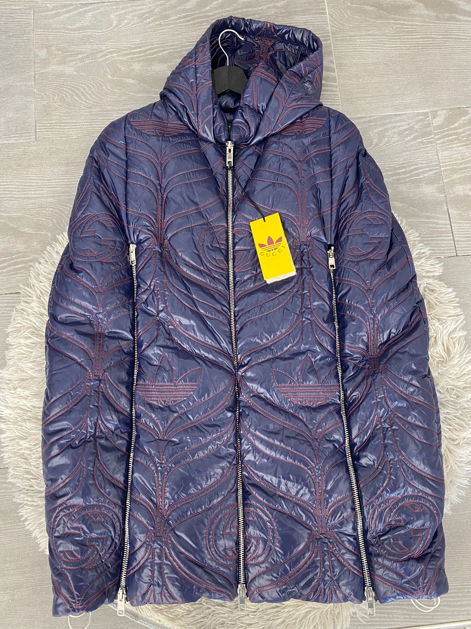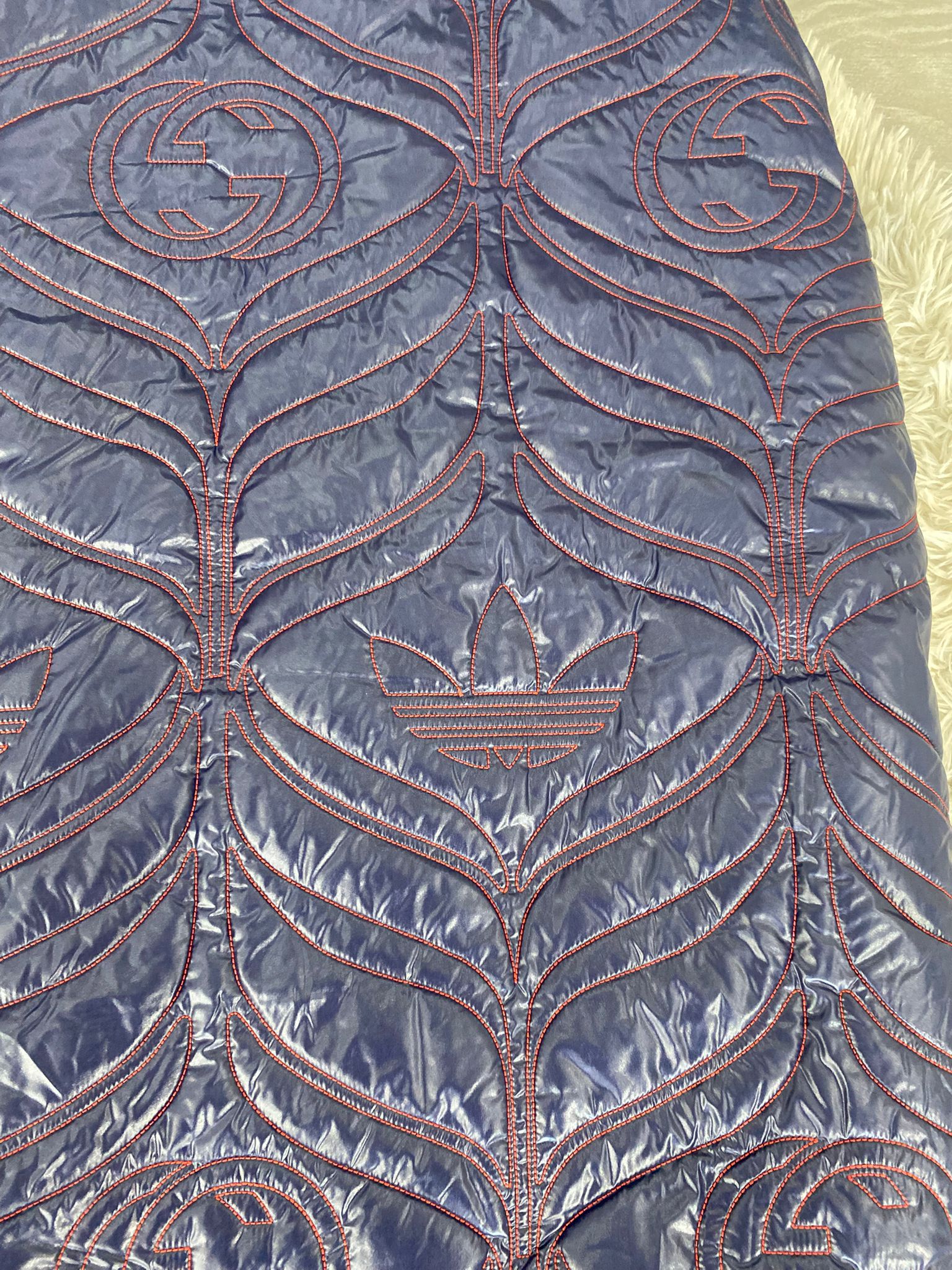 Piumino a Mantella Gucci X Adidas, capo esclusivo ,realizzato in nylon blu scuro con ricami rossi a contrasto, presenta l'iconico motivo "GG" di Gucci intrecciato con il logo del trifoglio di adidas.