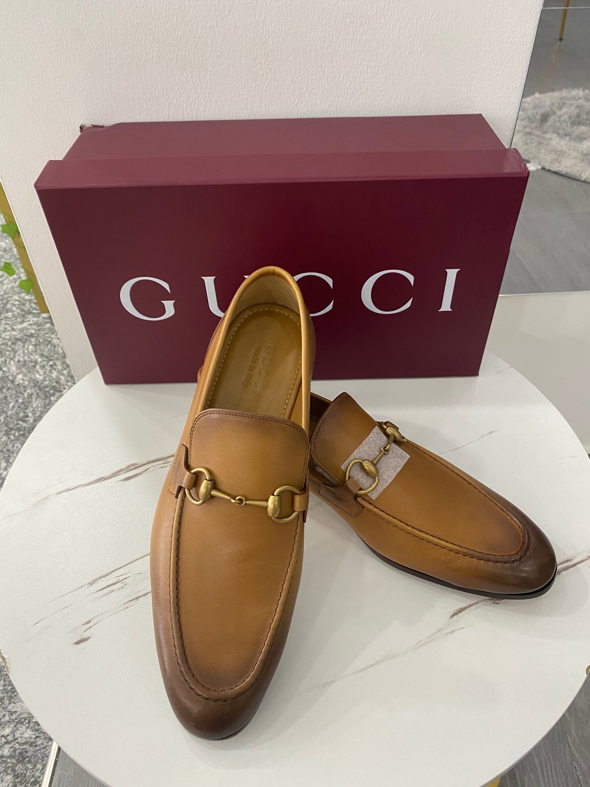 Mocassino Gucci Jordaan, un modello iconico caratterizzato dal dettaglio Morsetto in metallo dorato.In pelle pelle marrone con finitura sfumata che vira verso tonalità più scure sulla punta.
