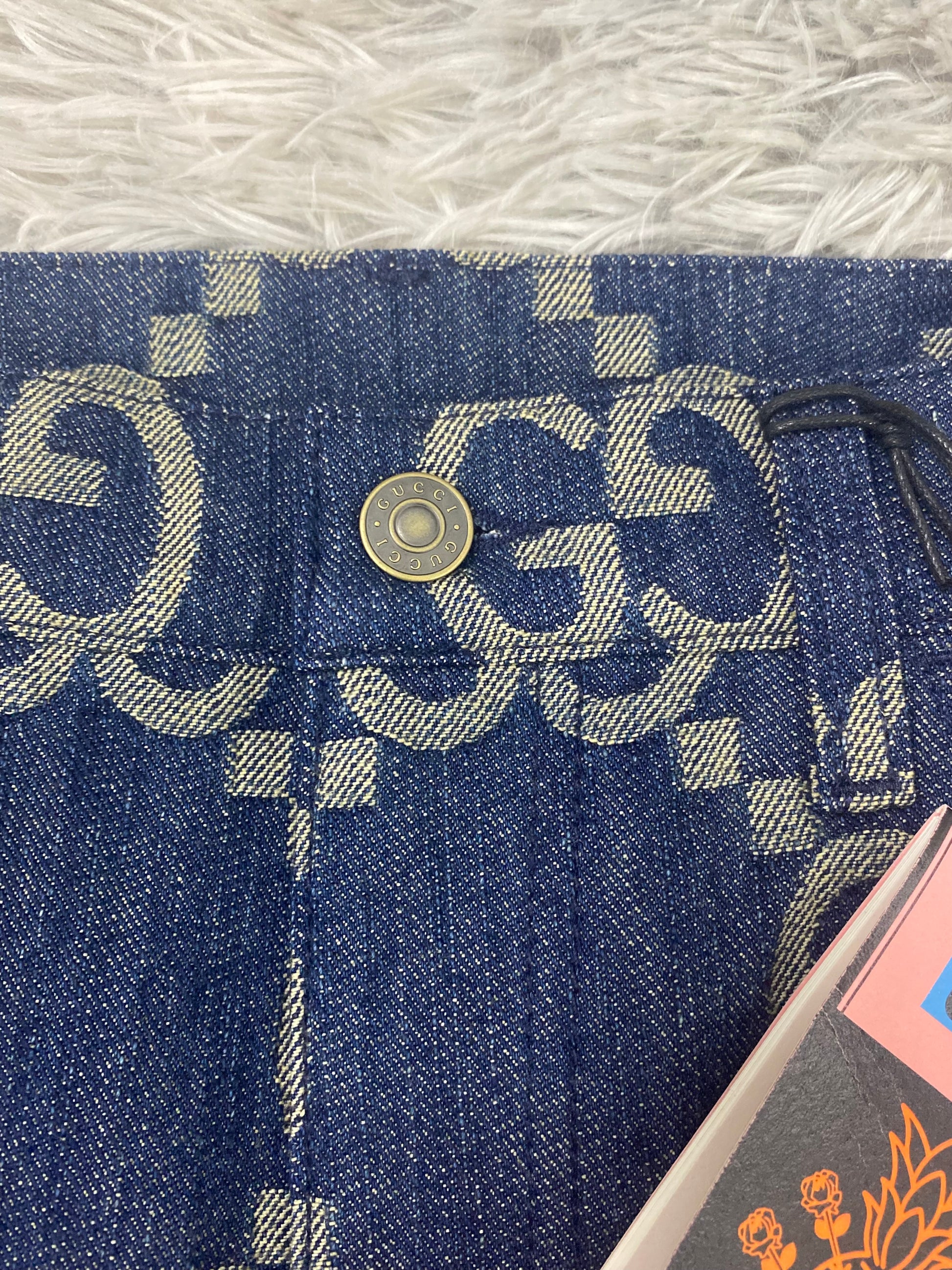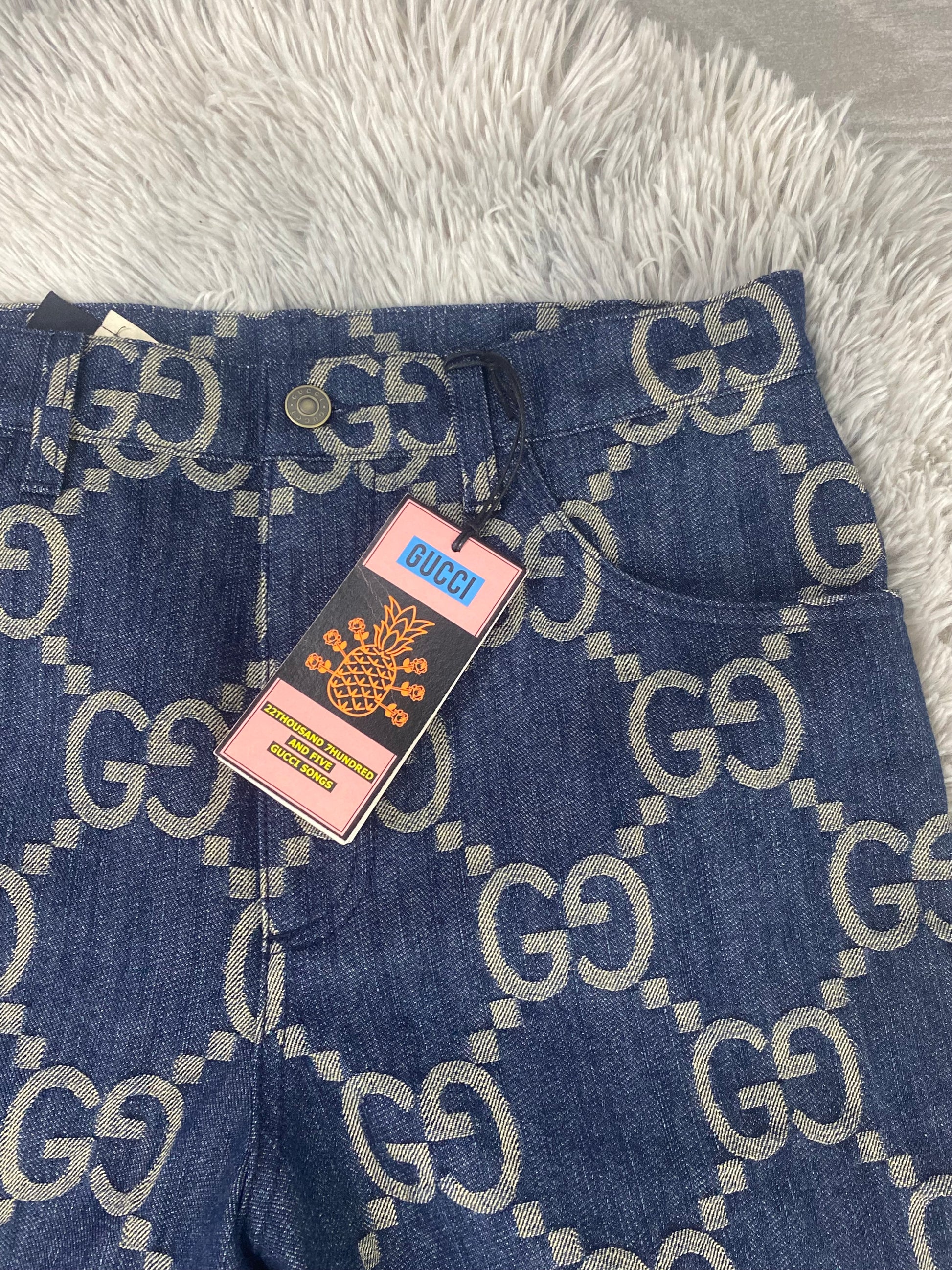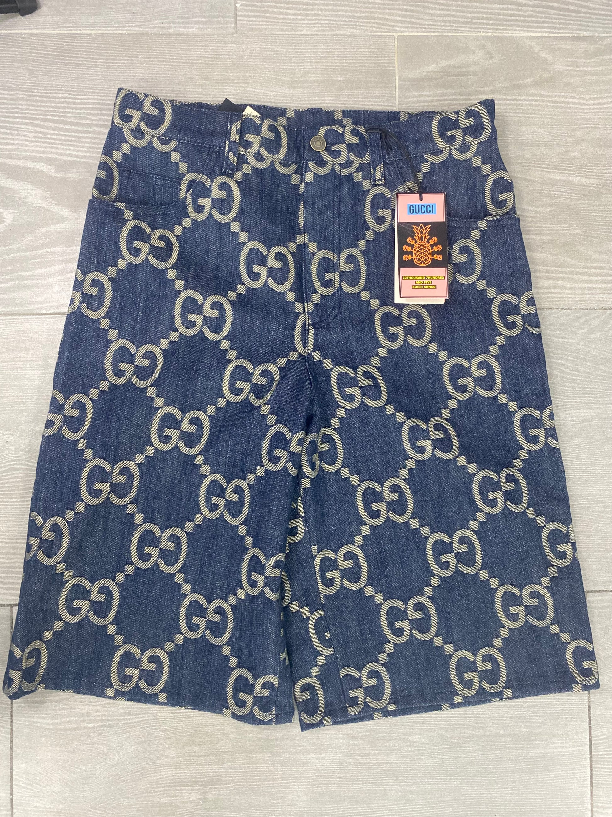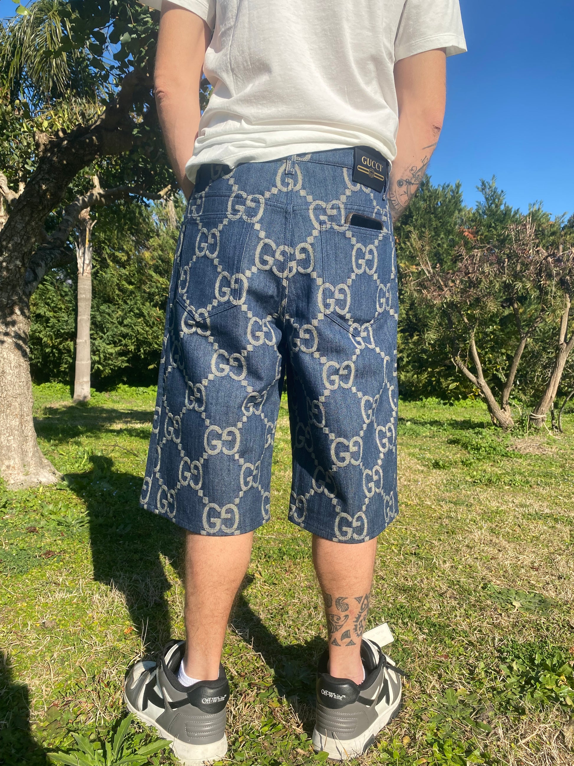 Pantaloncini Gucci Bermuda in denim jacquard GG, caratterizzati dall'iconico motivo monogram "Jumbo GG".