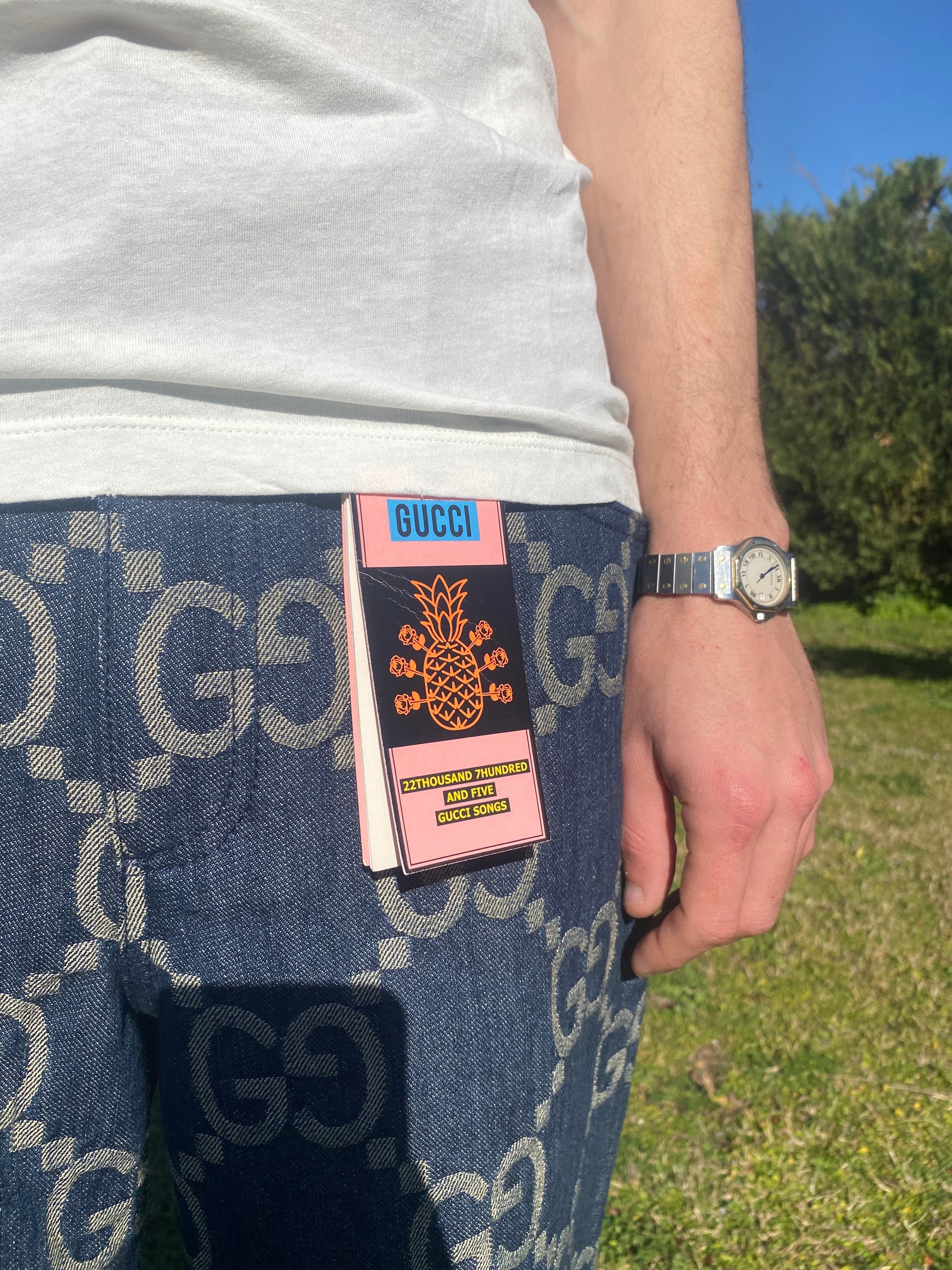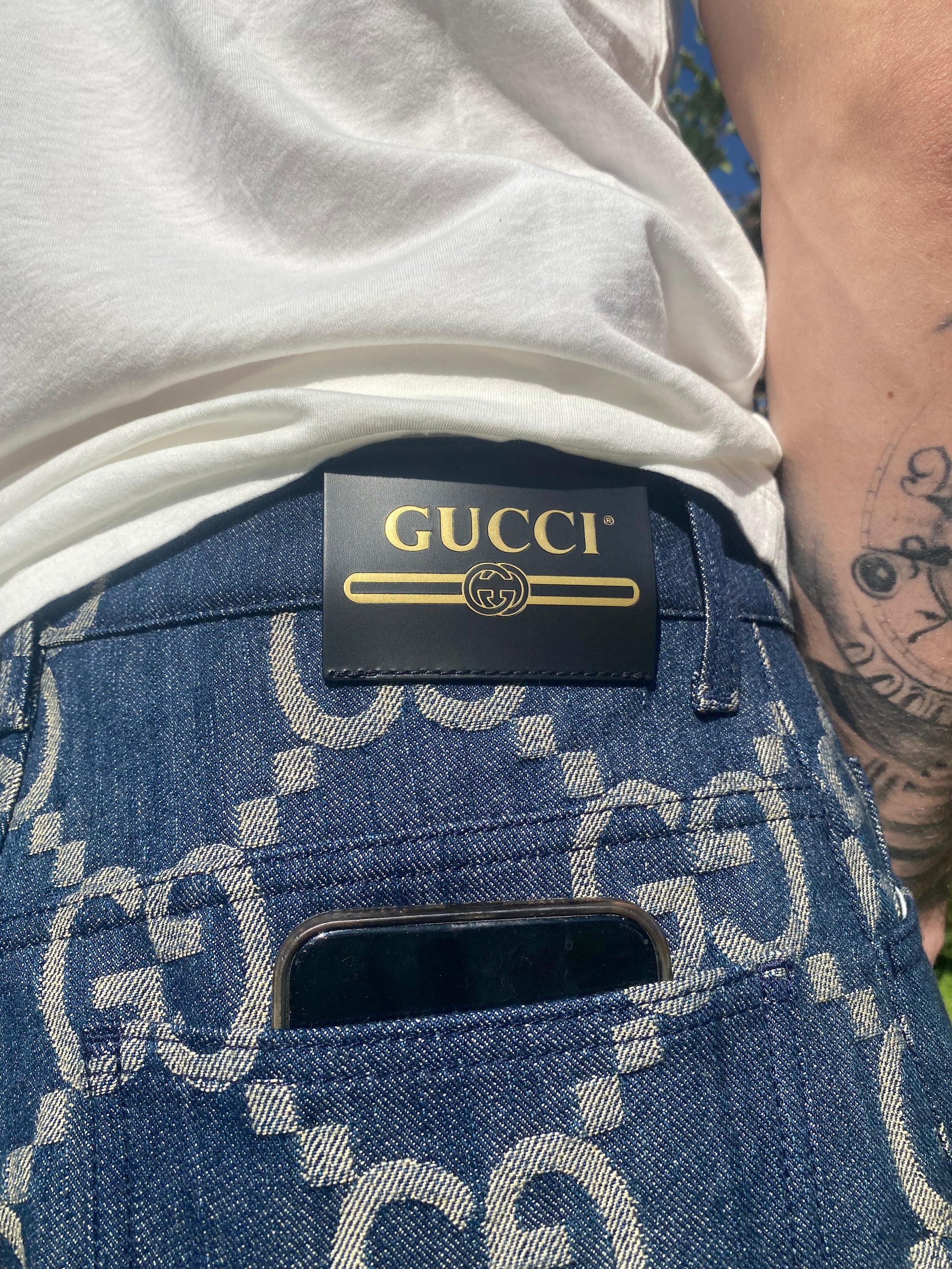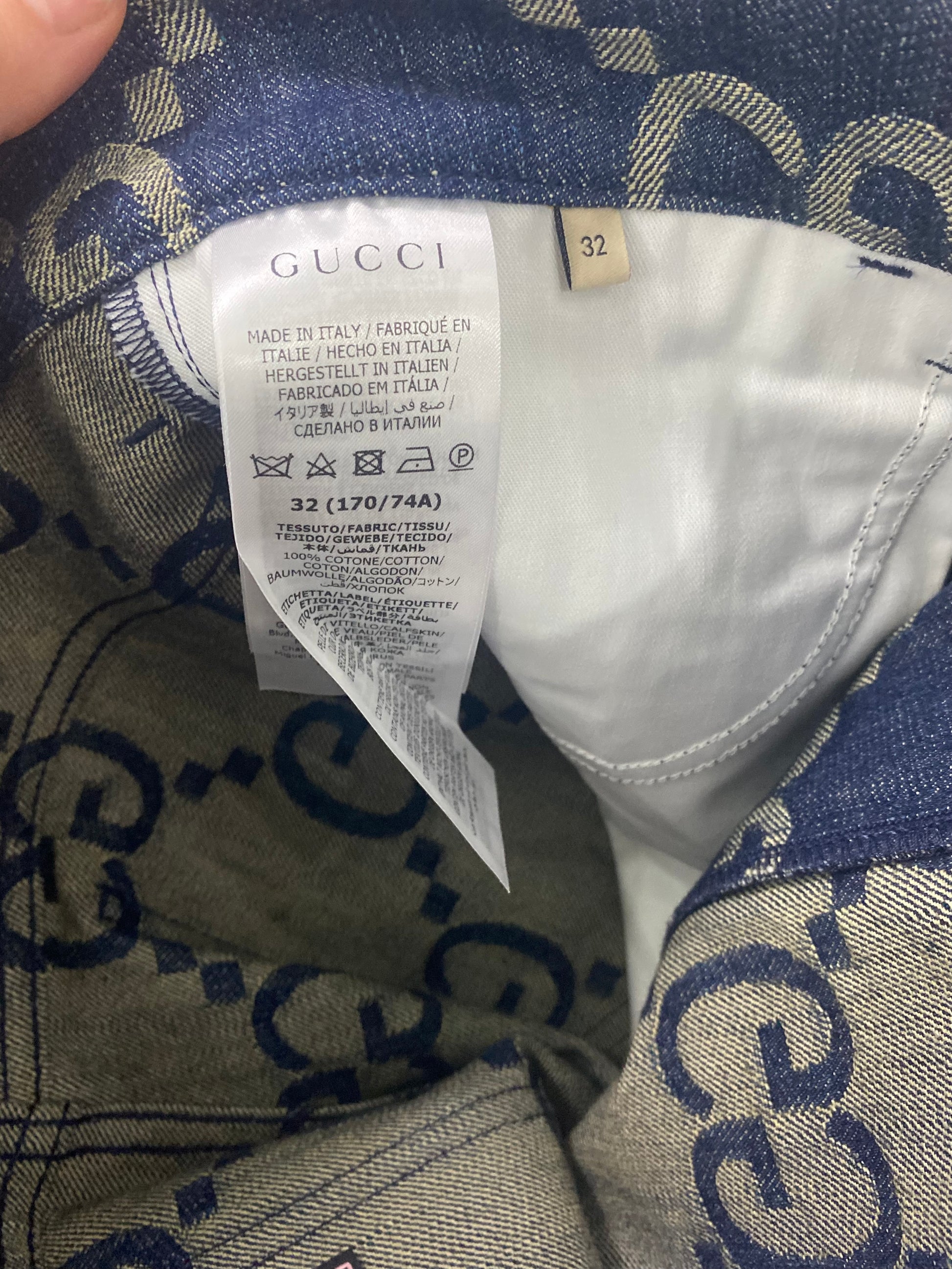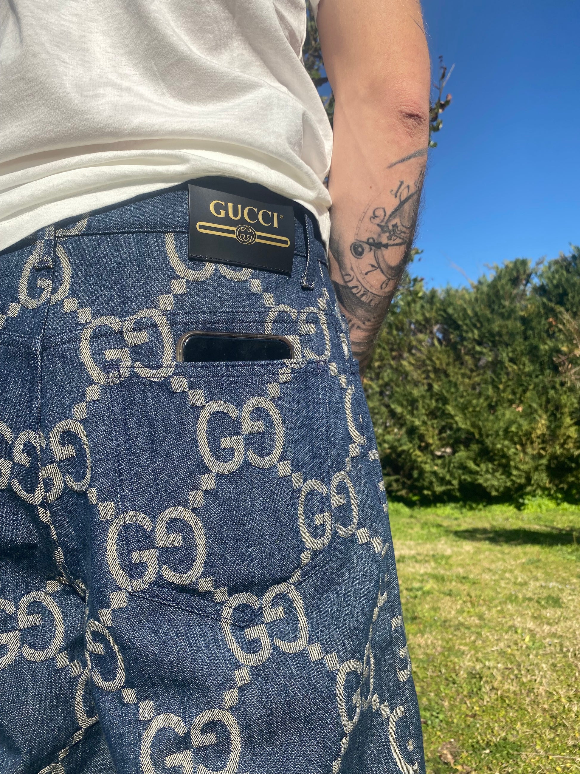 Pantaloncini Gucci Bermuda in denim jacquard GG, caratterizzati dall'iconico motivo monogram "Jumbo GG".