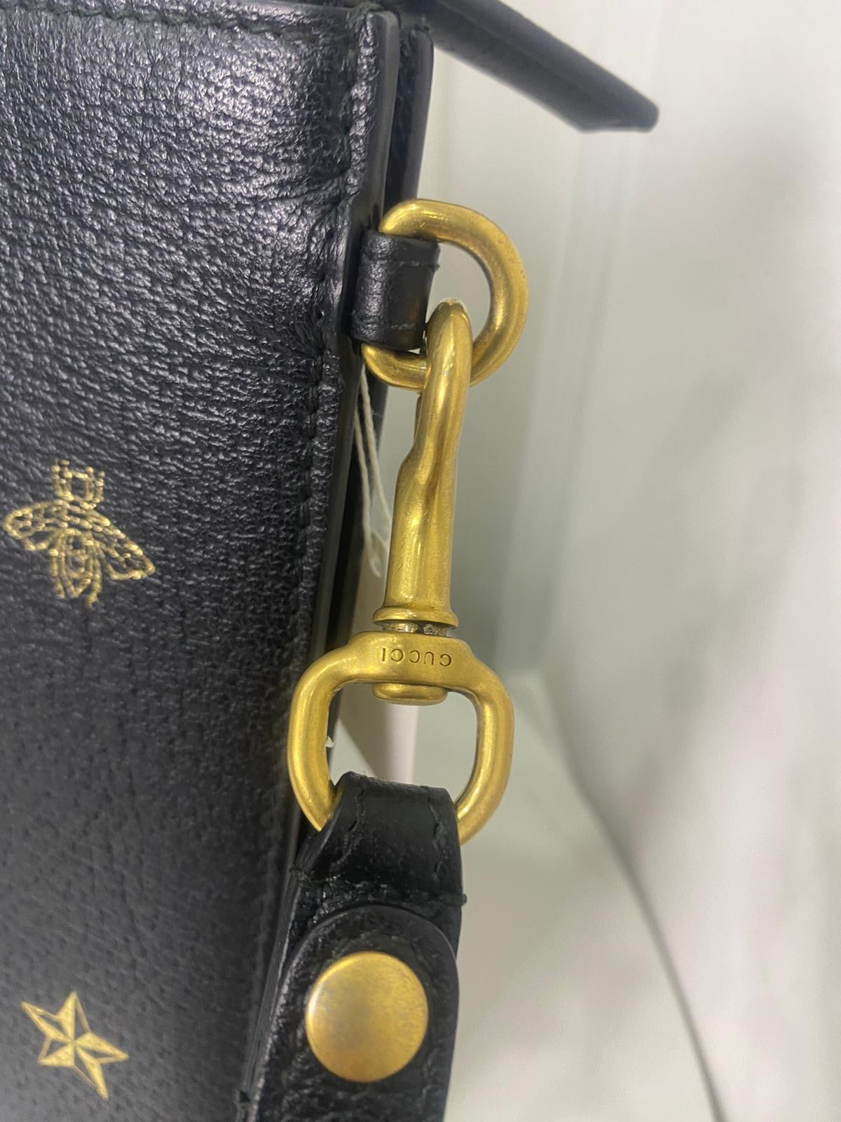 Pochette Gucci a mano in pelle nera e hardware oro.