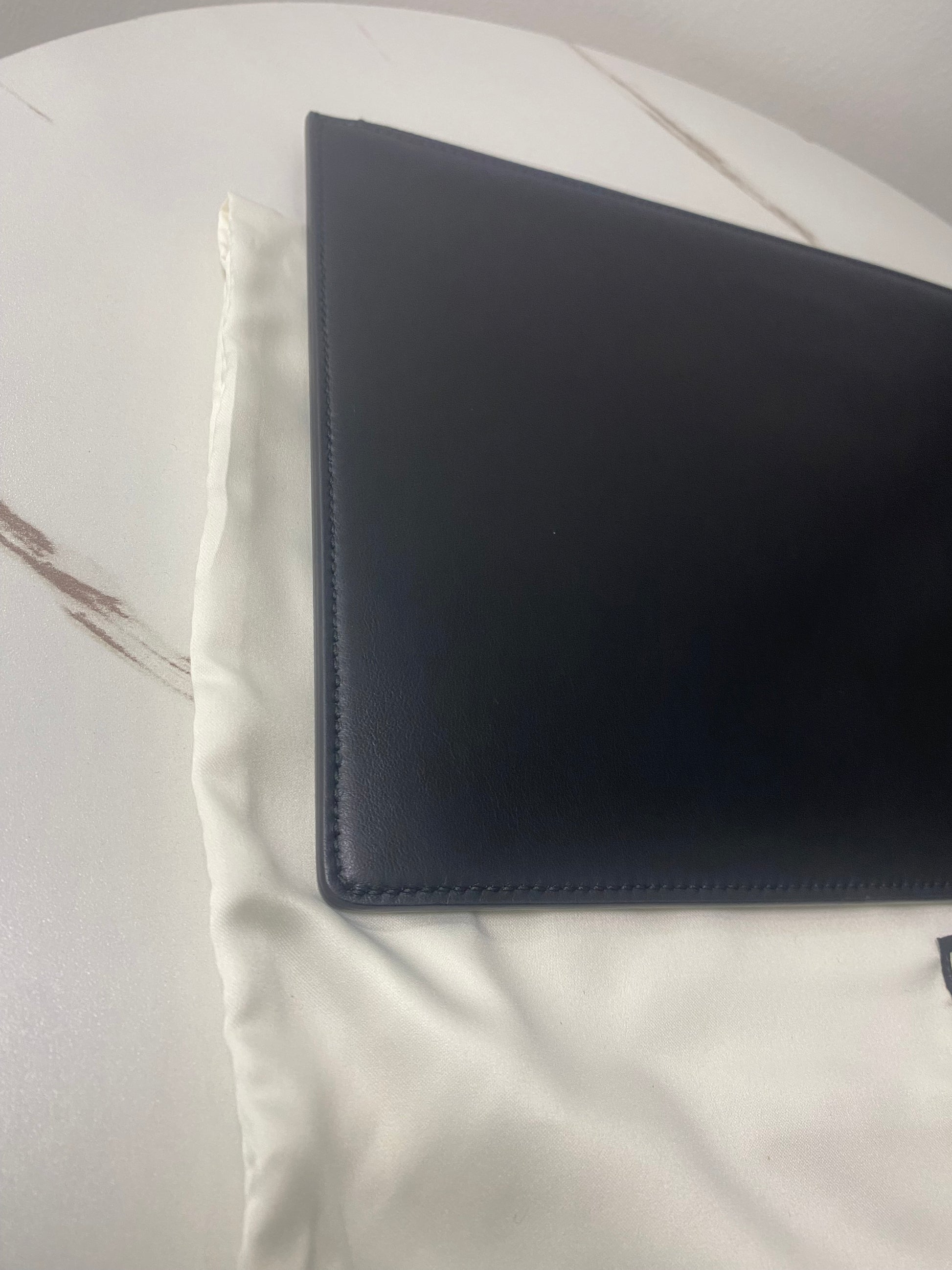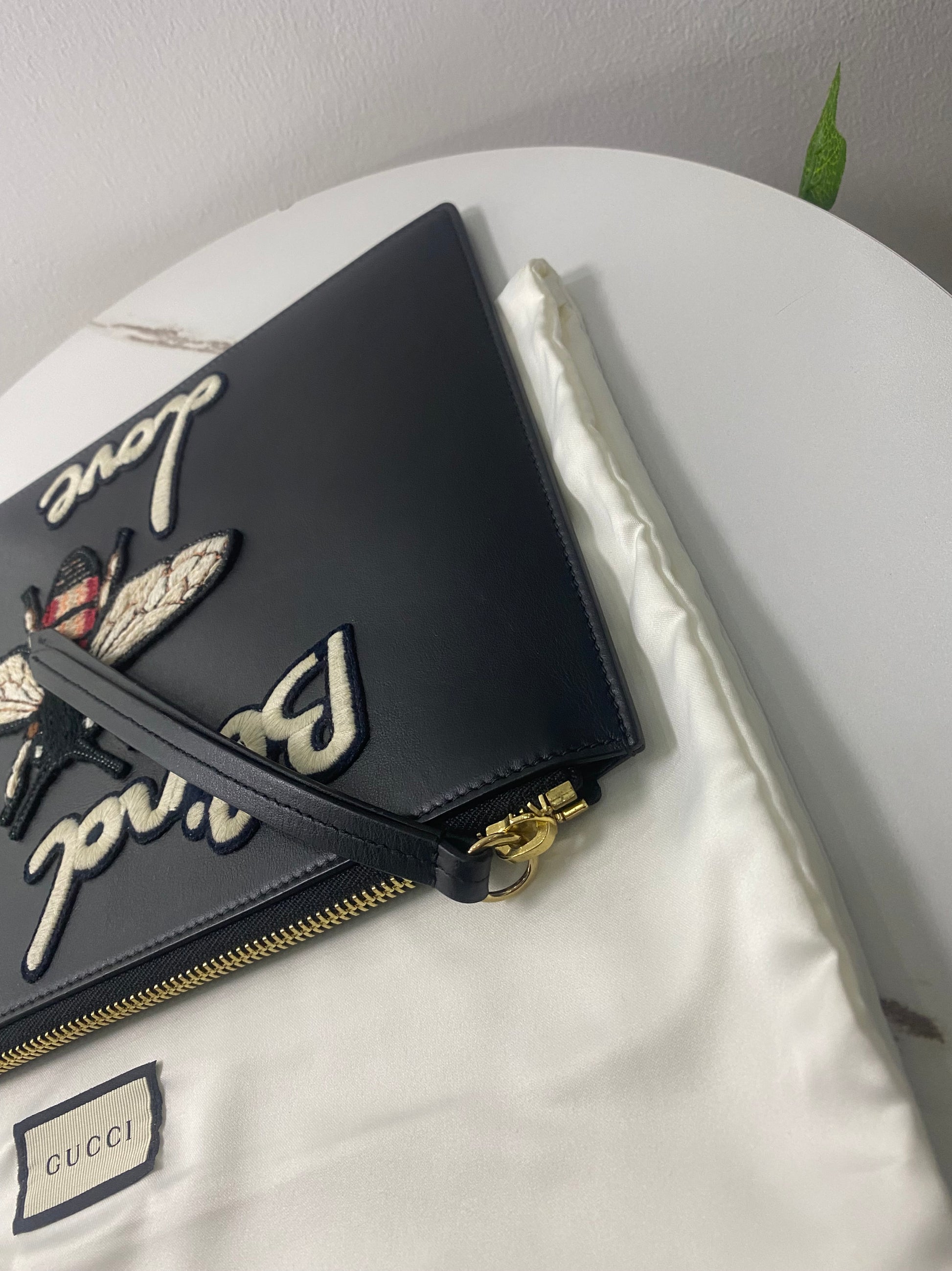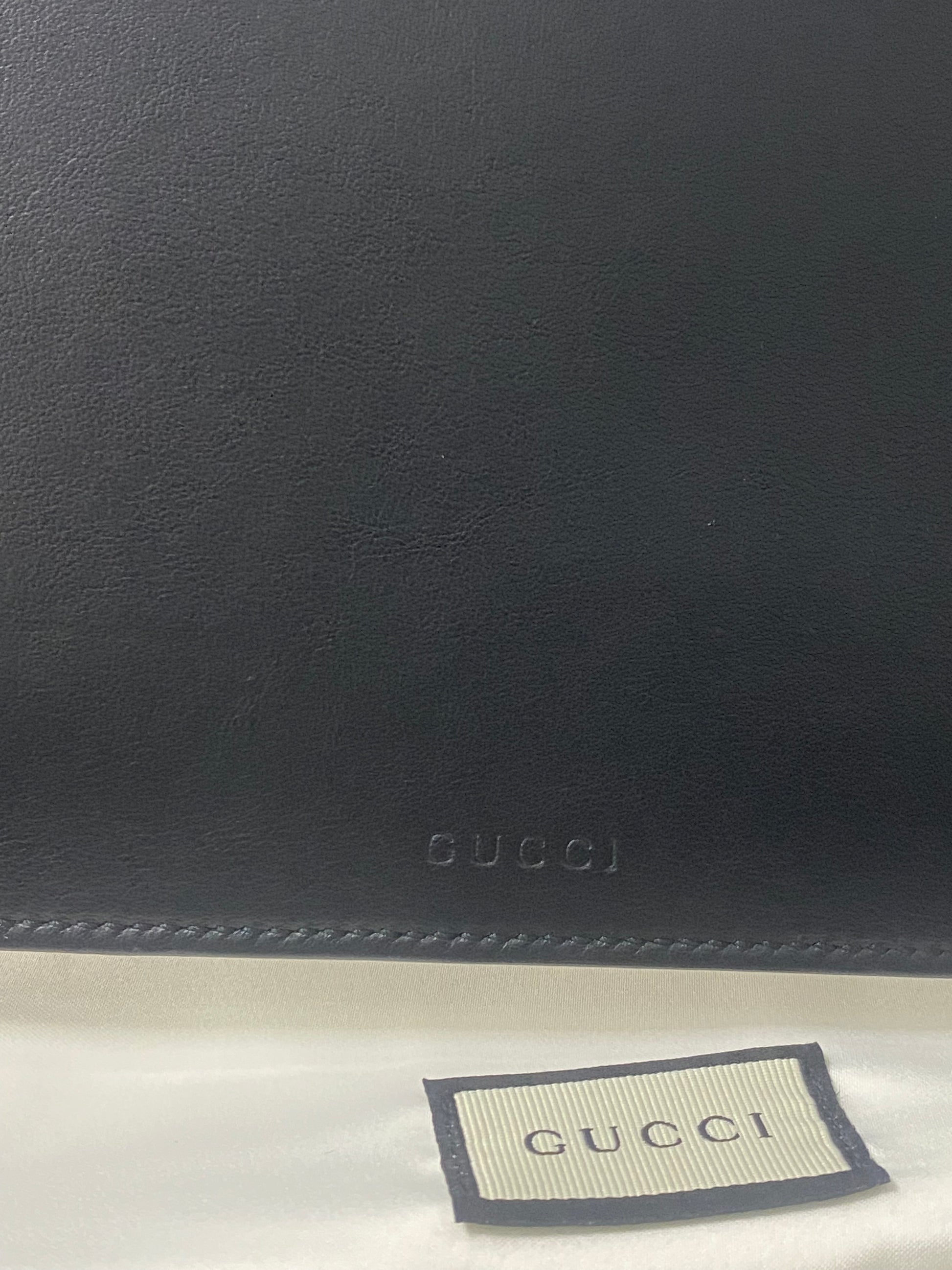 Pochette Gucci in pelle nera e disegni frontali. Con logo sul retro e hardware oro.