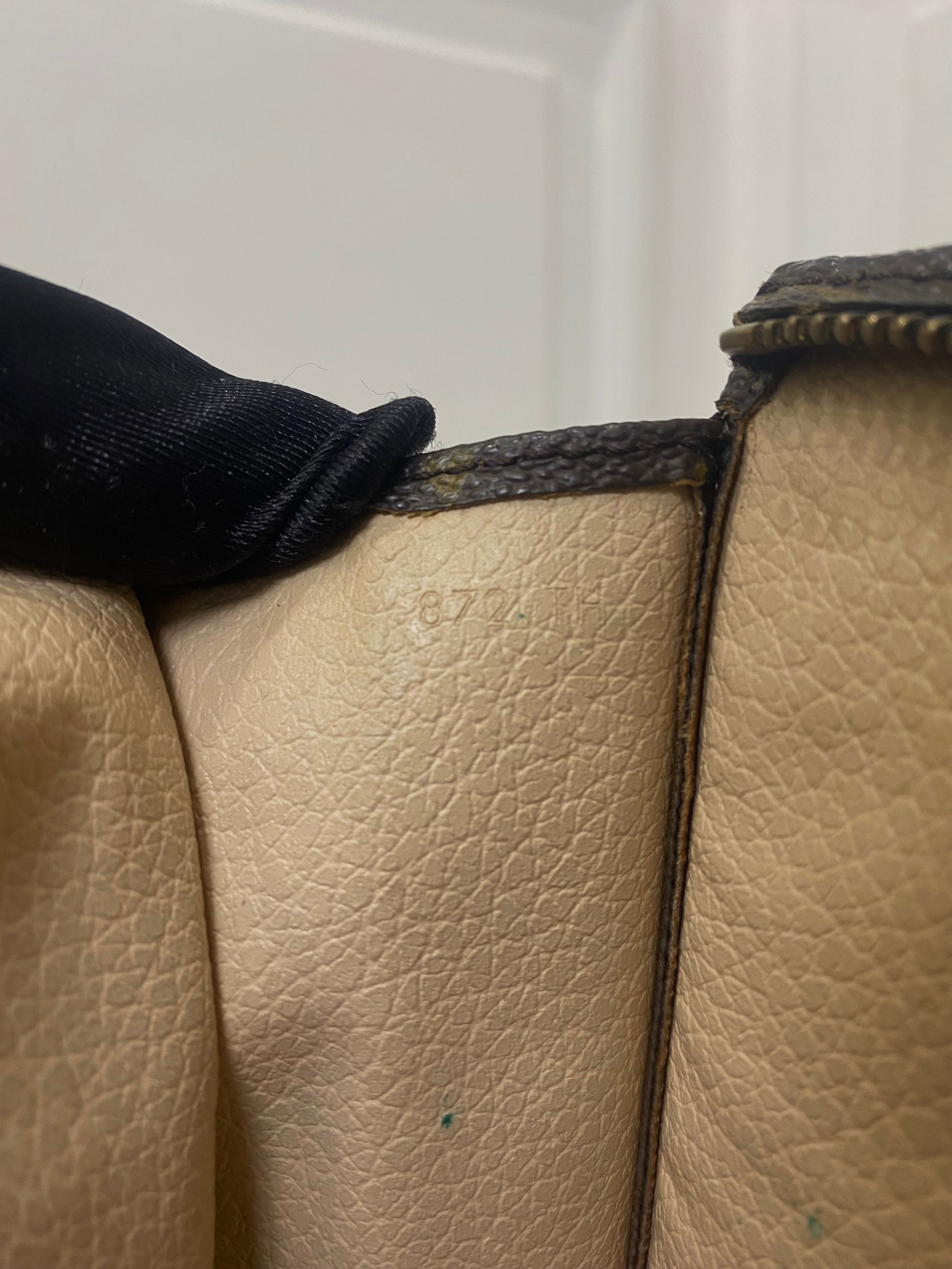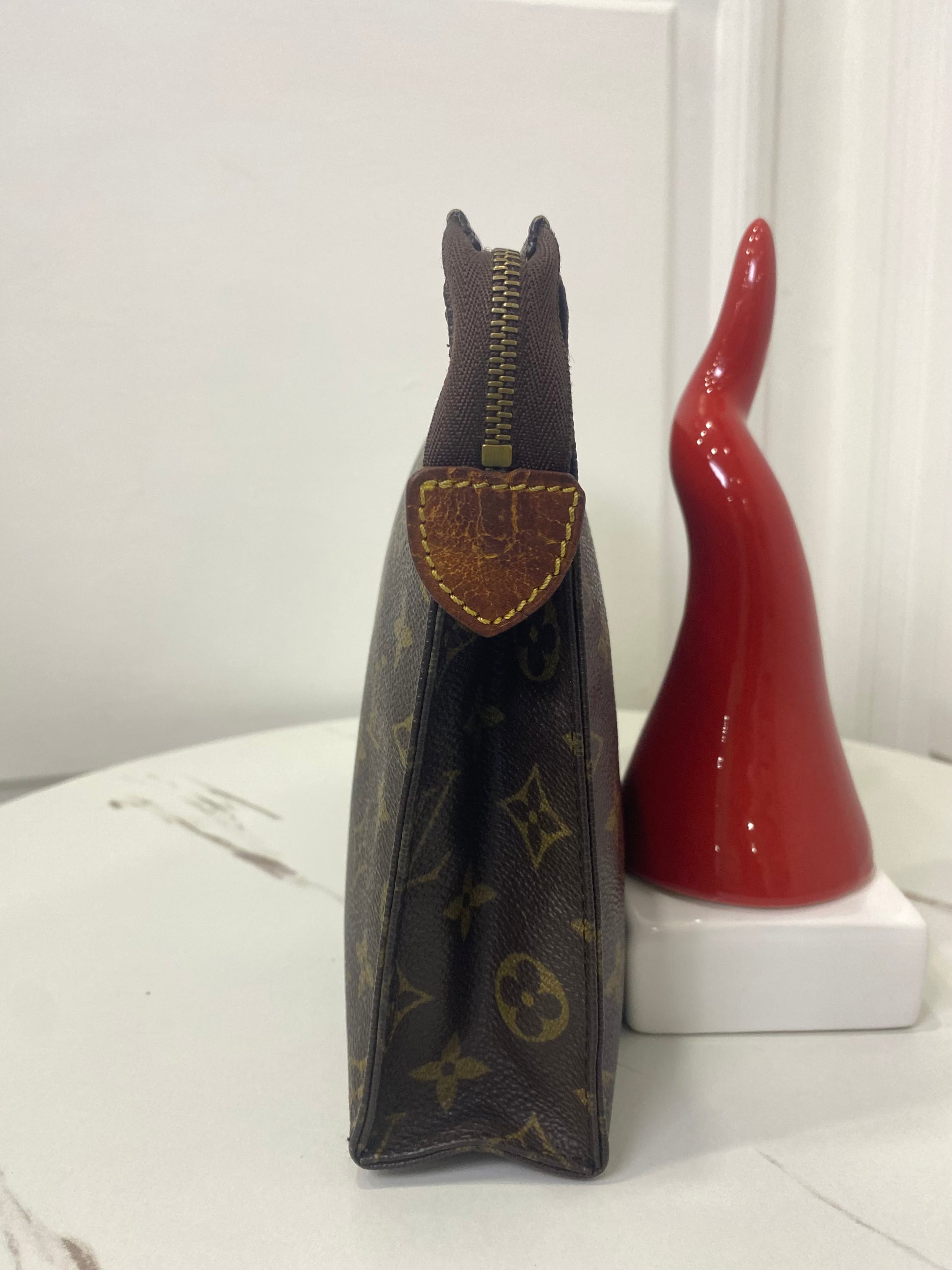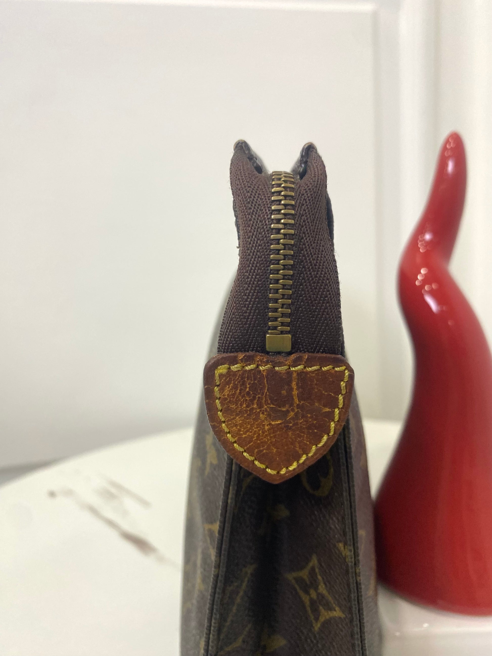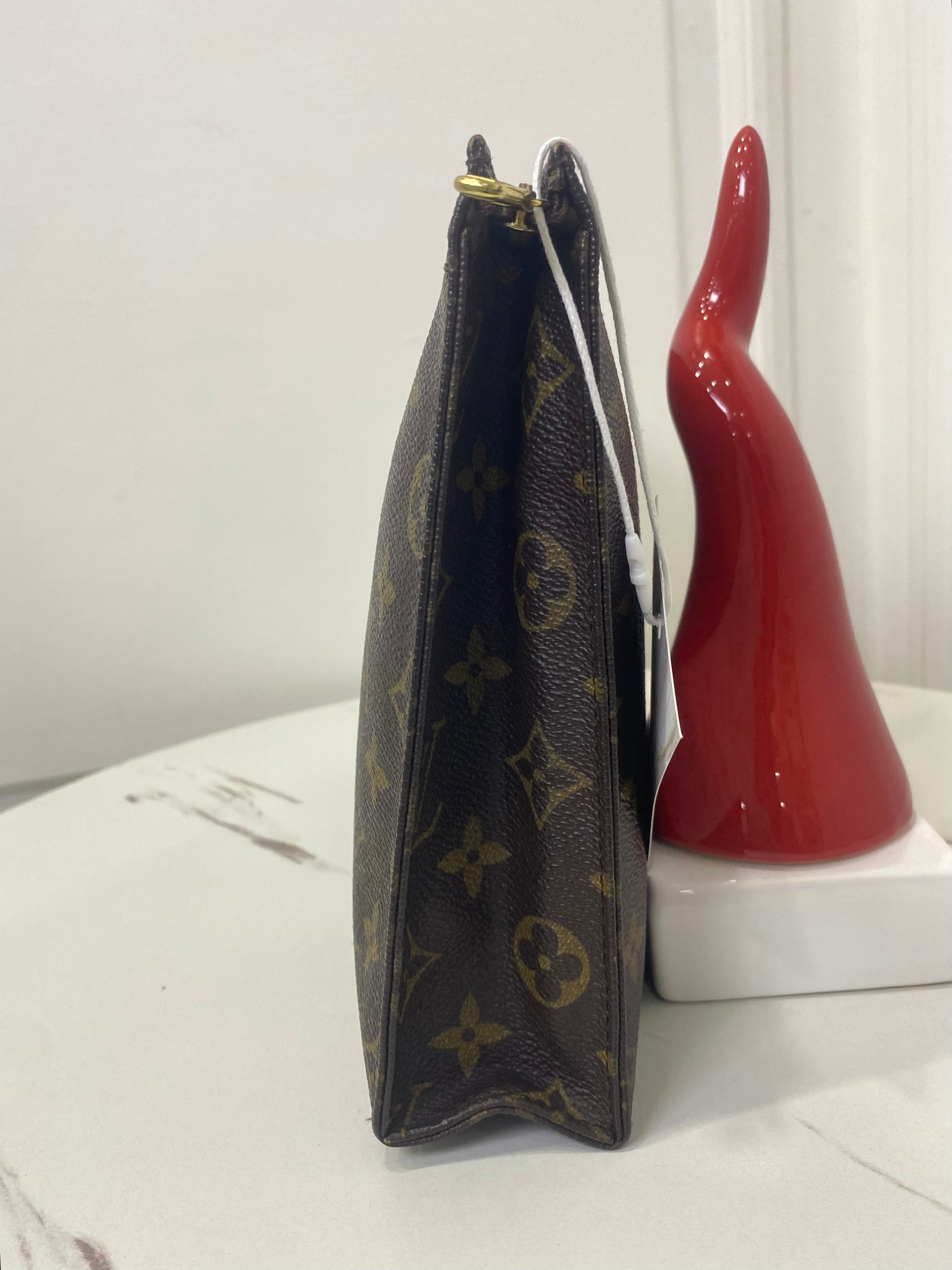 Pochette Louis Vuitton in tela Monogram, con hardware oro e dettaglio in vacchetta scurito dal usuria nel tempo.
