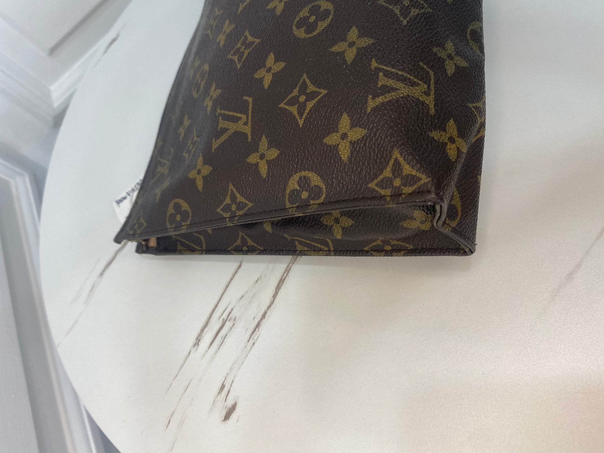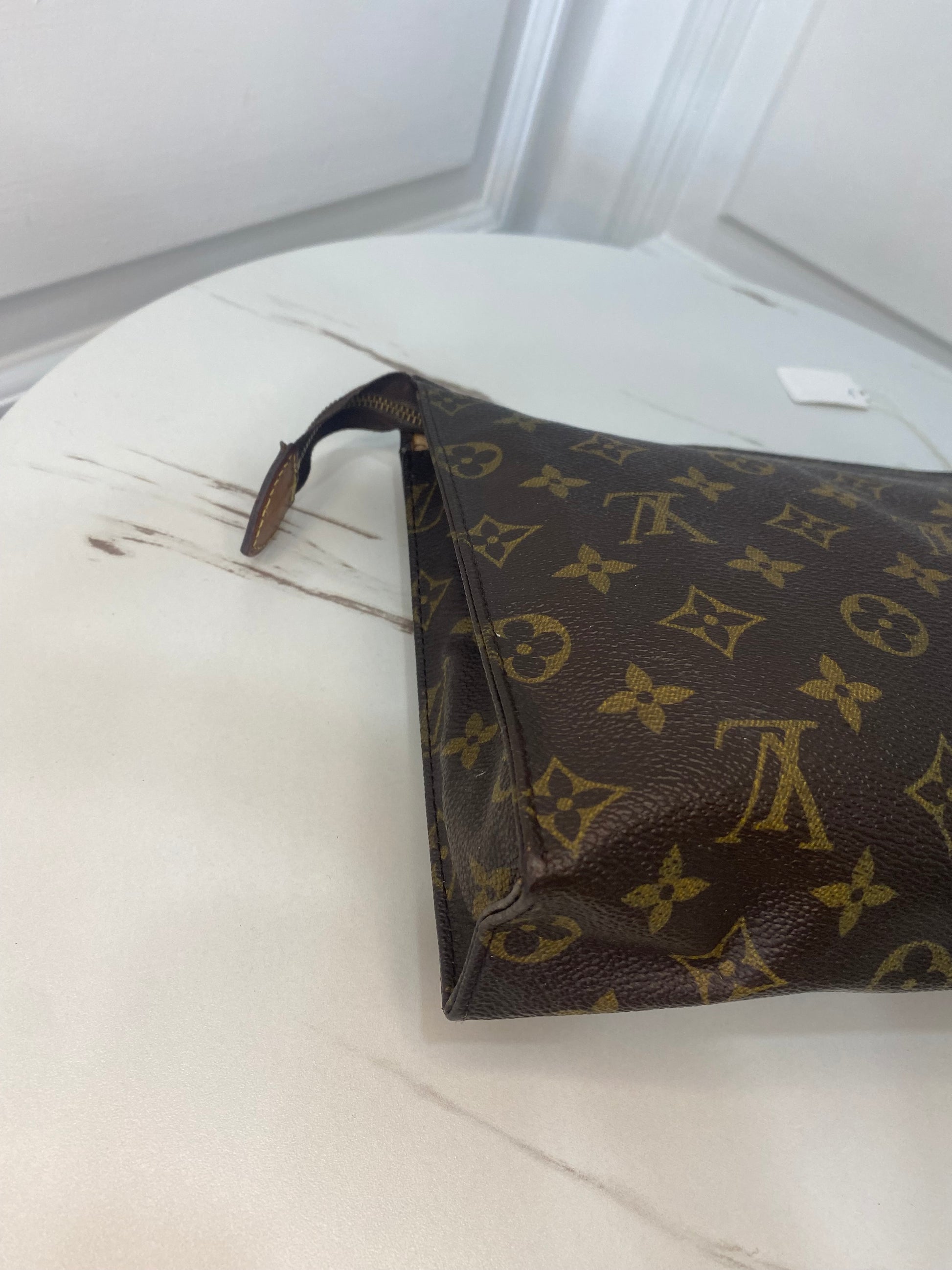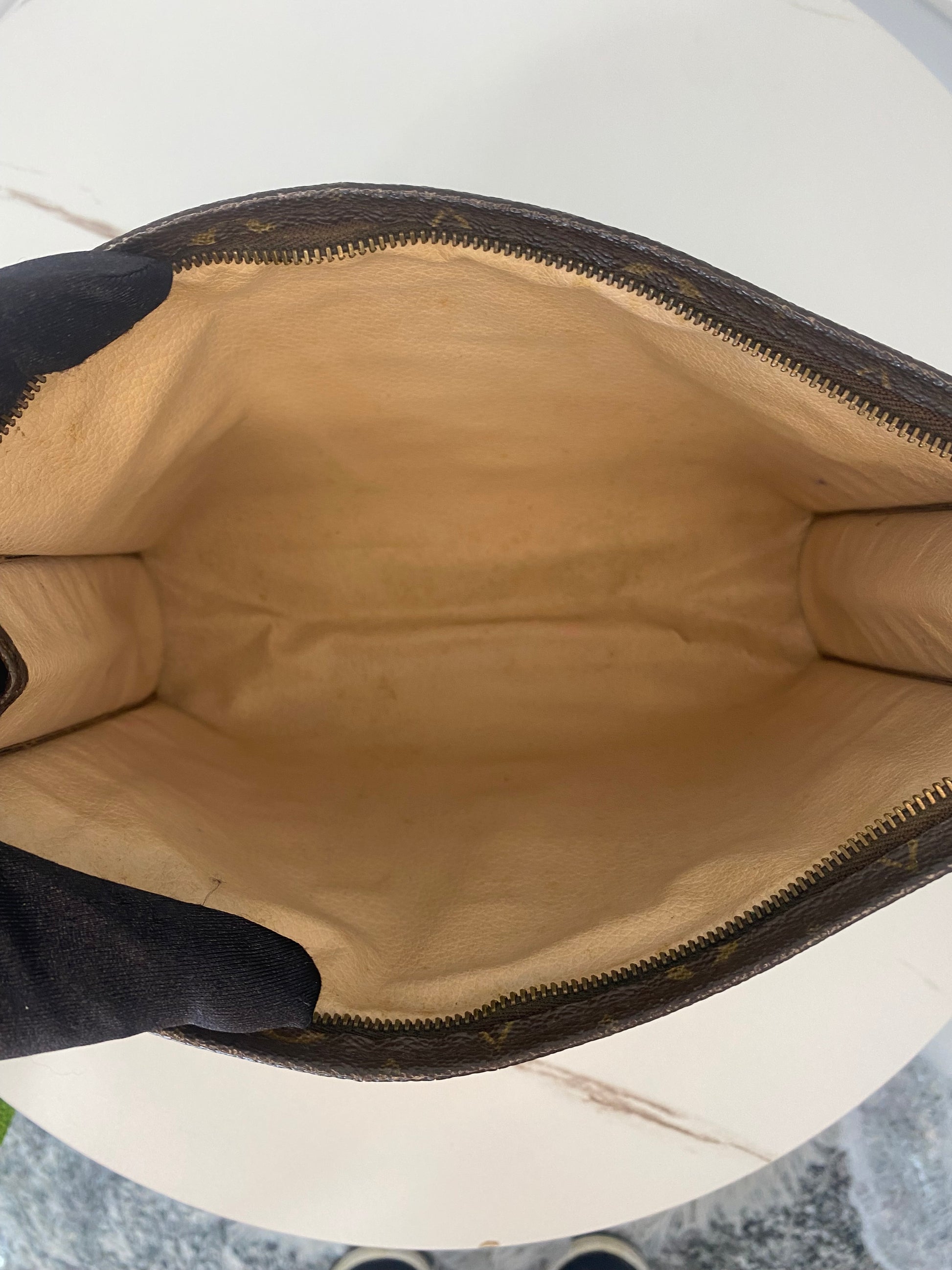 Pochette Louis Vuitton in tela Monogram, con hardware oro e dettaglio in vacchetta scurito dal usuria nel tempo.