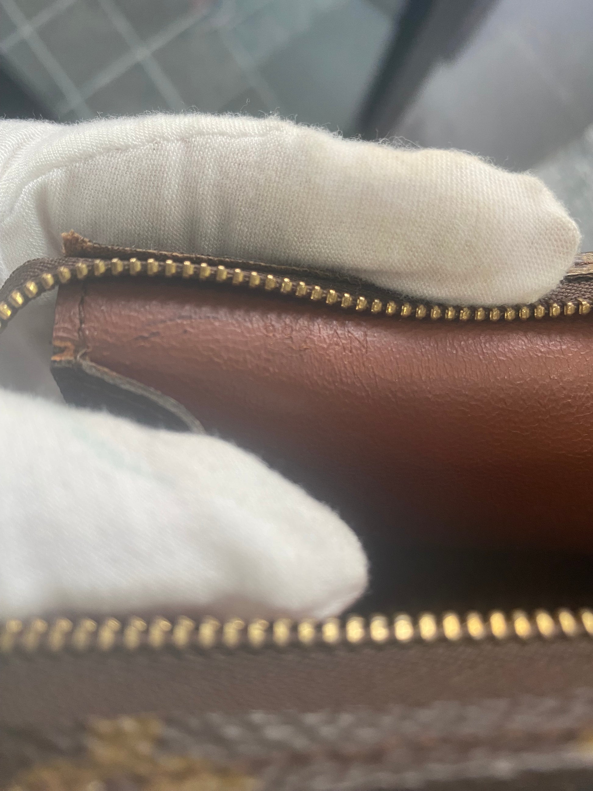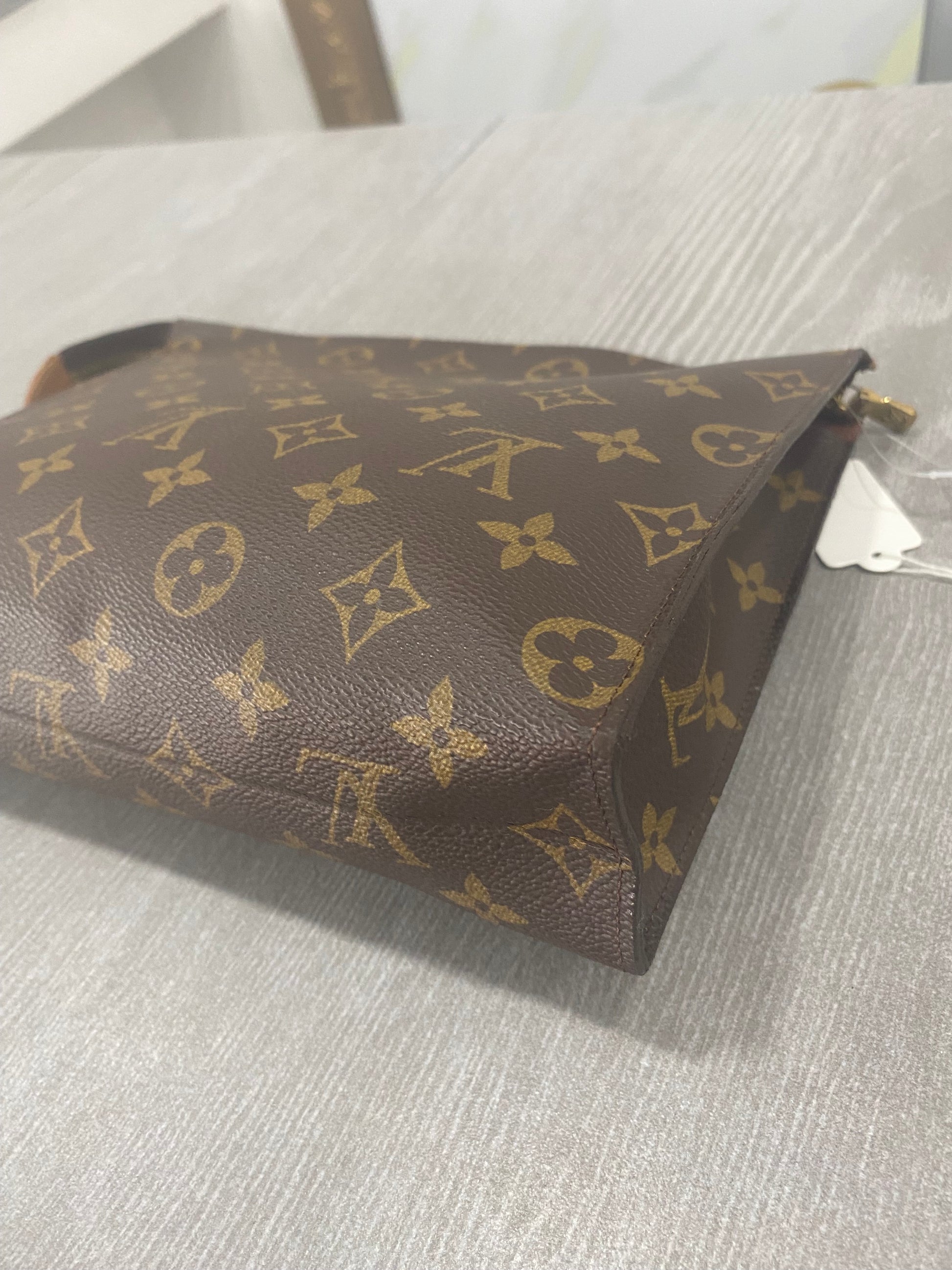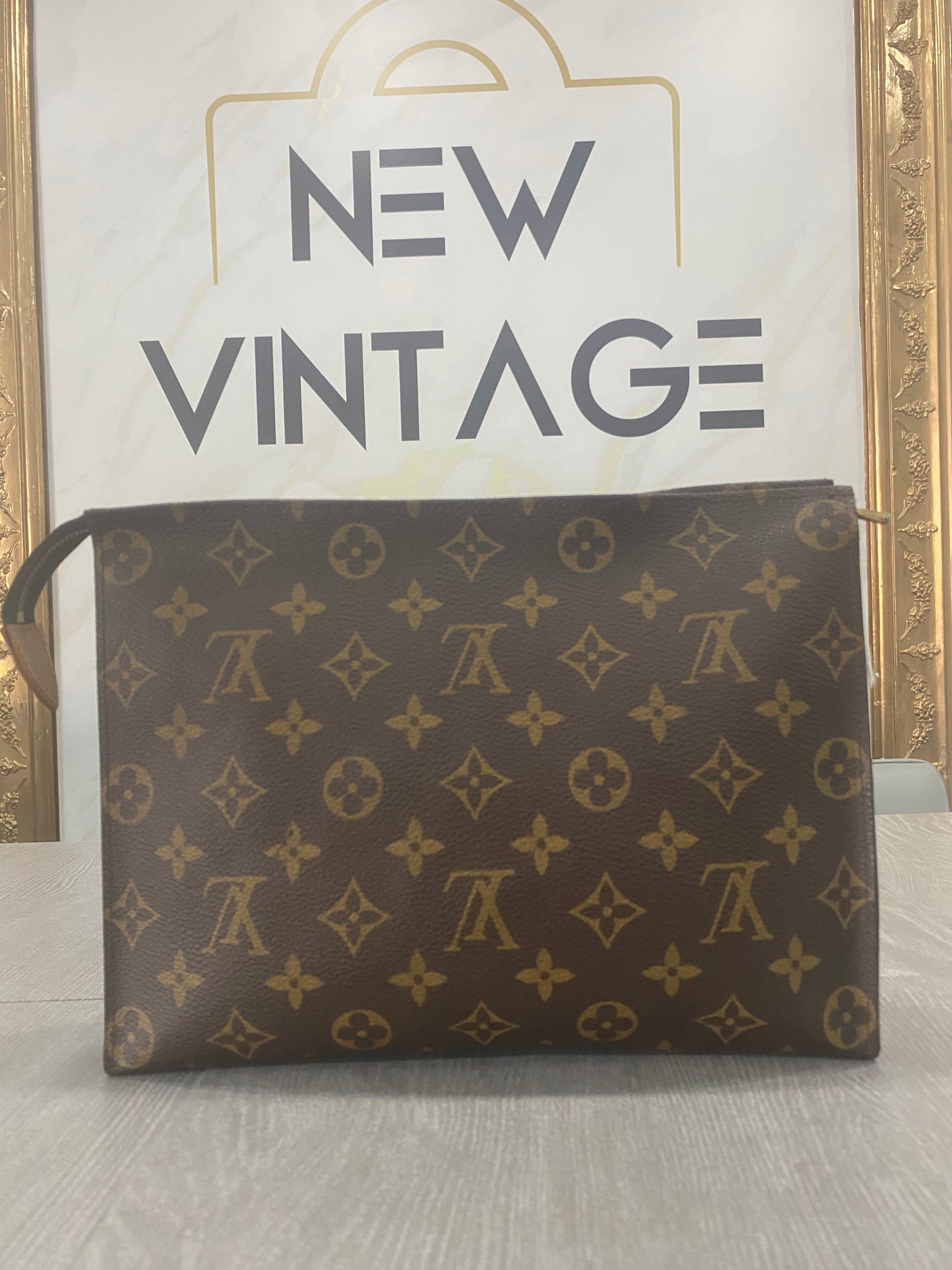 Pochette Louis Vuitton in tela Monogram, con hardware oro e dettaglio in vacchetta scurito dal usuria nel tempo.