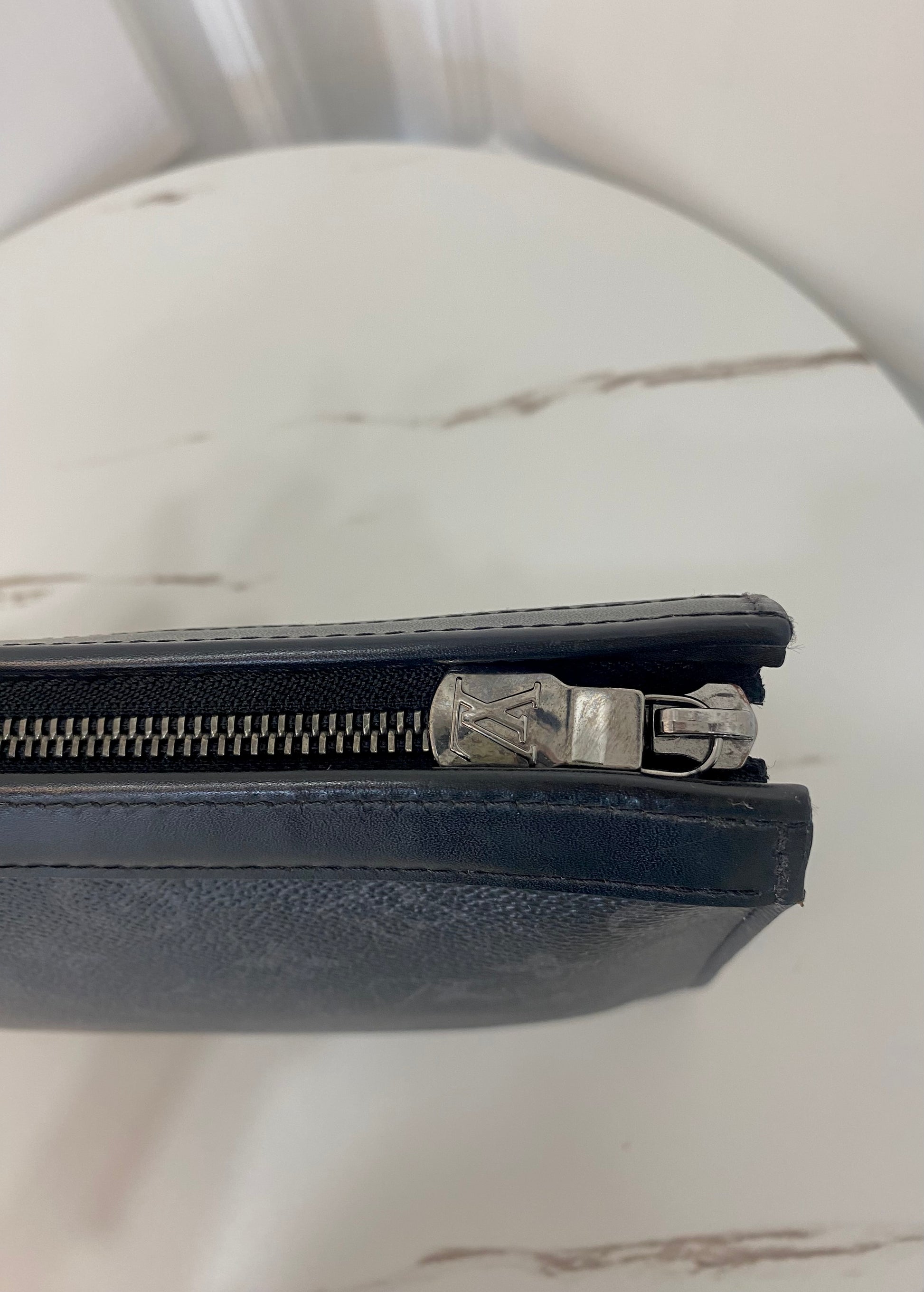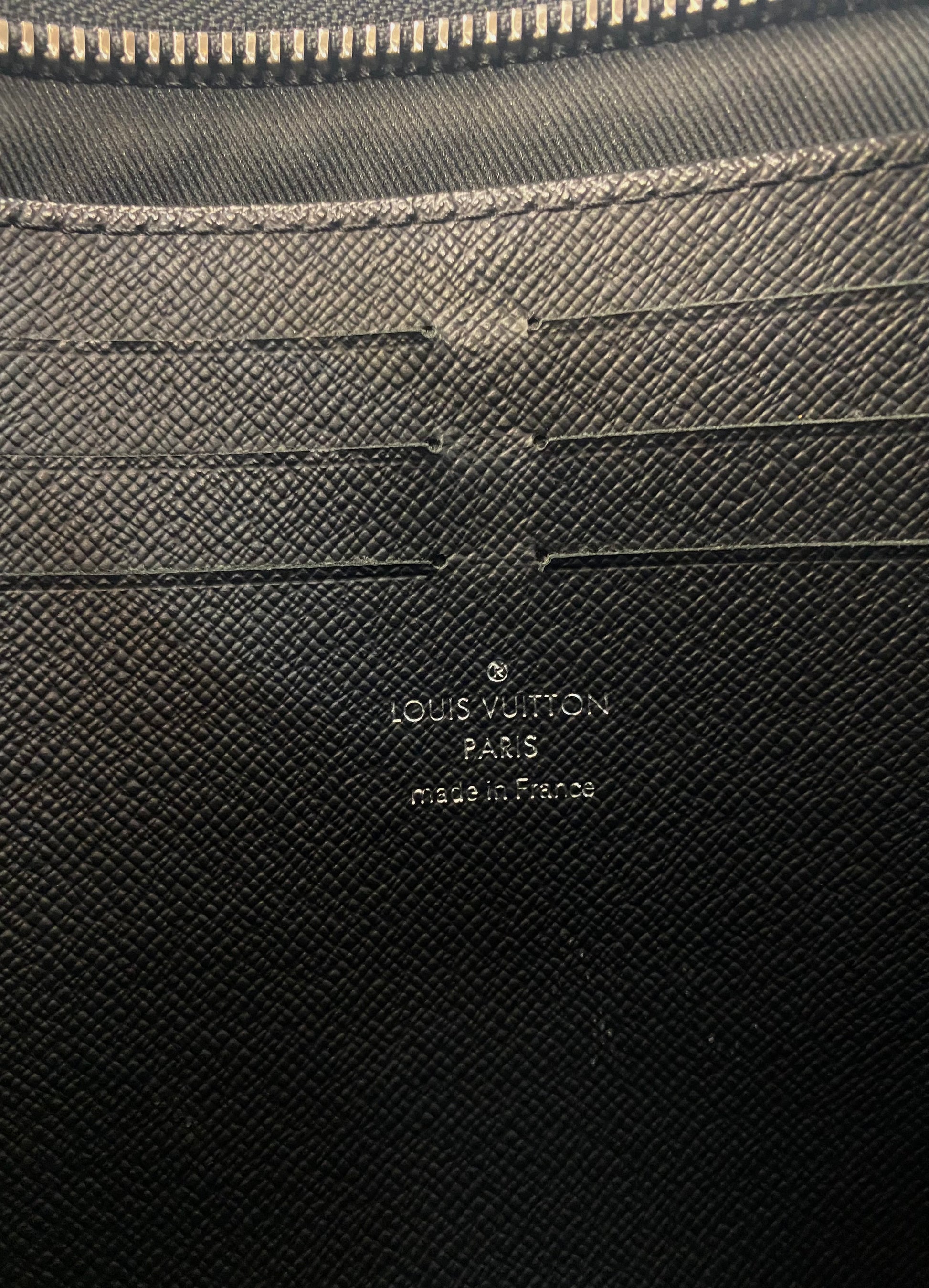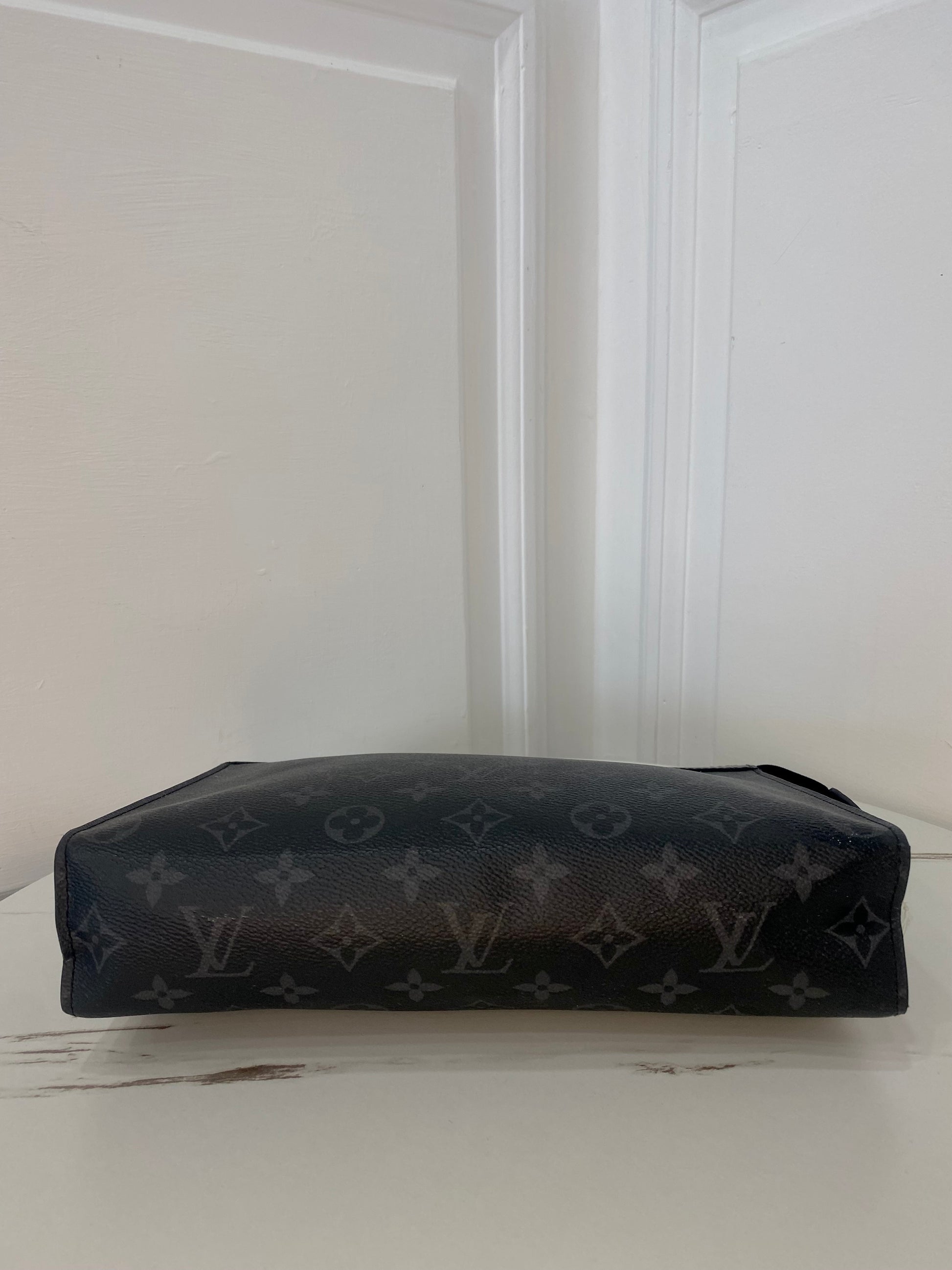 Pochette Louis Vuitton Voyage in tela Monogram LV colore nero e grigio . Con hardware argentati.
