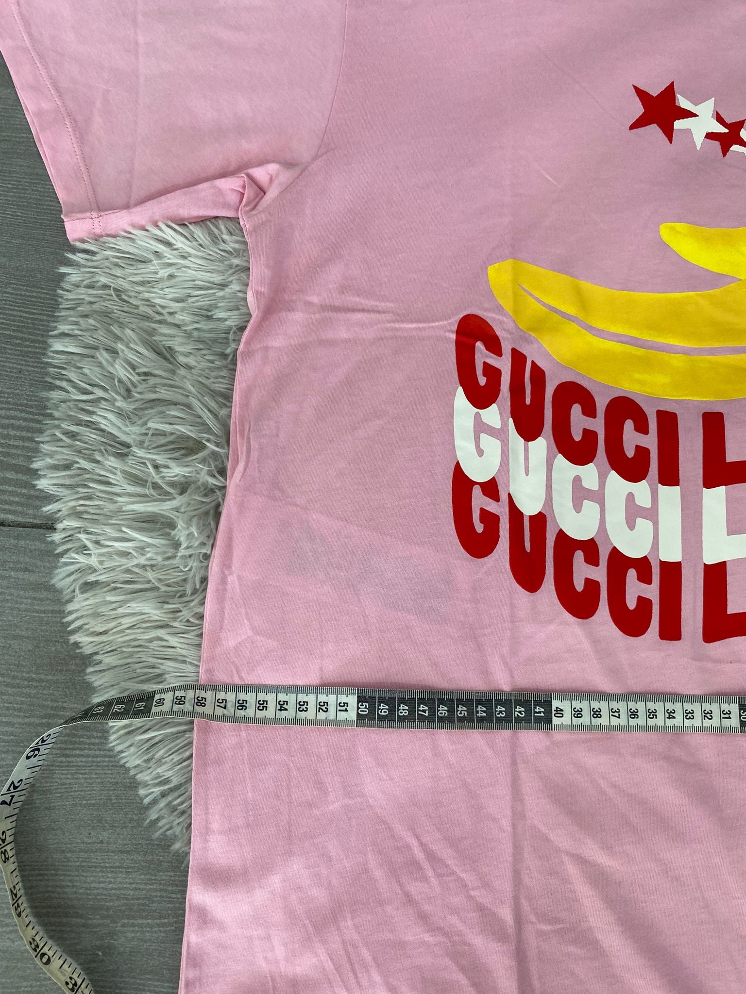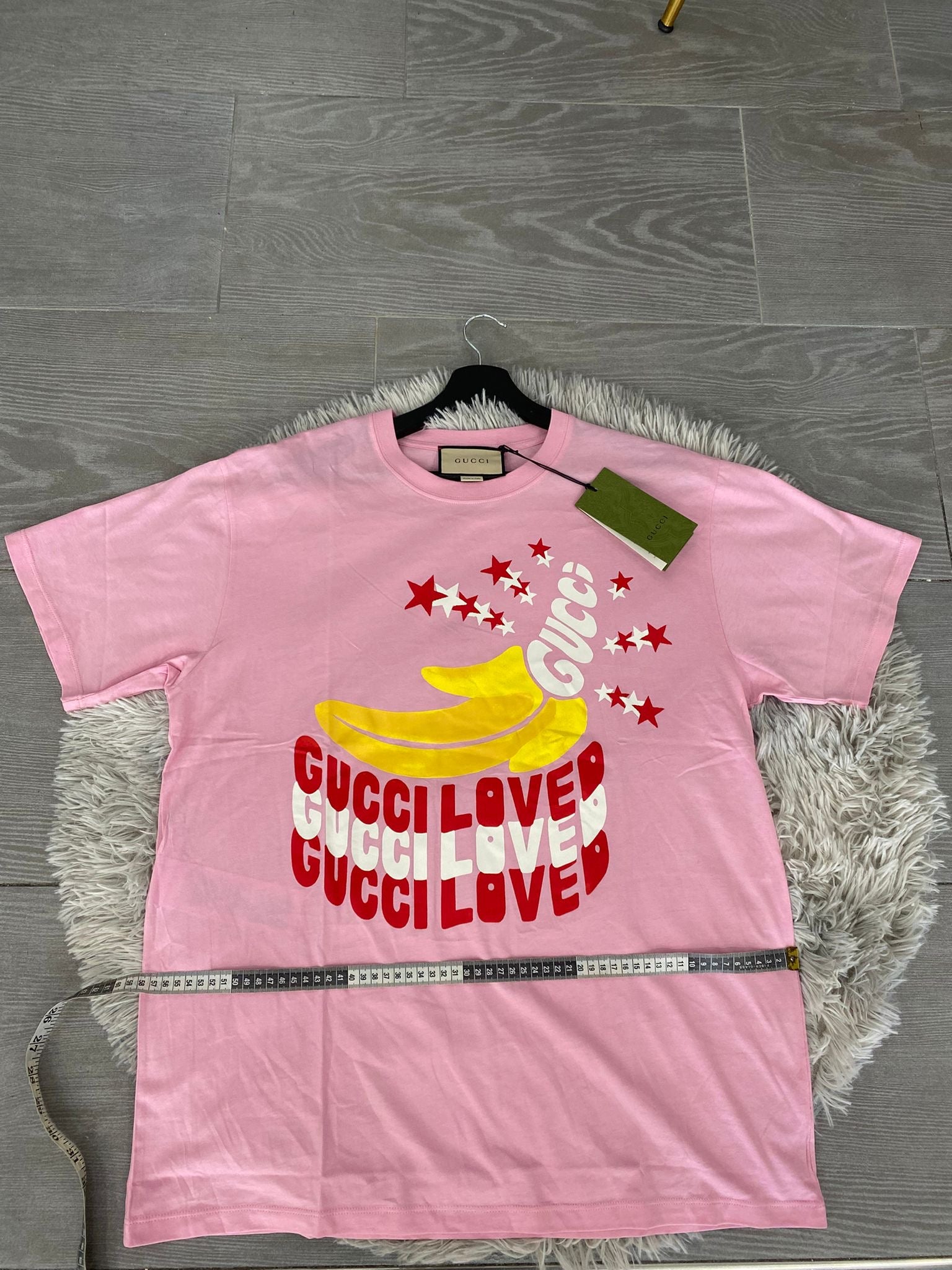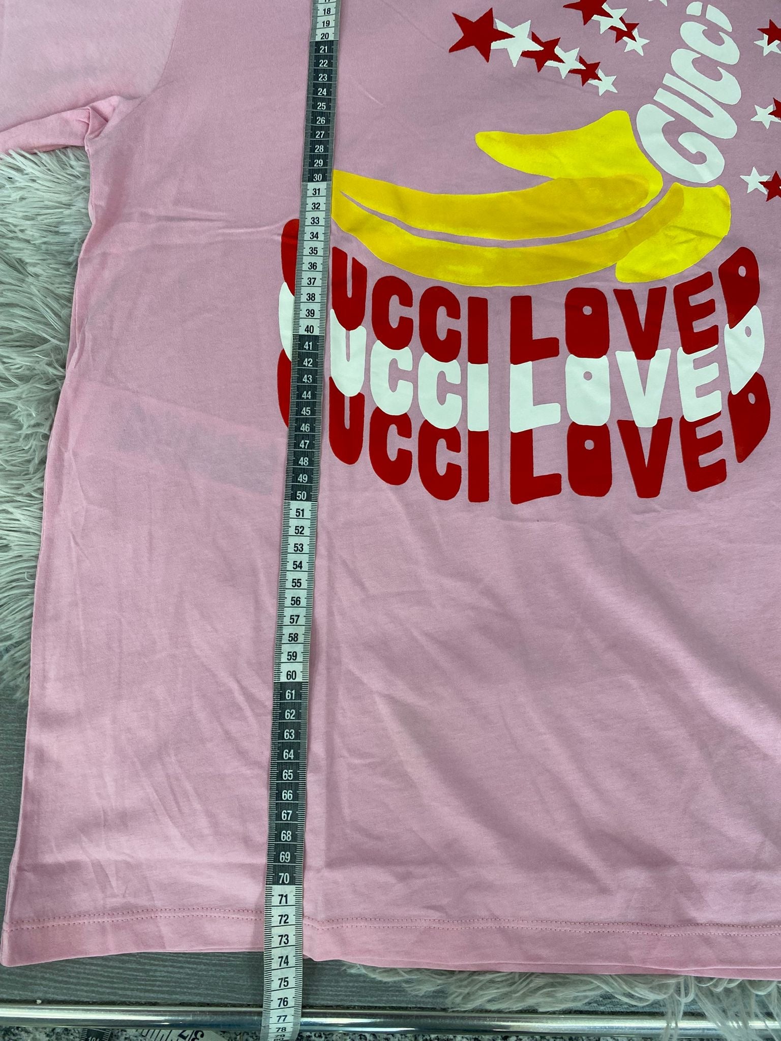 T-shirt Gucci in cotone rosa ,presenta stampa grafica frontale "Gucci Loved" con banane e stelle.