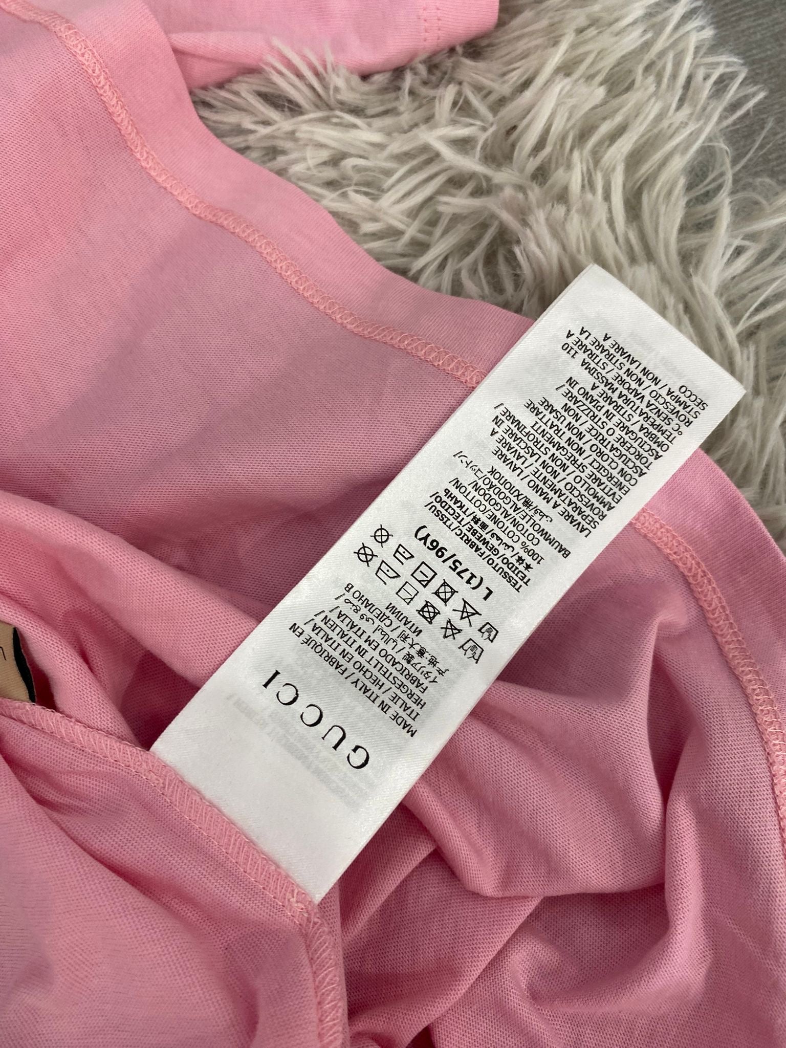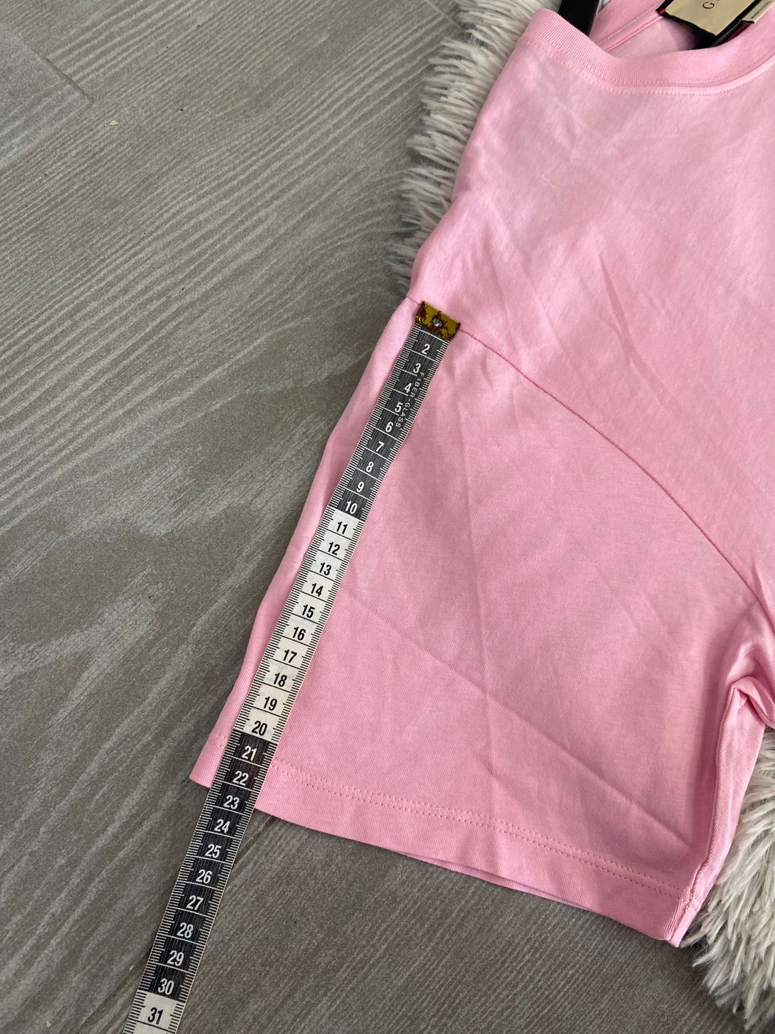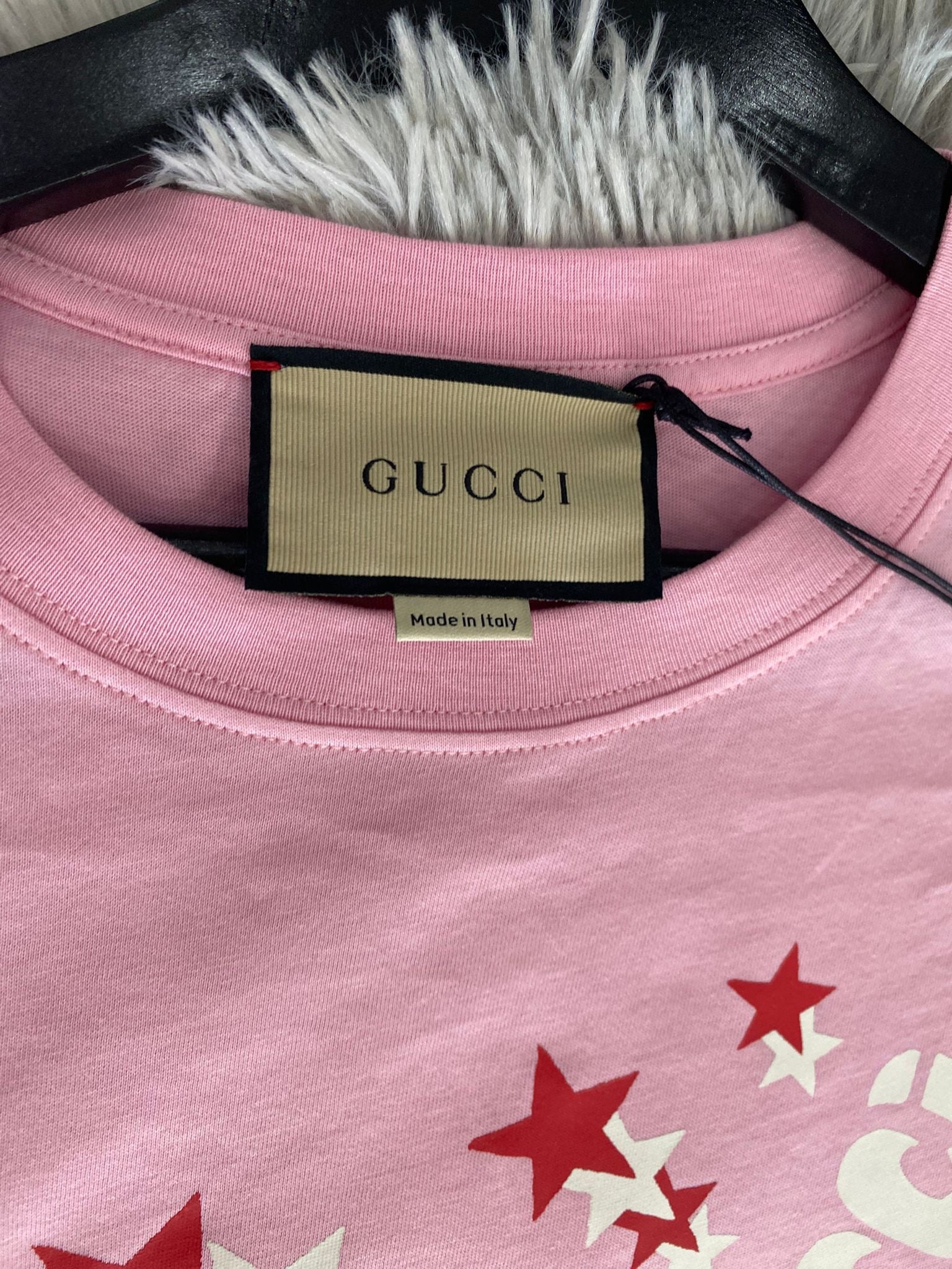 T-shirt Gucci in cotone rosa ,presenta stampa grafica frontale "Gucci Loved" con banane e stelle.