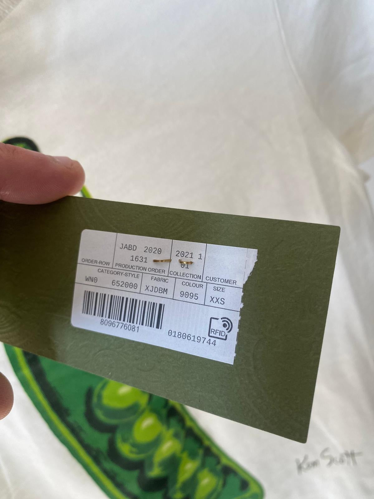 T-shirt Gucci bianca con stampa verde frontale e ricamo con logo dietro al collo.