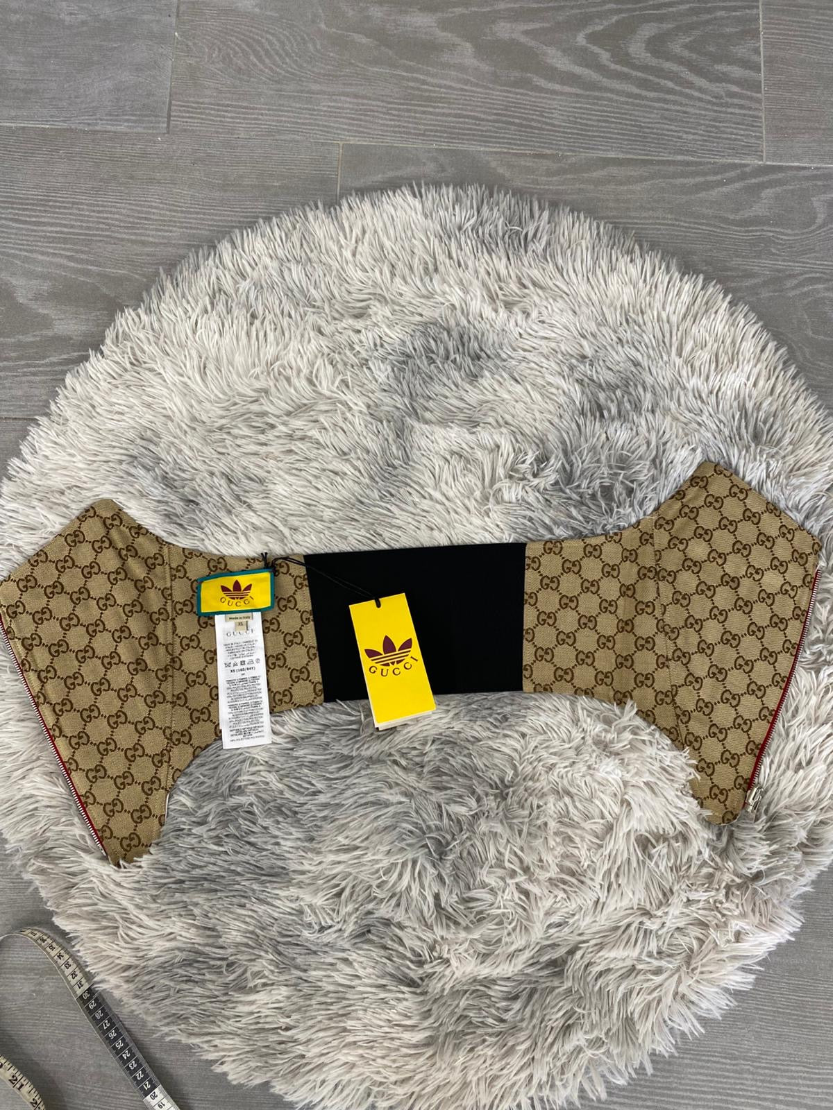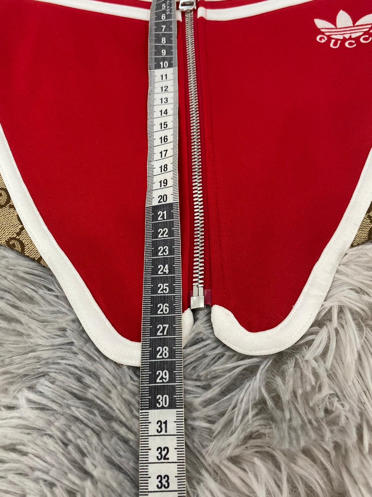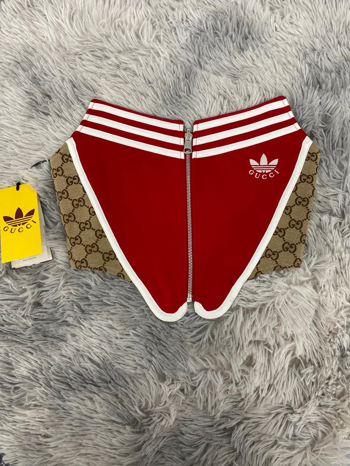 Corsetto Gucci X Adidas ,corsetto in cotone reversibile, da un lato rosso con logo frontale Gucci X Adidas, dal altro lato stampa GG Gucci beige. Presenta una chiusura lampo frontale a vista e un taglio corto.